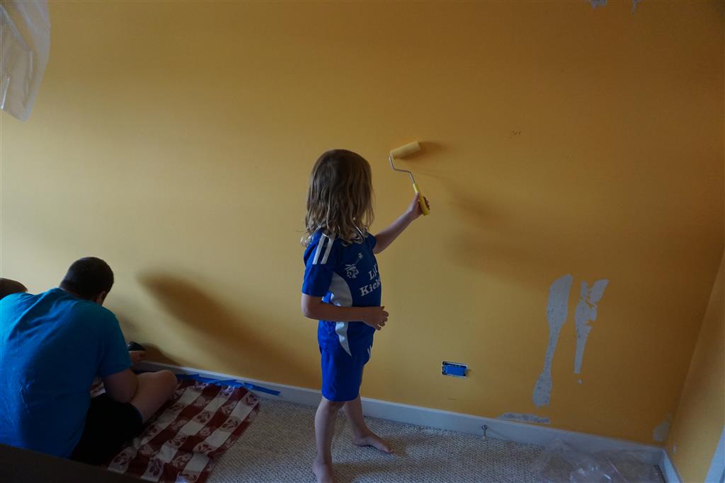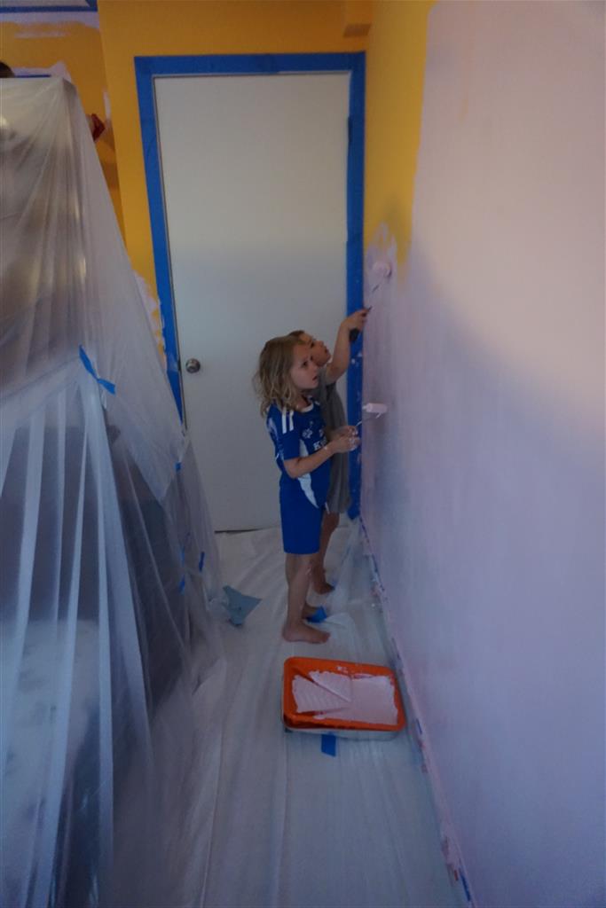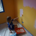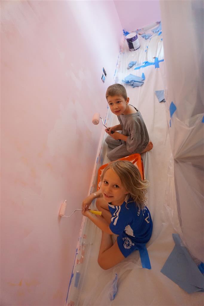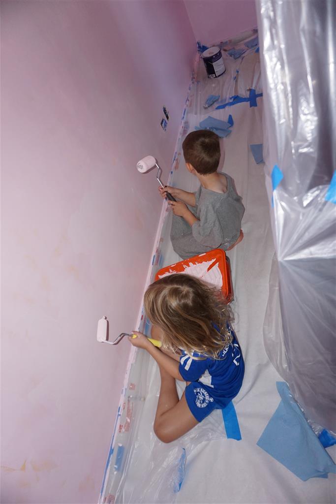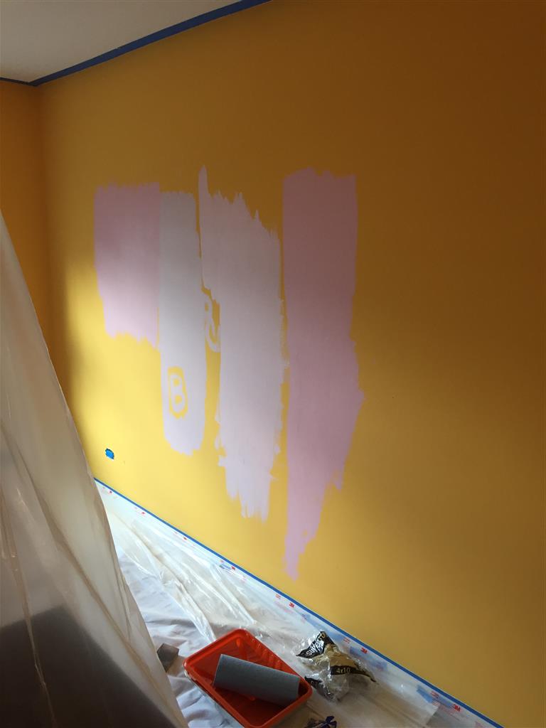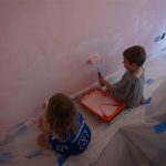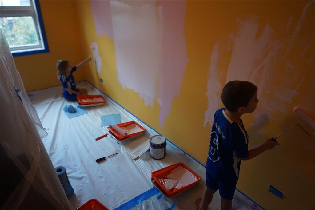 This week we finally got around to repainting Eleanor’s room. She had been asking to redecorate her room to a pink theme, and to take down the wall stickers and replace them with other things. So on Saturday we took a family trip to Home Depot and Eleanor picked out the color, and we got all the necessary supplies. We tried three different colors on the wall, and Eleanor’s original favorite was “Funny Face”, but we all agreed that “Funhouse” looked better once it was dry on the wall. It took a bit longer than expected to get everything ready, but finally after dinner Eleanor and Henry were able to start painting on the walls. They ended up loving it, and we painted together for about 90 minutes, during which they did the lower half of three walls. On Sunday we finished up the last wall and some edges – we’ll let it dry and then she should be back in her room on Monday :)