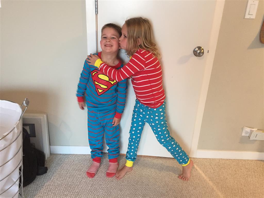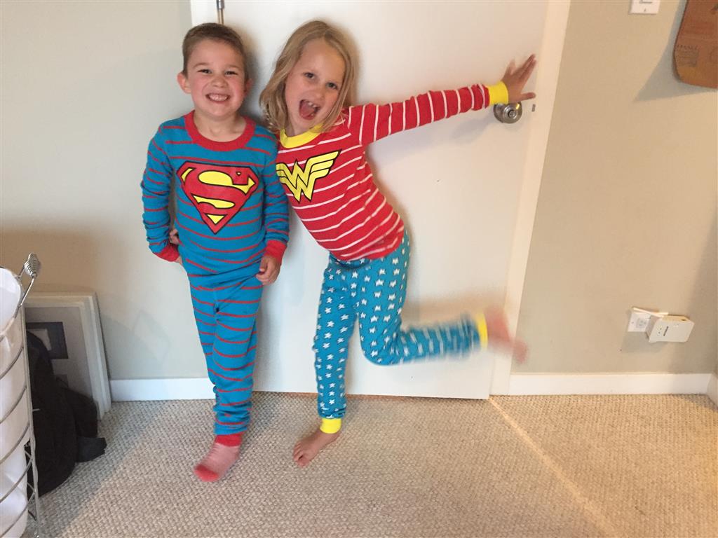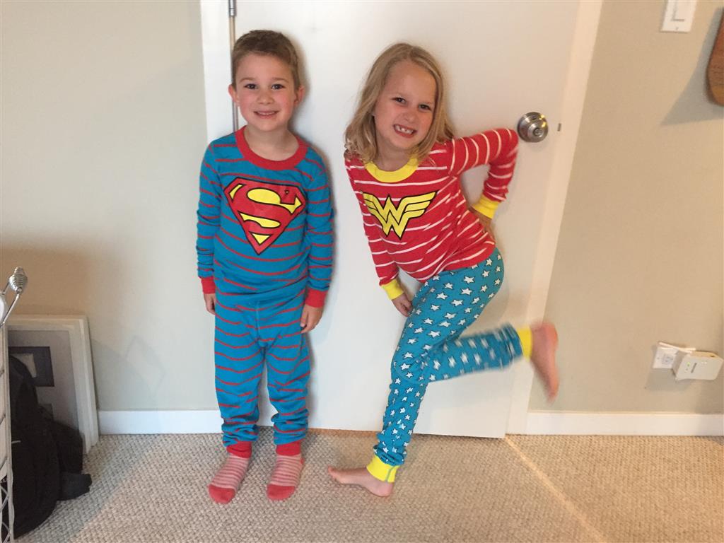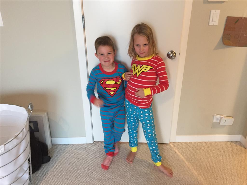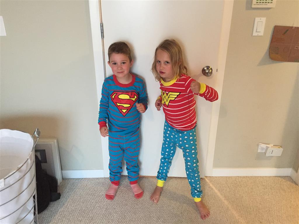 Earlier in the week Mom and the kids had a fun visit to the Museum of Science and Industry, and got another look and the new Lego exhibit. Eleanor and Henry also picked out and wore some matching super hero PJs – which reminded me of the “Underoos” of my childhood. They were both pretty excited, and did some great poses with their “Super Hero Faces” on.