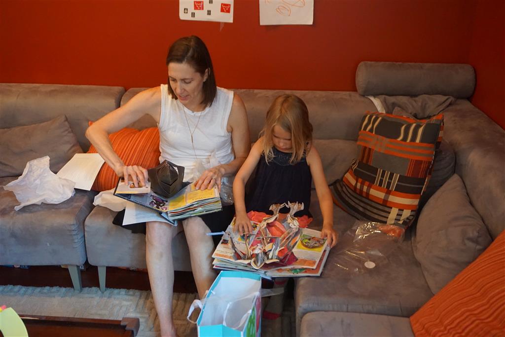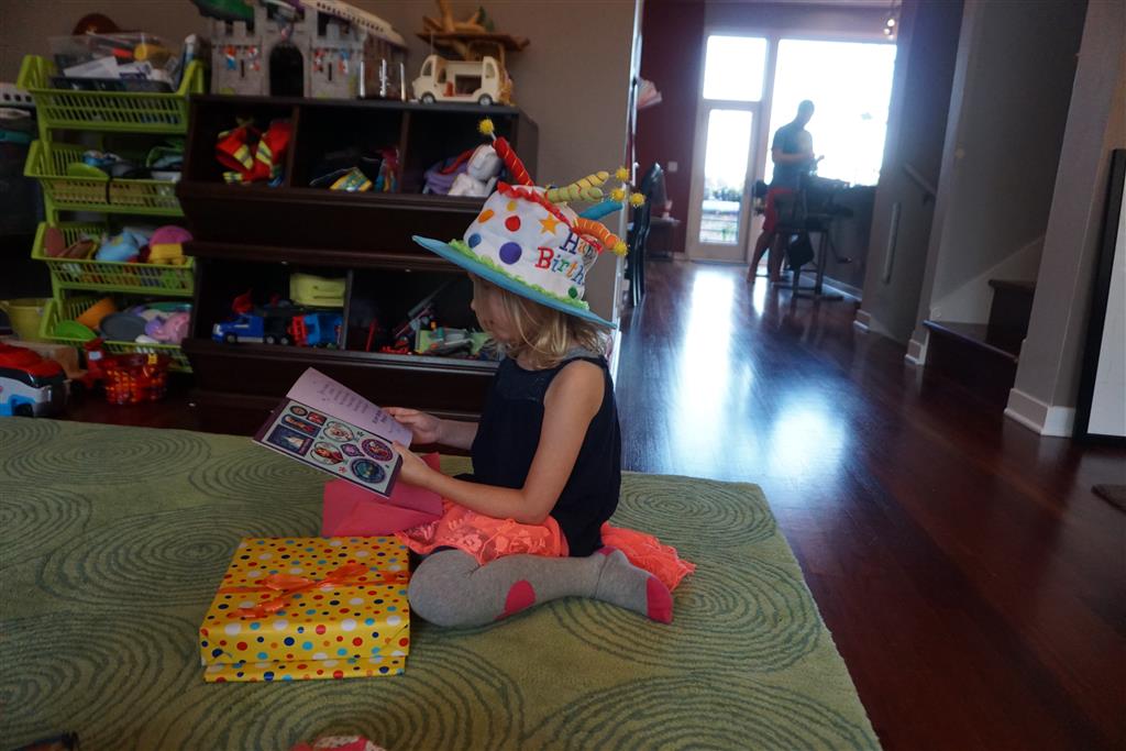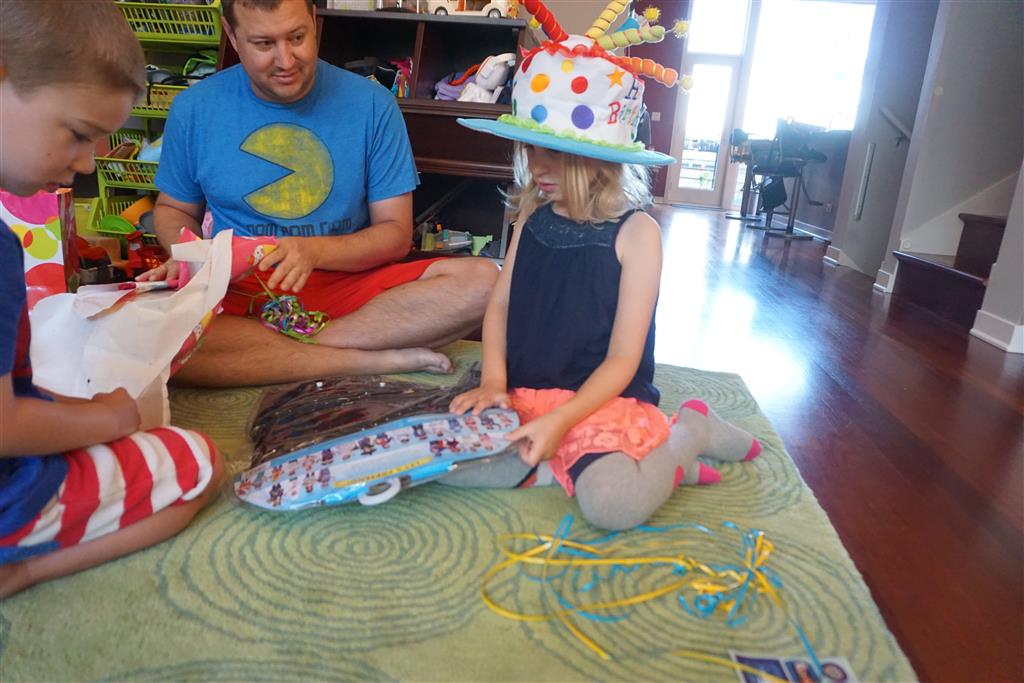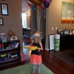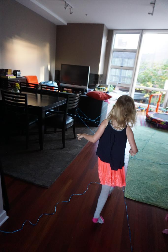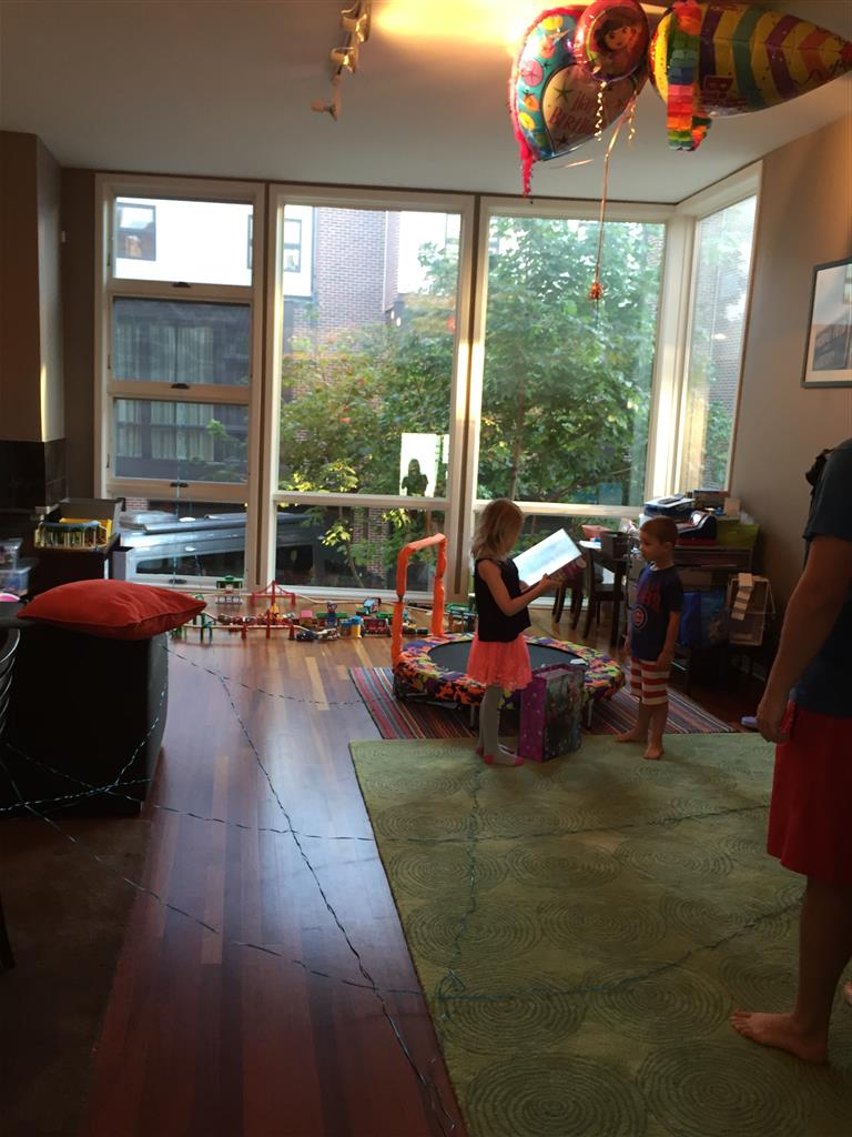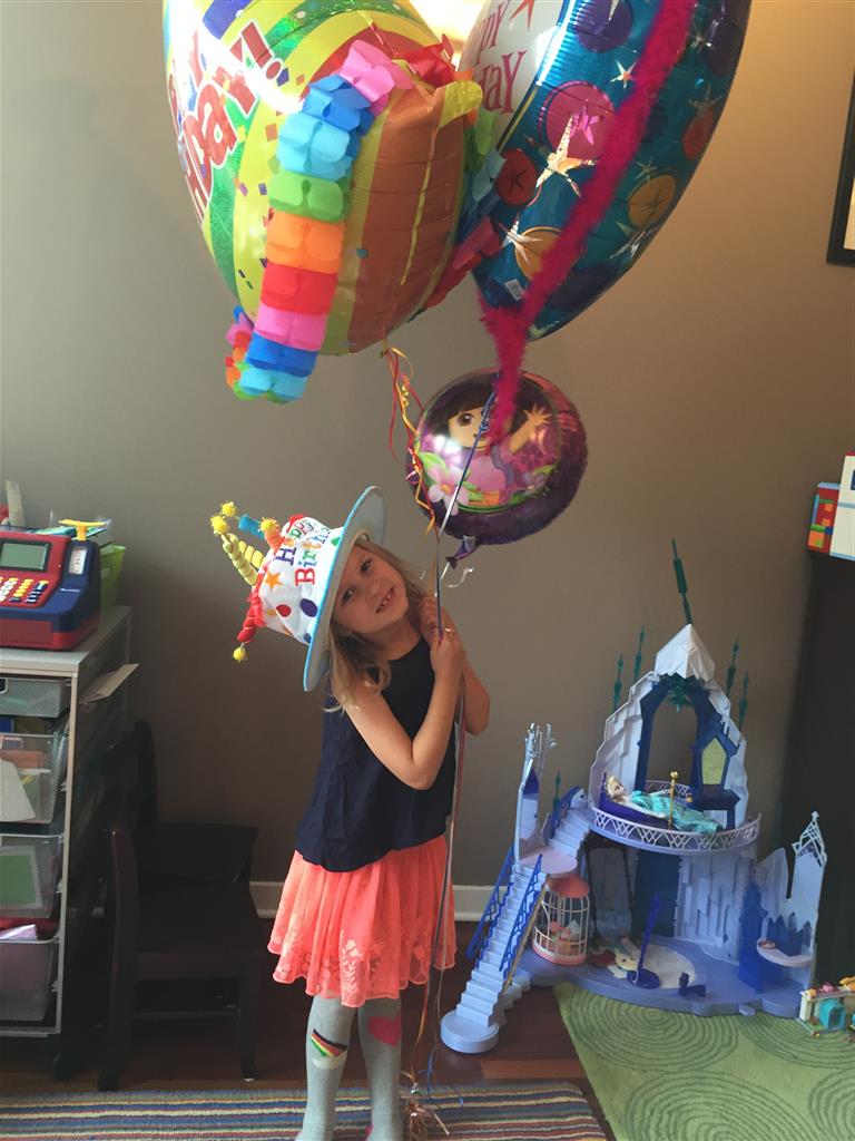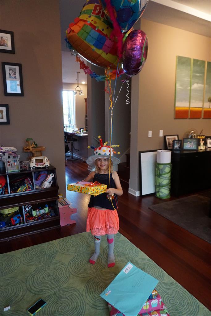 Eleanor was excited to celebrate her sixth birthday this week. She had been considering plans for a while, and had plans for all three meals of the day, as well as activities throughout the day and sleeping arrangements for the night before and night of. We started festivities with a slumber party with Mom on the night before. Eleanor awoke to the string trail ready to do – and after waiting a bit for Mom and Dad to get around, we followed the string downstairs and opened up presents along the way. Then, it was off to Whole Foods for breakfast with Lala, and then back home for more playtime with new toys. Eleanor had a lunch spot picked out, but decided to just have lunch at home so that we could have more playtime. Lala and Uncle B joined us later that afternoon for birthday cupcakes. Dinner was mac and cheese at home, and then off to bed. Eleanor and Dad had a slumber party, and Mom and Henry had one as well. All in all a successful birthday!