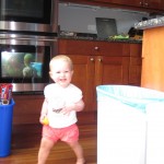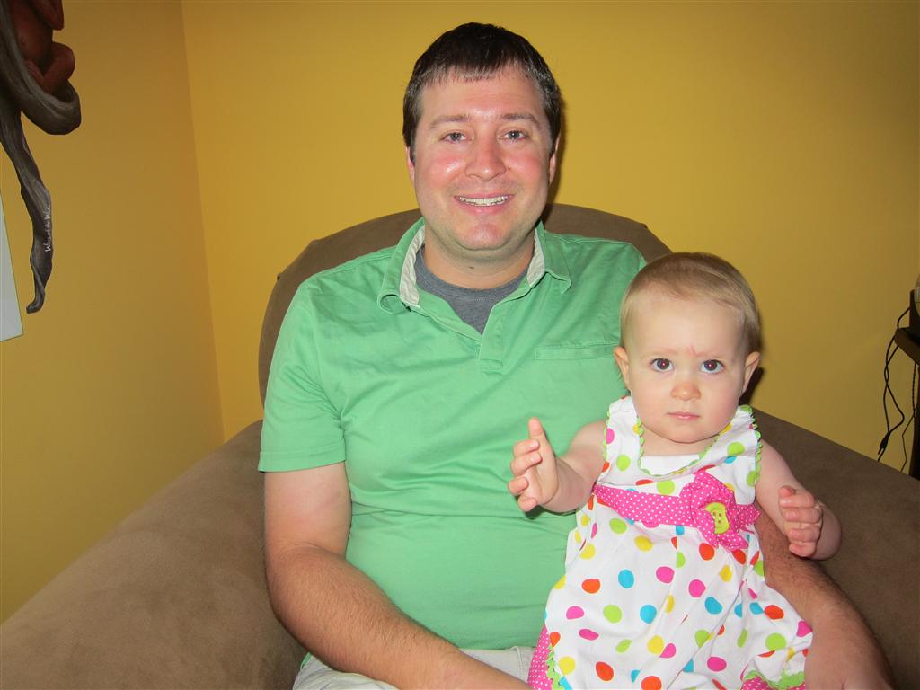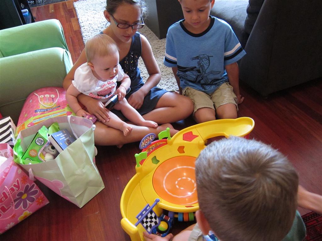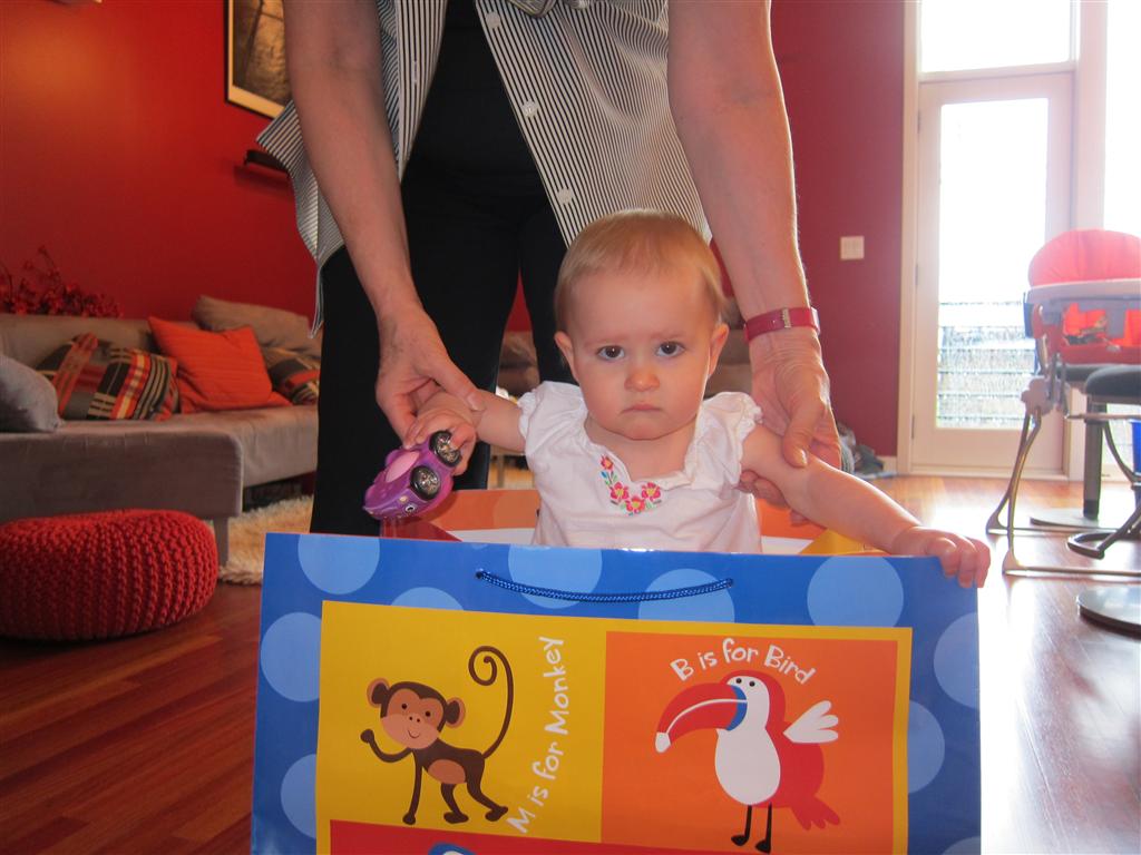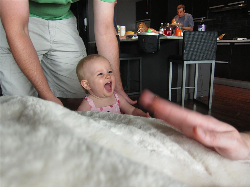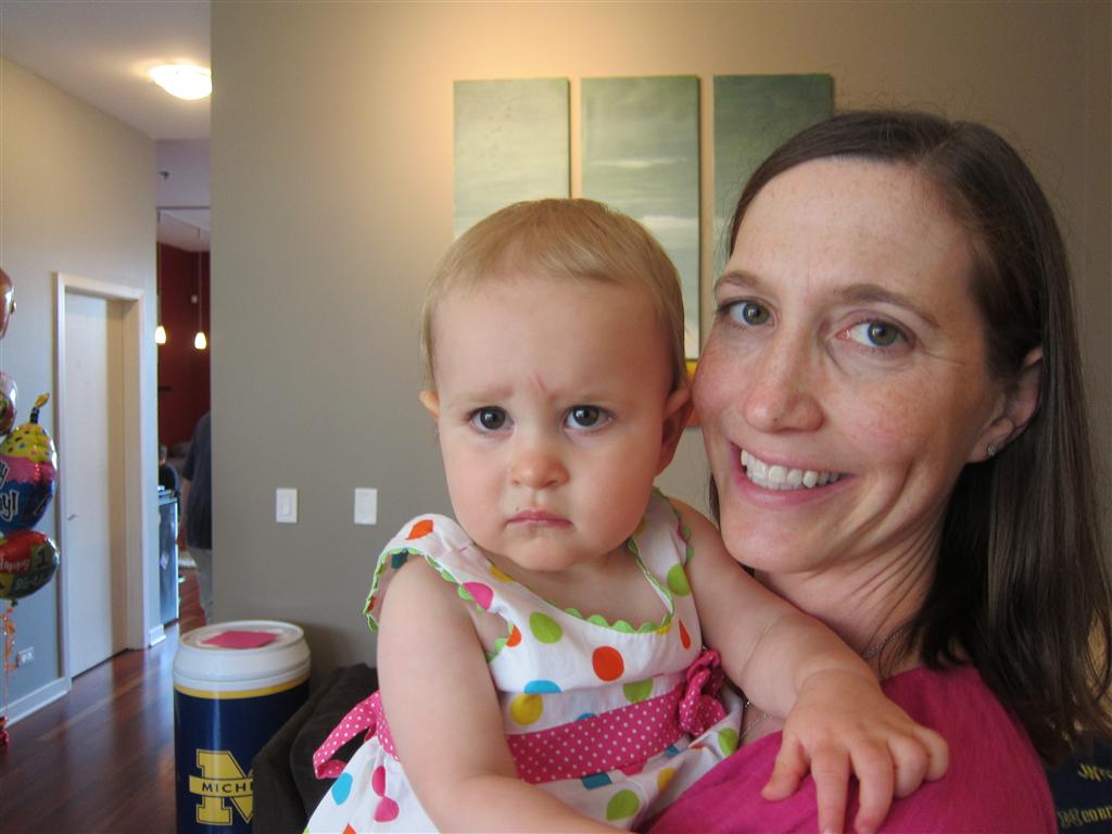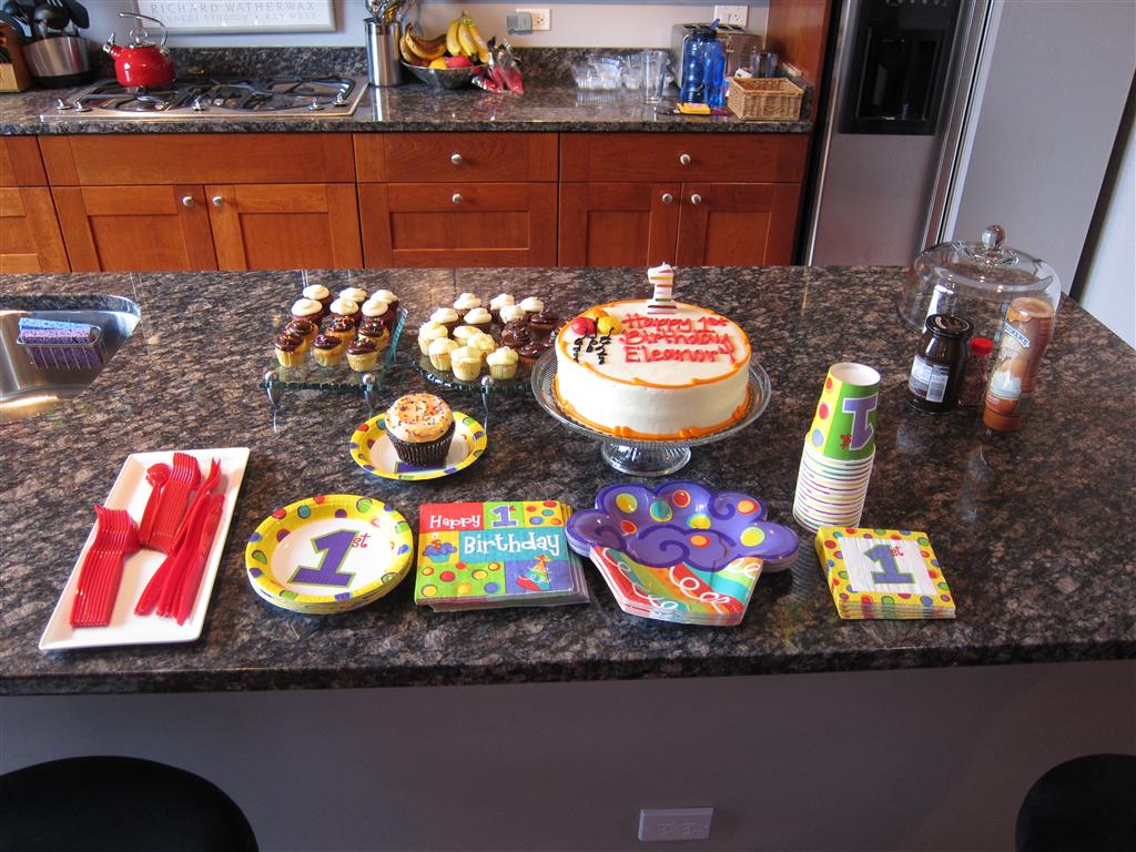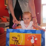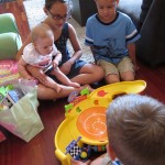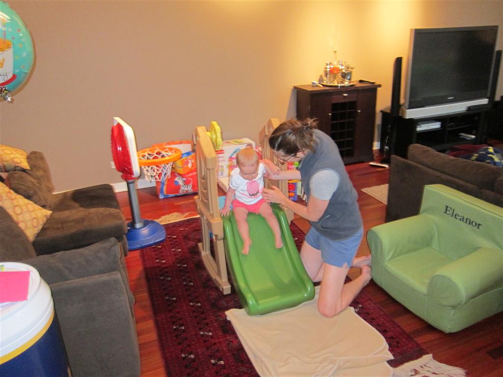 Eleanor had lots of visitors this week to help her celebrate her first birthday!  A great big thanks to everyone who helped make it a special occasion.  The big day started with our monthly family photo shoot, unfortunately Eleanor had taken a spill earlier, so she had a big scrape on her forehead :(  We didn’t get as many smiles as we had hoped during the photo shoot, but there were plenty of smiles to come.  Next, we headed over to Uncle B’s for some lunch and fun on the giant bean bag.  Eleanor isn’t quite old enough to play putt putt yet, but she did attempt to stuff a golf ball in her mouth.  After lunch and an unsuccessful attempt at an afternoon nap, it was time for cake and singing.  We actually forgot to sing as the cake came out – but that didn’t stop Eleanor from digging in.  The orange icing was a big hit – not as much for the chocolate cake.  She got her way through most of the icing, gave a few bites to Mom and Dad, and then we figured that was enought sugar.  After cake we opened presents – Eleanor didn’t participate too much in the unwrapping, but Mackenzie Jack and Ben stepped up with some much needed help.  The basketball hoop and bath boat were immediate favorites, but I’m sure there will be lots more favorites once we get everything unboxed.  Amazingly, after all that icing and excitement, Eleanor still managed to have a pretty good dinner, and even went to bed at a reasonable hour.