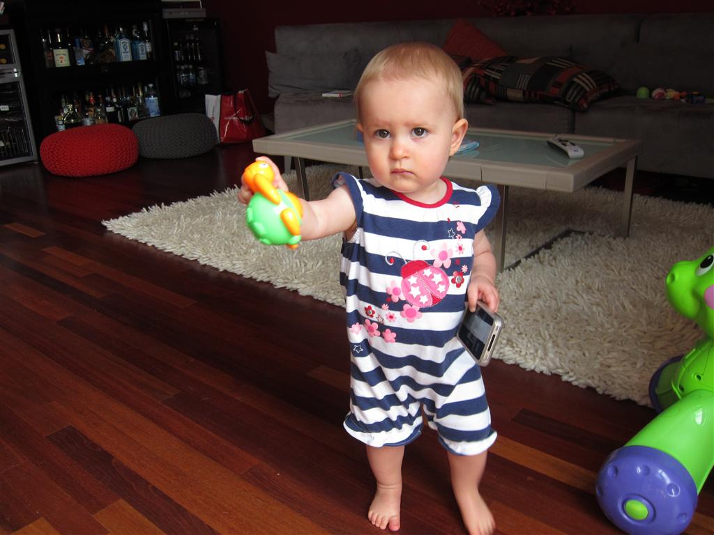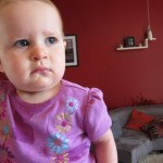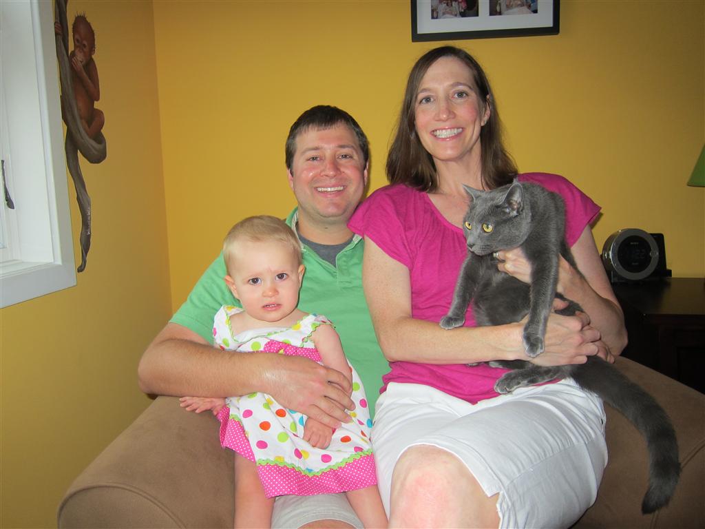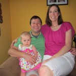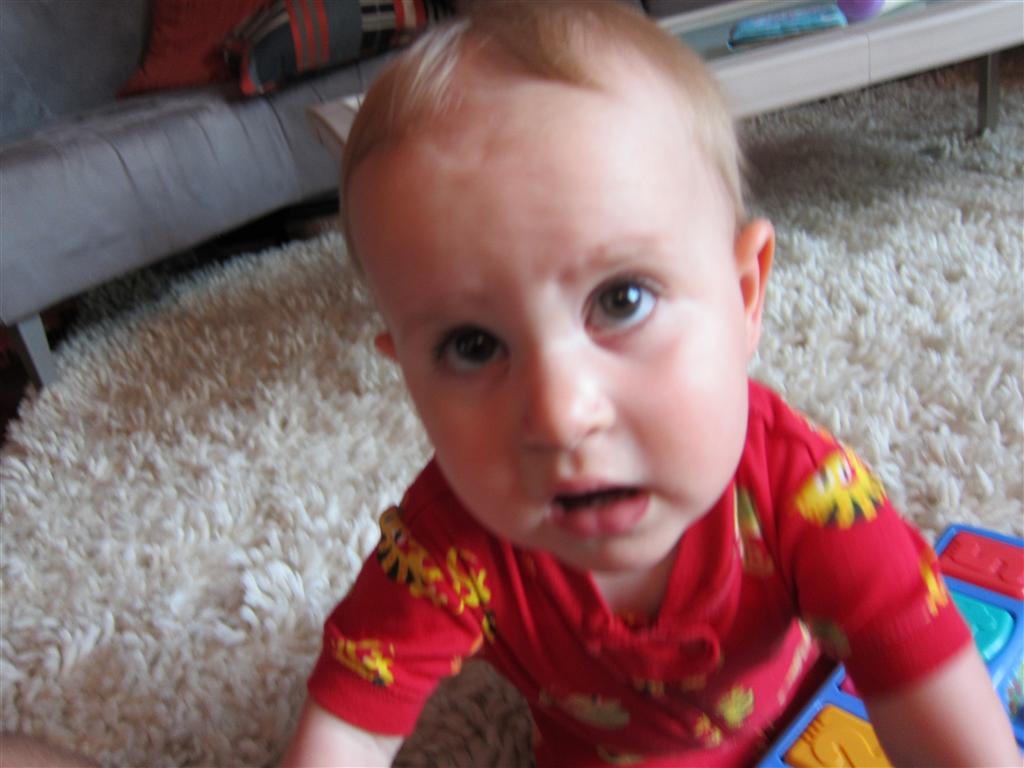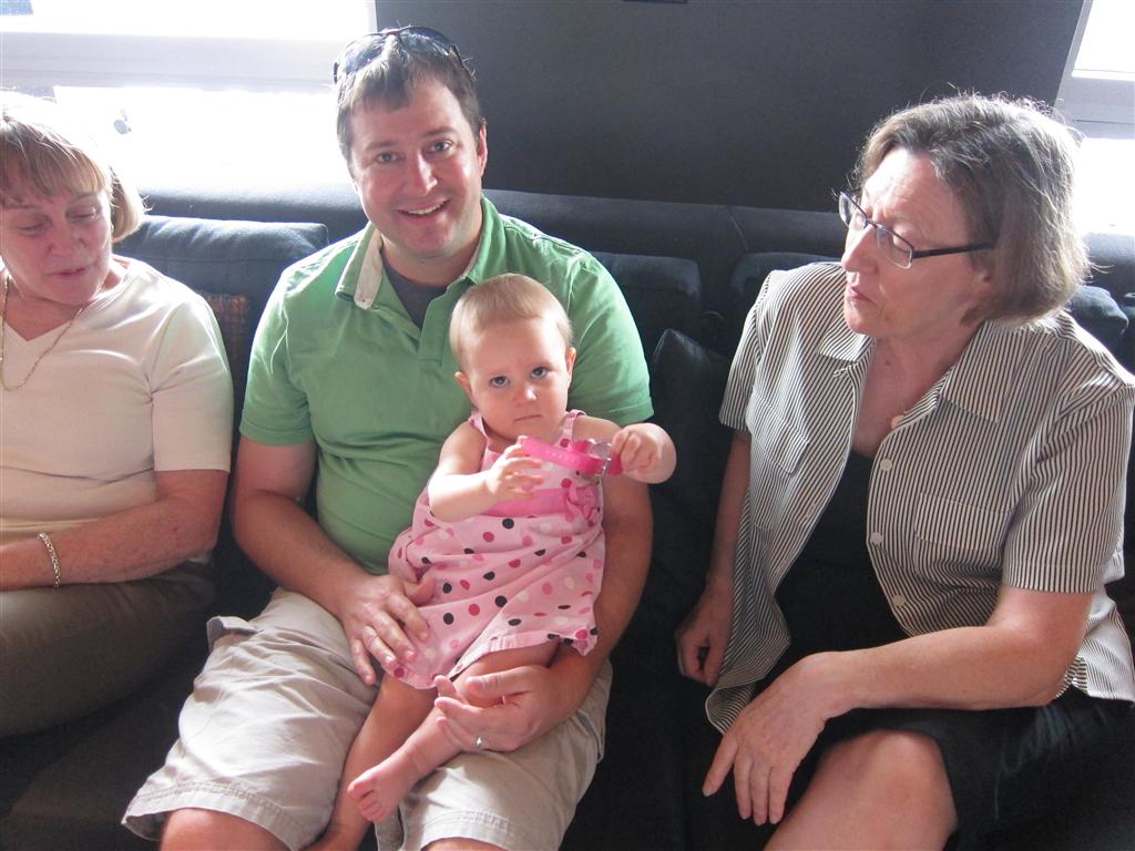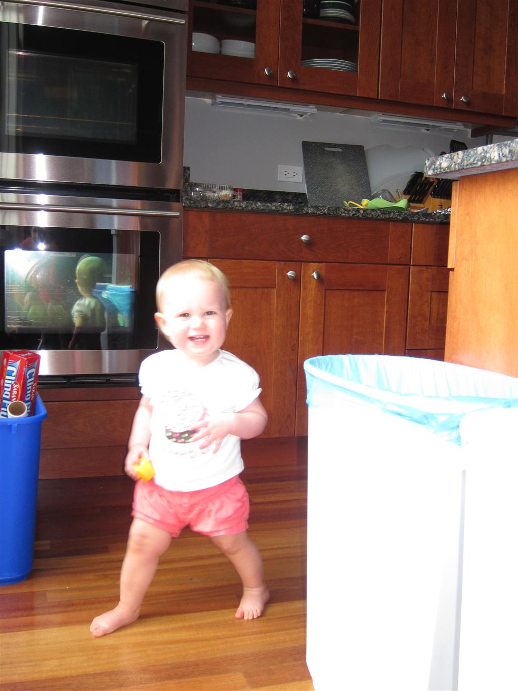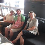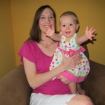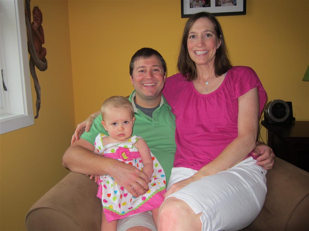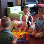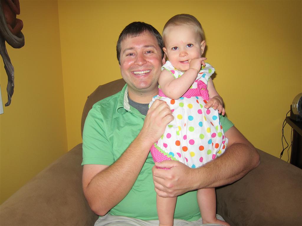Eleanor had lots of visitors this week to help her celebrate her first birthday!  A great big thanks to everyone who helped make it a special occasion.  The big day started with our monthly family photo shoot, unfortunately Eleanor had taken a spill earlier, so she had a big scrape on her forehead :(  We didn’t get as many smiles as we had hoped during the photo shoot, but there were plenty of smiles to come.  Next, we headed over to Uncle B’s for some lunch and fun on the giant bean bag.  Eleanor isn’t quite old enough to play putt putt yet, but she did attempt to stuff a golf ball in her mouth.  After lunch and an unsuccessful attempt at an afternoon nap, it was time for cake and singing.  We actually forgot to sing as the cake came out – but that didn’t stop Eleanor from digging in.  The orange icing was a big hit – not as much for the chocolate cake.  She got her way through most of the icing, gave a few bites to Mom and Dad, and then we figured that was enought sugar.  After cake we opened presents – Eleanor didn’t participate too much in the unwrapping, but Mackenzie Jack and Ben stepped up with some much needed help.  The basketball hoop and bath boat were immediate favorites, but I’m sure there will be lots more favorites once we get everything unboxed.  Amazingly, after all that icing and excitement, Eleanor still managed to have a pretty good dinner, and even went to bed at a reasonable hour.
