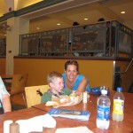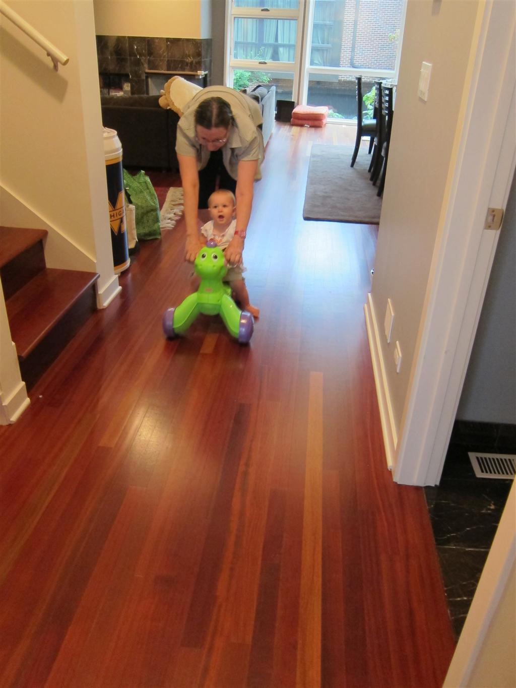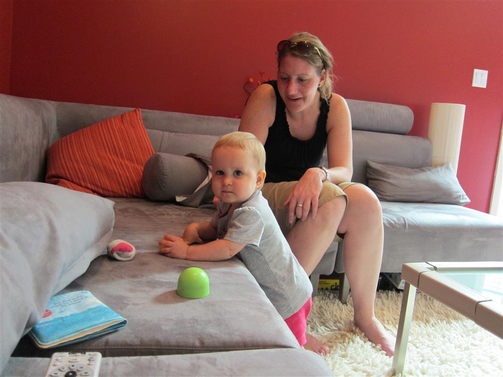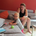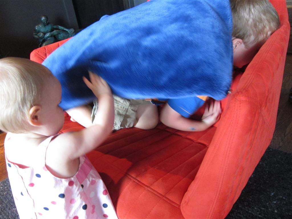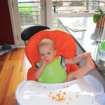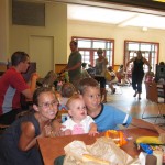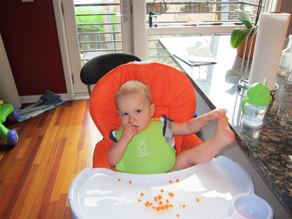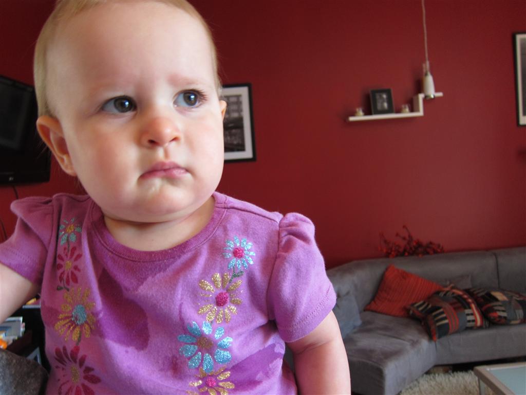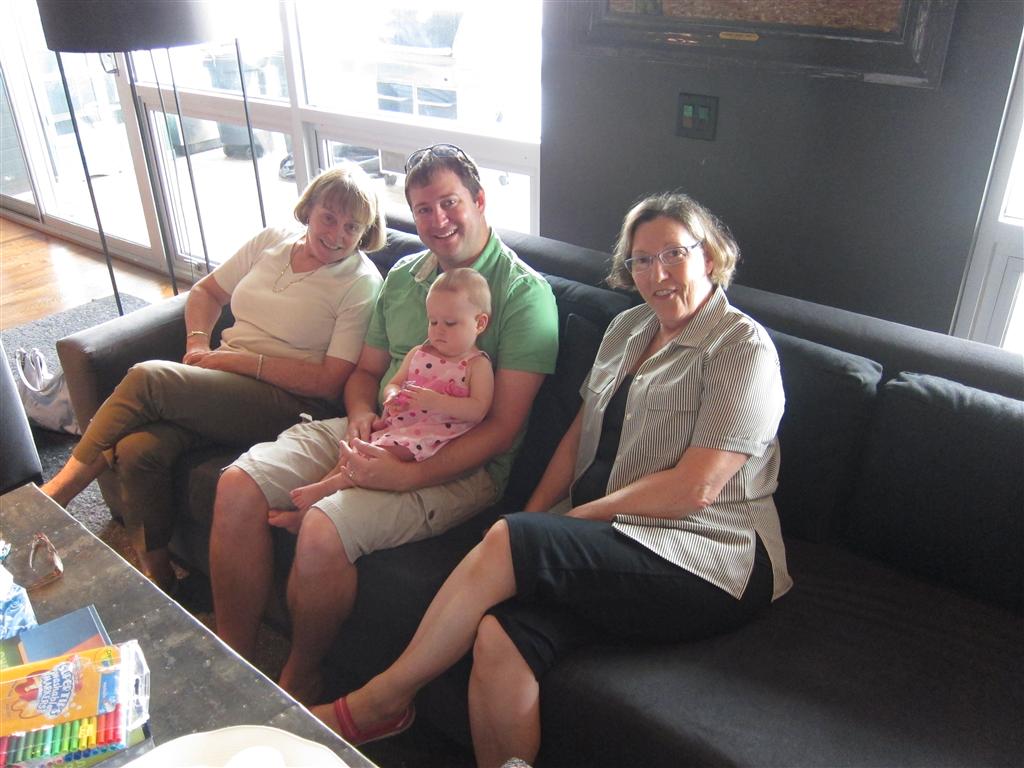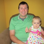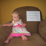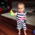 Eleanor had lots of visitors this week to help her celebrate her first birthday!  A great big thanks to everyone who helped make it a special occasion.  The big day started with our monthly family photo shoot, unfortunately Eleanor had taken a spill earlier, so she had a big scrape on her forehead :(  We didn’t get as many smiles as we had hoped during the photo shoot, but there were plenty of smiles to come.  Next, we headed over to Uncle B’s for some lunch and fun on the giant bean bag.  Eleanor isn’t quite old enough to play putt putt yet, but she did attempt to stuff a golf ball in her mouth.  After lunch and an unsuccessful attempt at an afternoon nap, it was time for cake and singing.  We actually forgot to sing as the cake came out – but that didn’t stop Eleanor from digging in.  The orange icing was a big hit – not as much for the chocolate cake.  She got her way through most of the icing, gave a few bites to Mom and Dad, and then we figured that was enought sugar.  After cake we opened presents – Eleanor didn’t participate too much in the unwrapping, but Mackenzie Jack and Ben stepped up with some much needed help.  The basketball hoop and bath boat were immediate favorites, but I’m sure there will be lots more favorites once we get everything unboxed.  Amazingly, after all that icing and excitement, Eleanor still managed to have a pretty good dinner, and even went to bed at a reasonable hour.