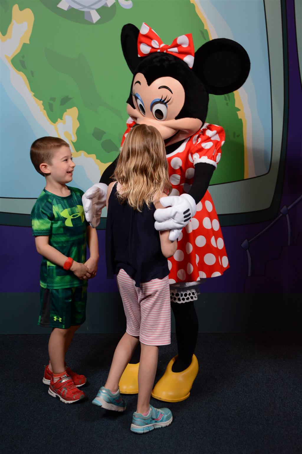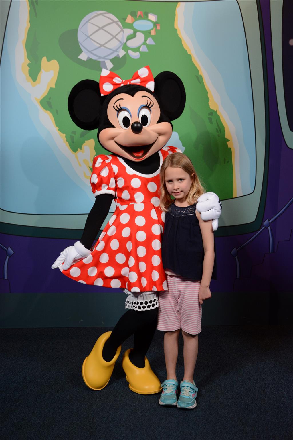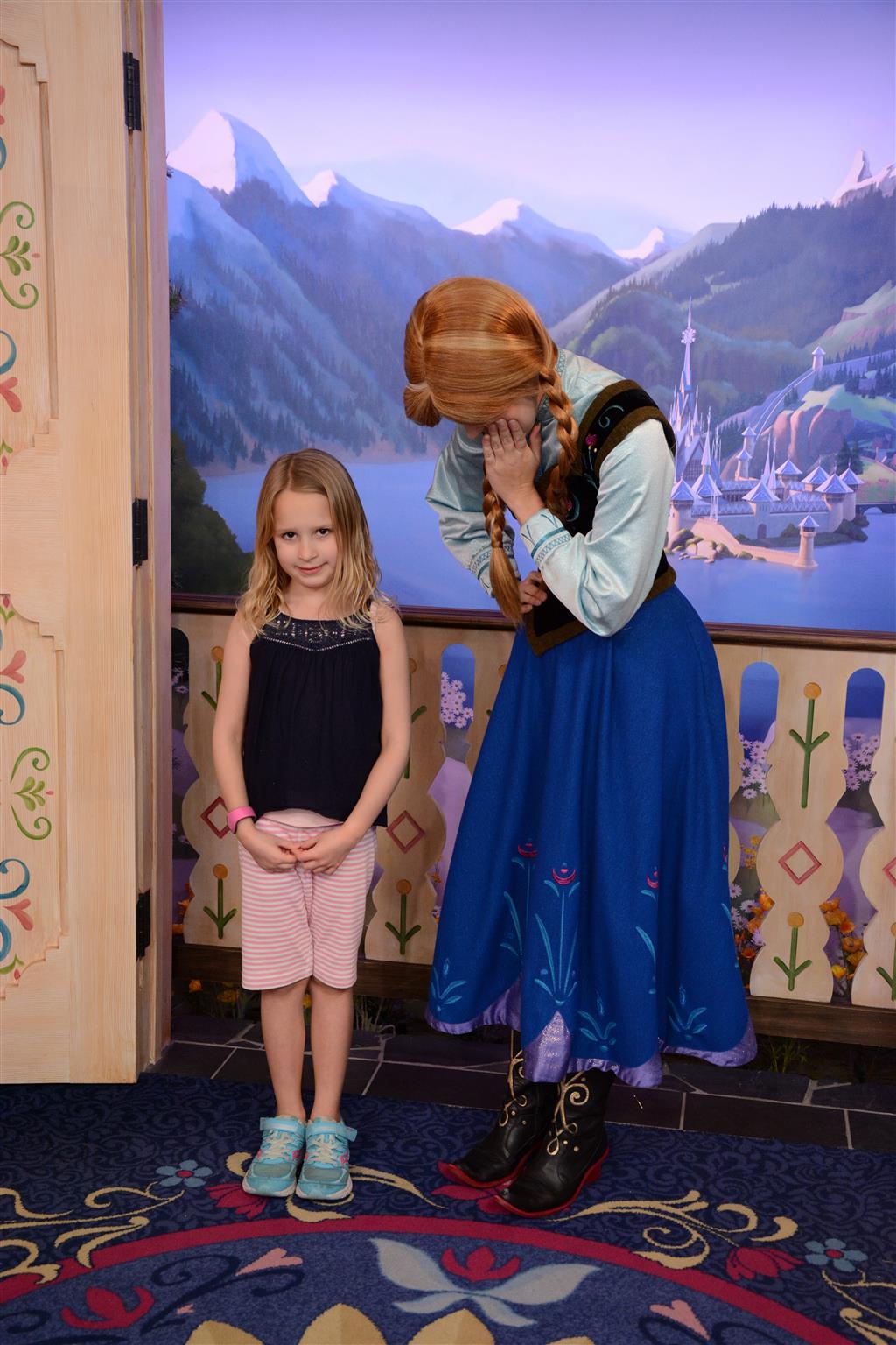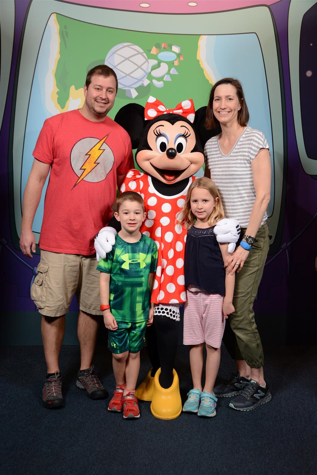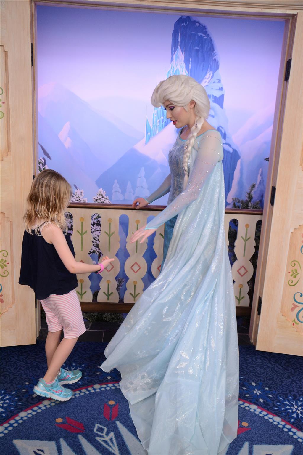 Day two took us to Epcot, and we stared with the “Soarin’” ride, which the kiddos found a bit too scary as well. A few slower rides and a movie and we were back on track. Dad was really looking forward to “Mission to Space”, but it didn’t turn out to be a favorite. After a REALLY long wait for pictures with Mickey and Minnie, we enjoyed the Nemo Under the Sea ride, and checking out all the cool marine life. Then, it was off to “Norway” for the Frozen ride. The backwards waterfall was a little scary, but for the most part they liked this one. We had dinner in “Japan”, and Henry was the happiest guy in the room when his meal came served on a monorail plate. We finished the day with a photo session with Anna and Elsa.