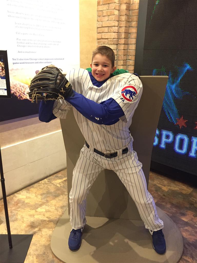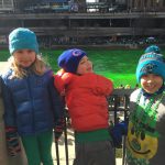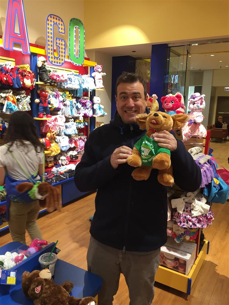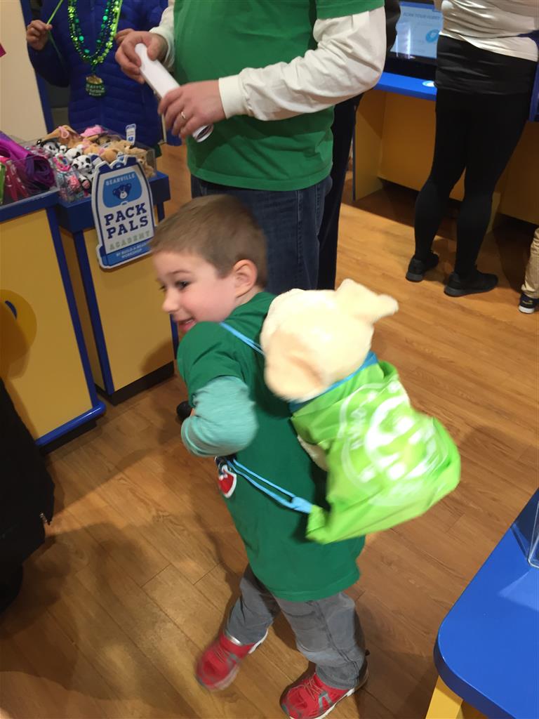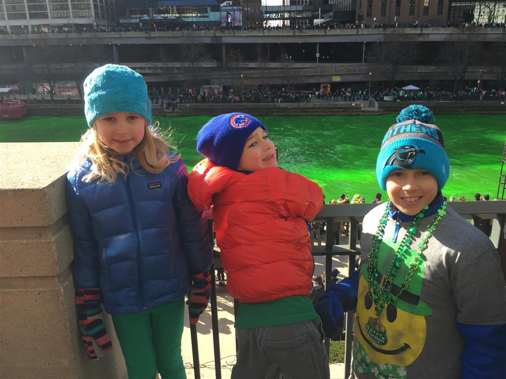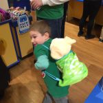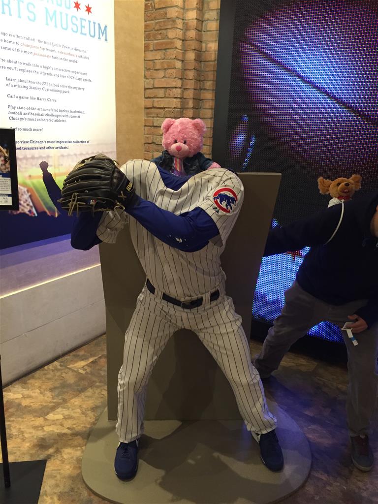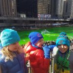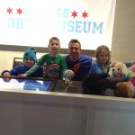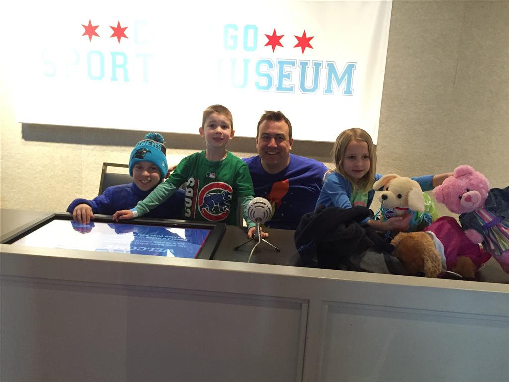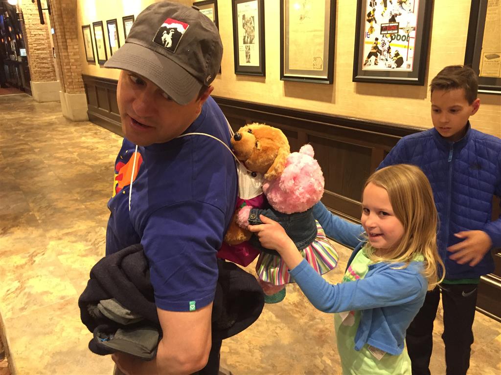 This weekend cousin Jack and Grandma and Grandpa came into town for a visit. Uncle B and Aunt Breanne did some fantastic planning, and we ended up with a fun filled weekend. Saturday started with the annual river dieing. It was pretty cold this year, but thankfully the sun was out and shining. A quick stop for breakfast and we were off to visit the Build a Bear store. Eleanor and Henry had never been, and Jack was excited to show them how it worked. Eleanor built a pink bear with a striped skirt, and she hasn’t stopped carrying it around with her since. Henry built a golden puppy with a St. Patrick’s Day shirt, and has slept with it each night since. So I’d say Build a Bear was a success! Next we visited the Illinois Sports Museum, which had some fun exhibits and computer simulations. Both kids liked putting their new stuffed friends up to pose as famous athletes.