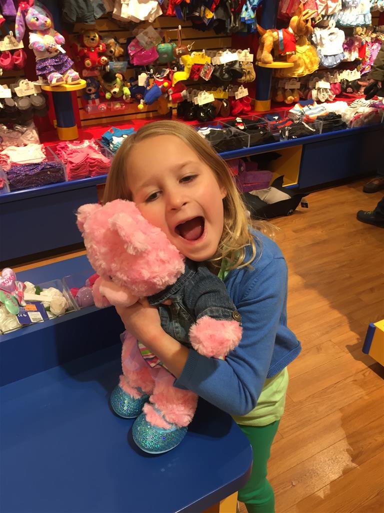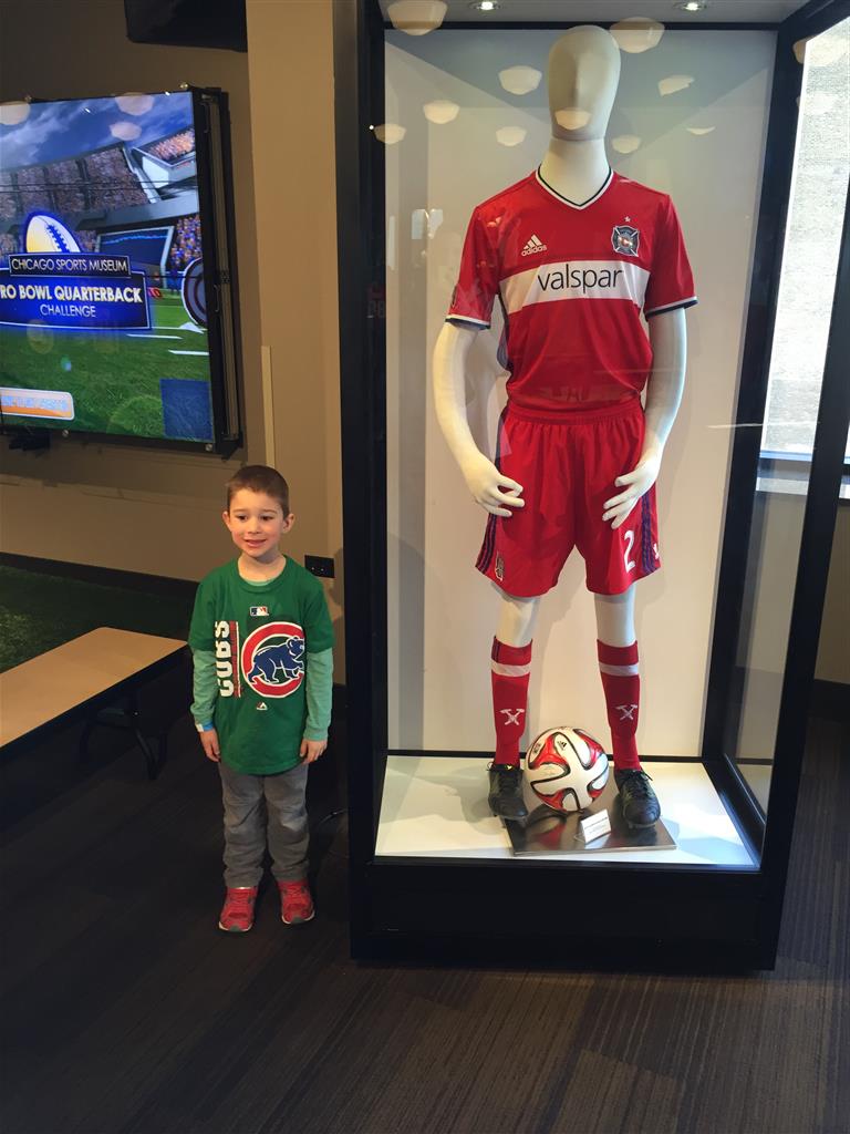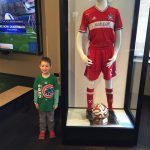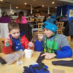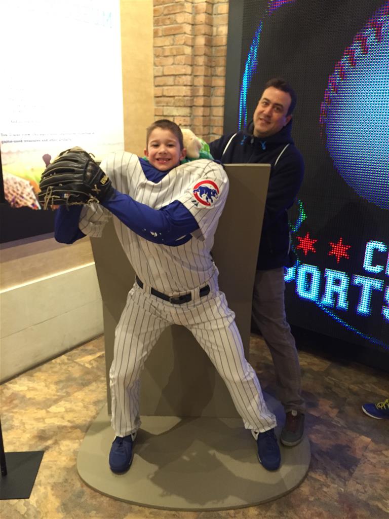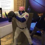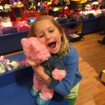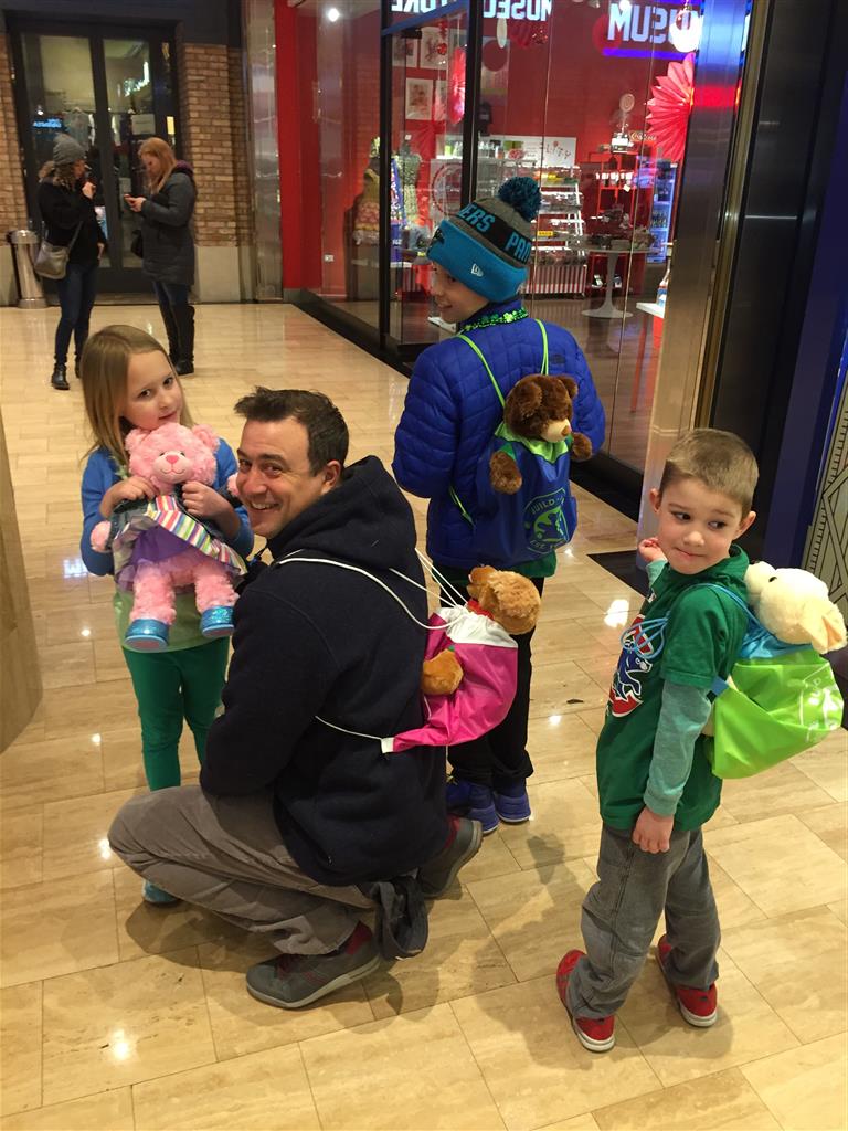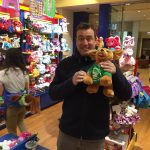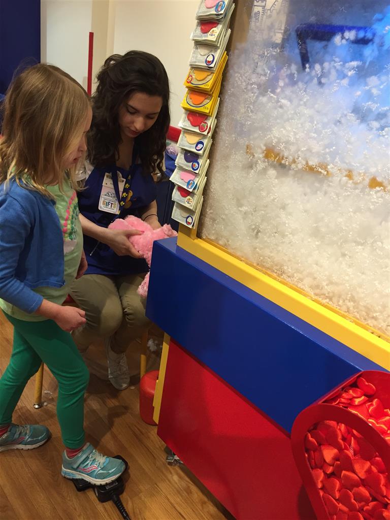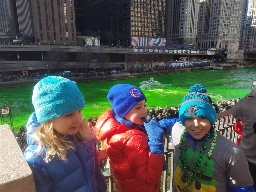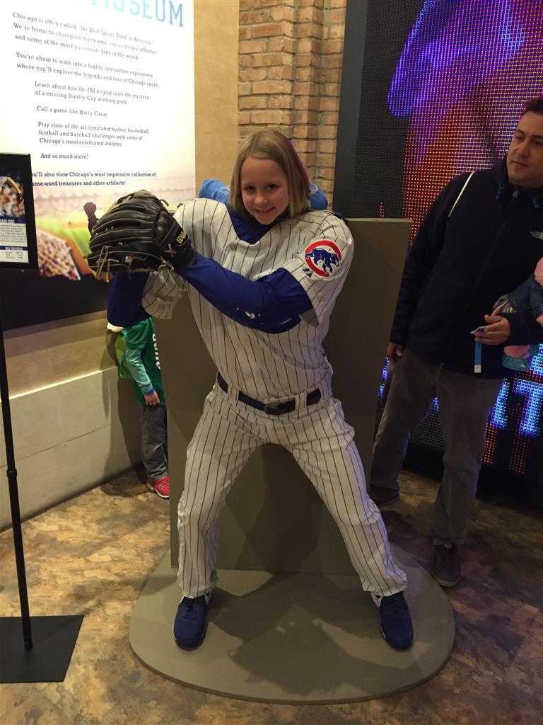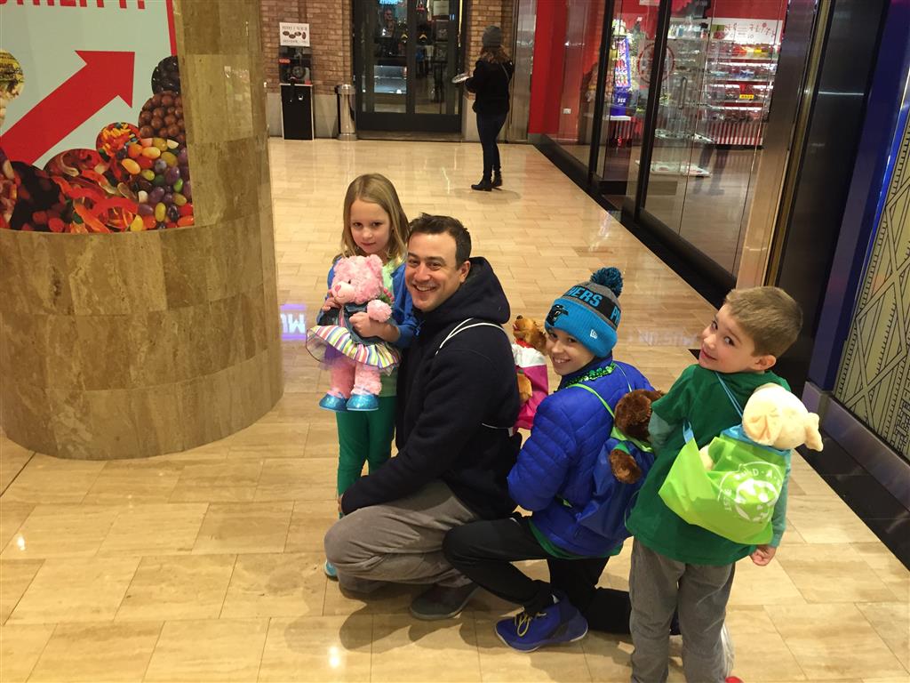 This weekend cousin Jack and Grandma and Grandpa came into town for a visit. Uncle B and Aunt Breanne did some fantastic planning, and we ended up with a fun filled weekend. Saturday started with the annual river dieing. It was pretty cold this year, but thankfully the sun was out and shining. A quick stop for breakfast and we were off to visit the Build a Bear store. Eleanor and Henry had never been, and Jack was excited to show them how it worked. Eleanor built a pink bear with a striped skirt, and she hasn’t stopped carrying it around with her since. Henry built a golden puppy with a St. Patrick’s Day shirt, and has slept with it each night since. So I’d say Build a Bear was a success! Next we visited the Illinois Sports Museum, which had some fun exhibits and computer simulations. Both kids liked putting their new stuffed friends up to pose as famous athletes.