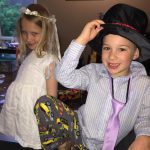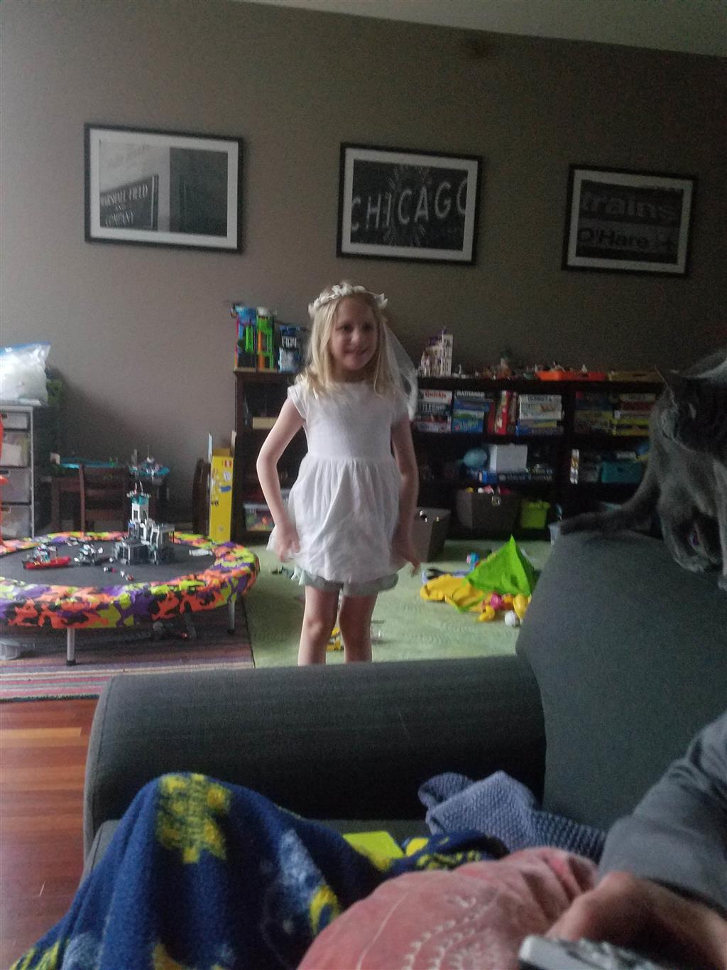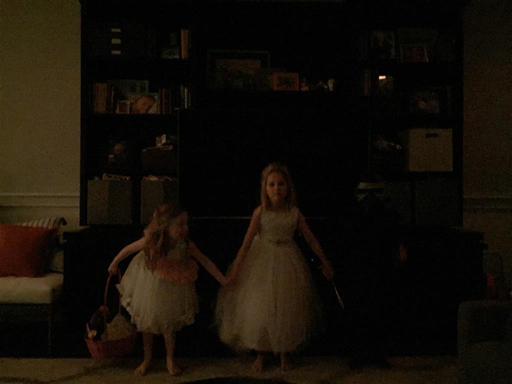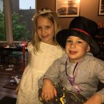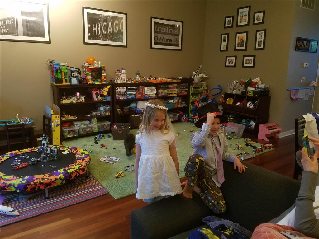 Twice this week Eleanor and Henry surprised us with some fantastic costumes. First, on Friday night after putting the kids to bed, Mom and Dad were enjoying a movie when Eleanor and Henry crept down the stairs. We were about to send them back up with they announced that they were getting married and wanted to show us their outfits. Ha! Henry had put on a top hat, button down shirt and a tie to go with his pajama bottoms, and Eleanor had somehow managed to squeeze into a white dress at least three years too small for her. Then, on Saturday, we had dinner at Eleanor’s friend Lincoln’s house and the kids put on two shows for us, the first was an original music piece with Henry dancing in the background and Eleanor on guitar and Lincoln on violin. The second was a play about a girl who got lost in the woods (Lincoln) who was helped by her fairy godmother (Eleanor) and protected by Kylo-Ren (Henry).
