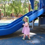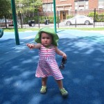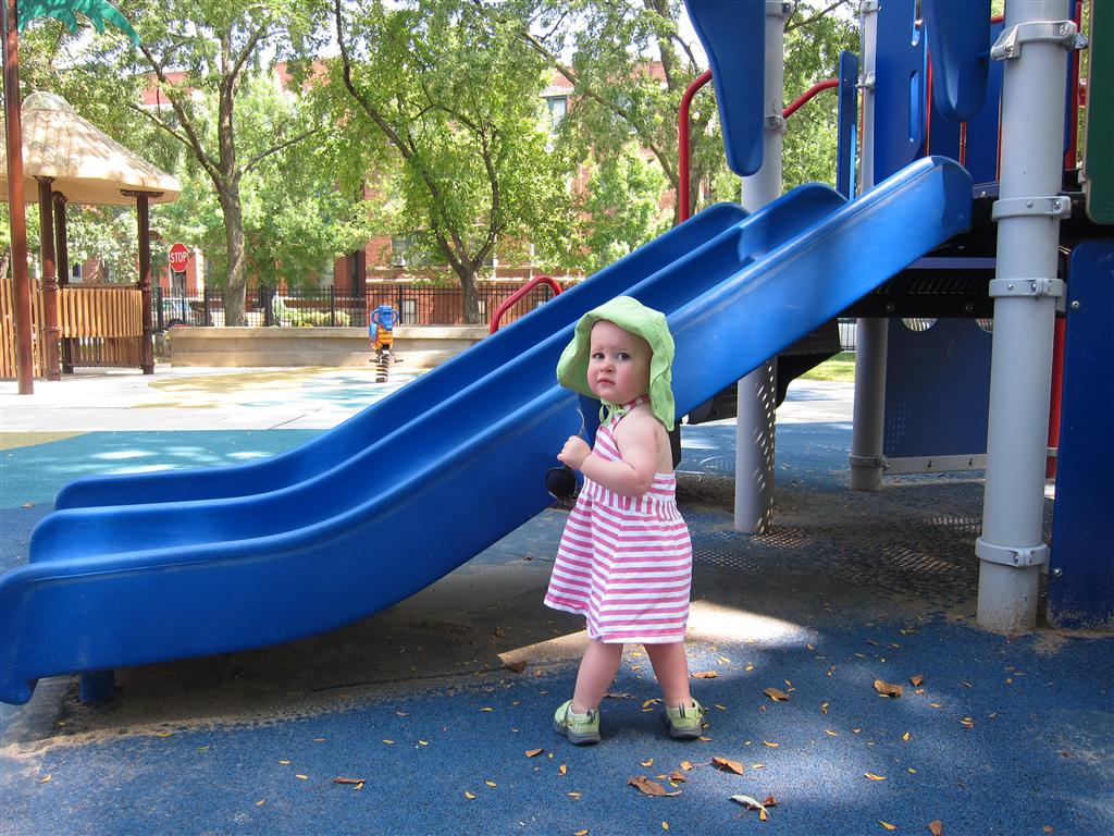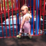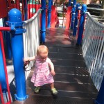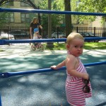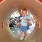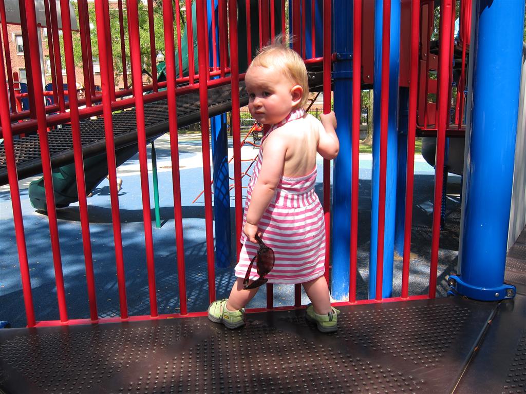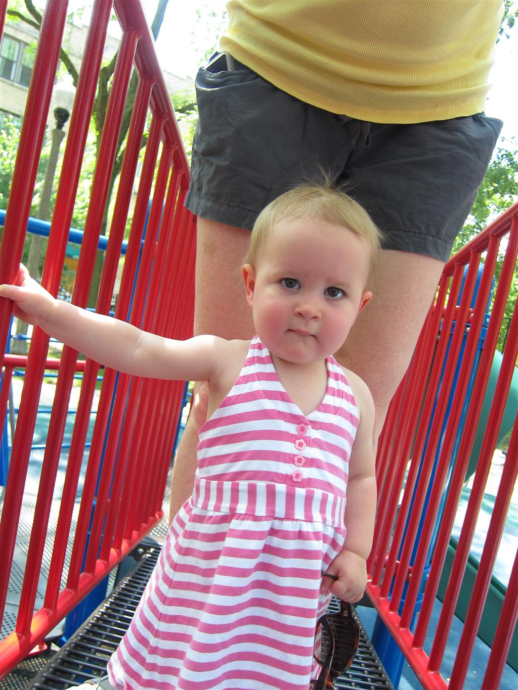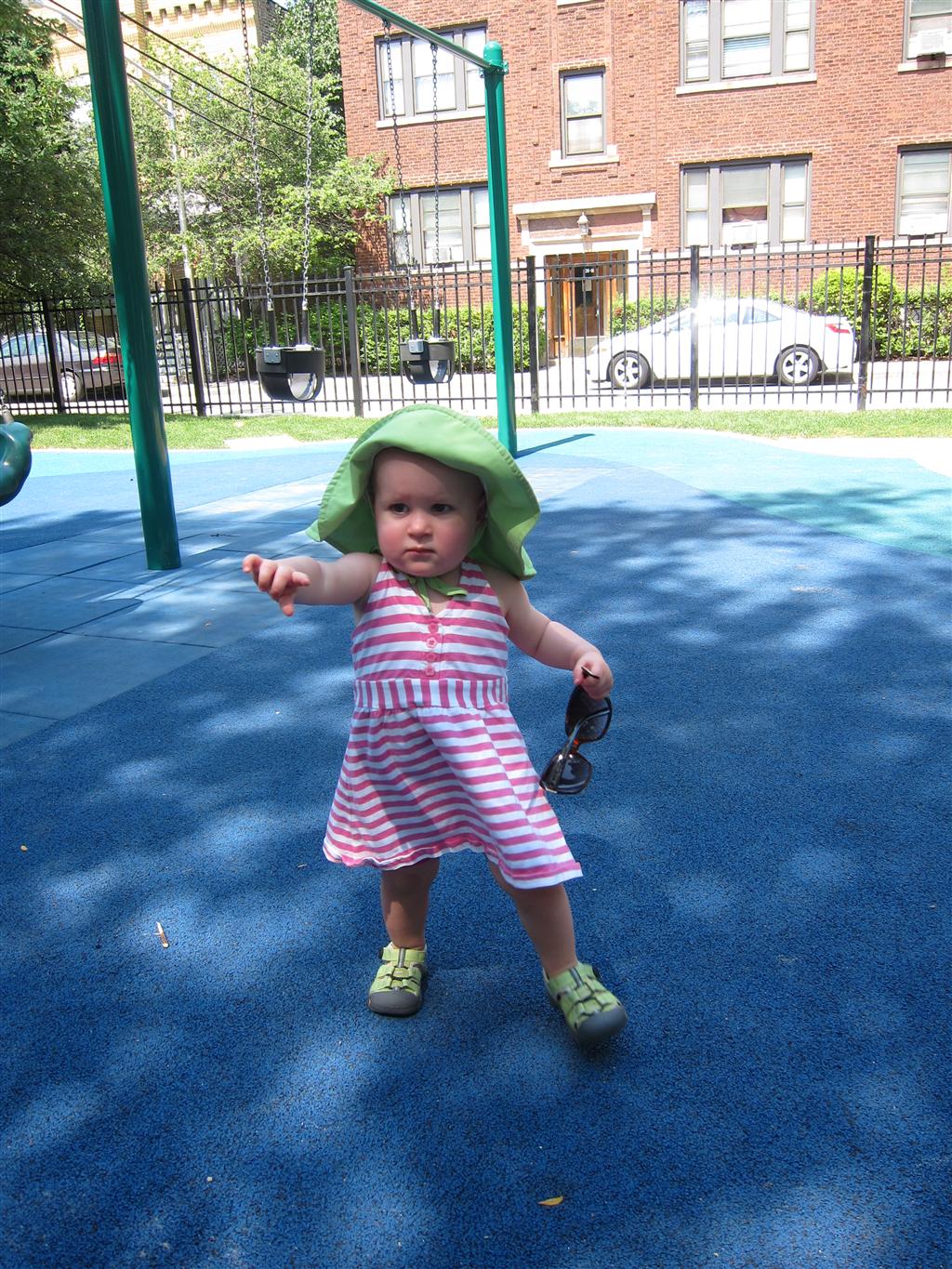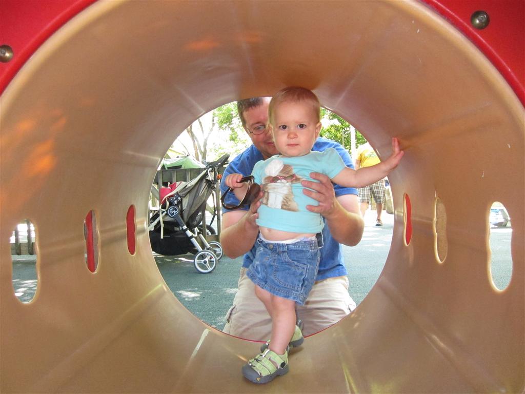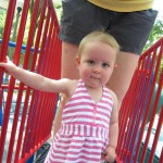 This week Eleanor took advantage of the good weather with lots of trips to the park – and lots of mac and cheese! She has also been working on her crawling and climbing technique. She has always preferred walking to crawling, but this has posed a problem for things like crawling tunnels. She tries to stand up i them, and hits her head and gets stuck. This week, she made it all the way through the crawling tunnel at music class by herself for the first time – and only stood up once! She has been practicing her climbing on the slide stairs at the park – and the practice is showing. She can now climb the stairs at home all by herself – she made it up an entire flight this week unassisted. She also made impressive progress at her swim class, completing a 5 second underwater “swim”, and graduating to “Level 2”. I thought it seemed a bit odd to have swimming “levels” for people unable to keep themselves afloat – but she is definitely getting used to the pool.