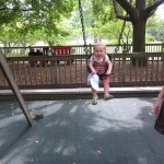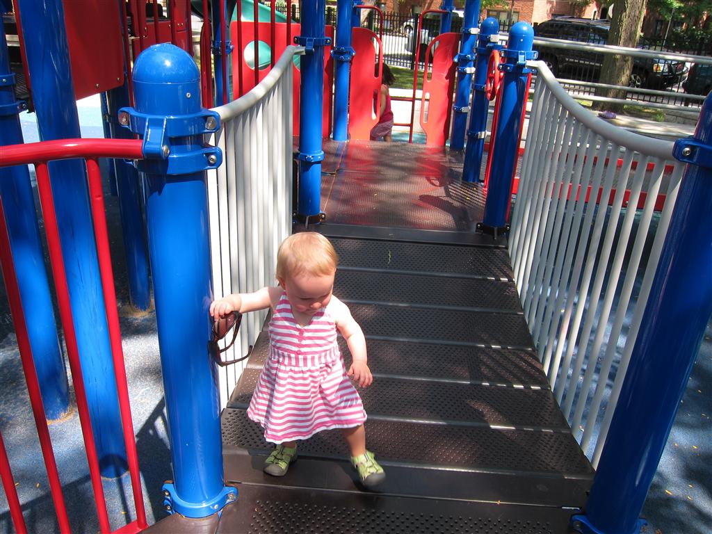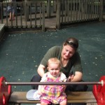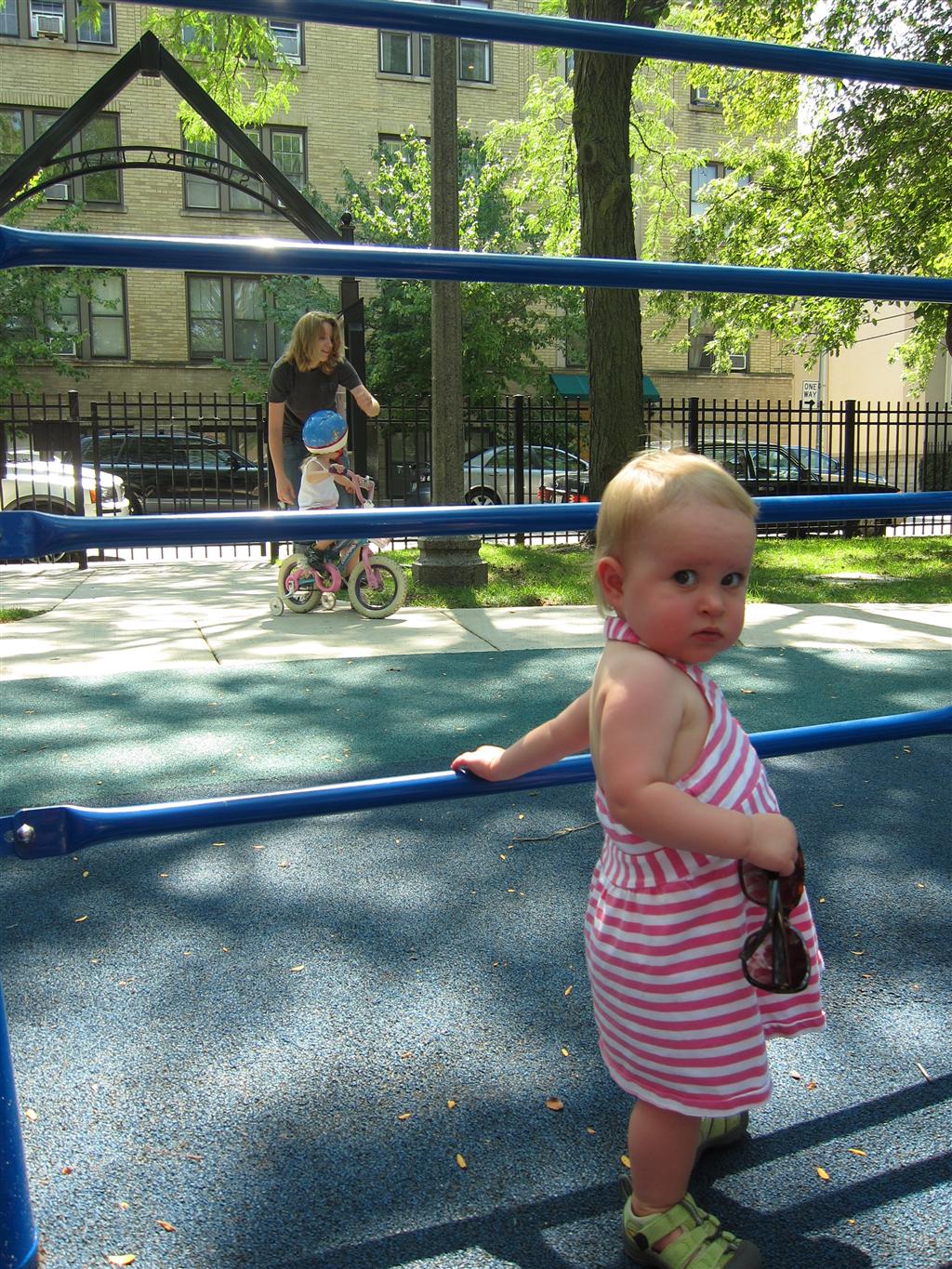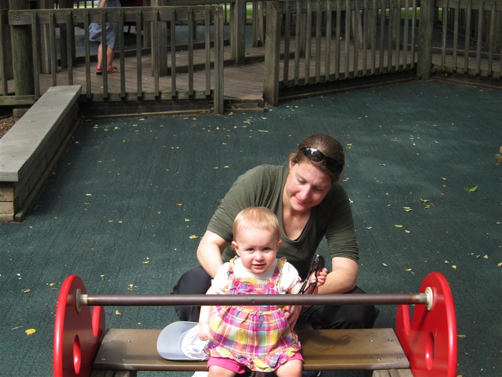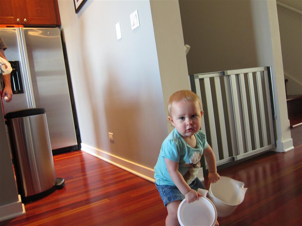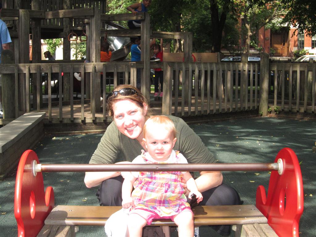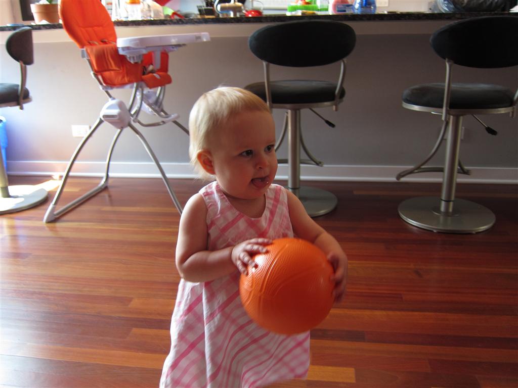 This week Eleanor took advantage of the good weather with lots of trips to the park – and lots of mac and cheese! She has also been working on her crawling and climbing technique. She has always preferred walking to crawling, but this has posed a problem for things like crawling tunnels. She tries to stand up i them, and hits her head and gets stuck. This week, she made it all the way through the crawling tunnel at music class by herself for the first time – and only stood up once! She has been practicing her climbing on the slide stairs at the park – and the practice is showing. She can now climb the stairs at home all by herself – she made it up an entire flight this week unassisted. She also made impressive progress at her swim class, completing a 5 second underwater “swim”, and graduating to “Level 2”. I thought it seemed a bit odd to have swimming “levels” for people unable to keep themselves afloat – but she is definitely getting used to the pool.