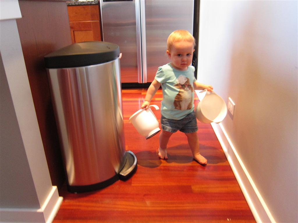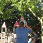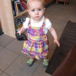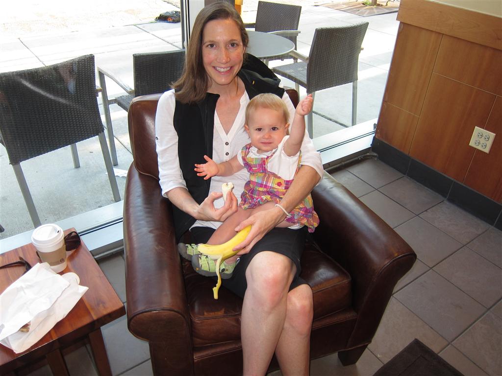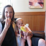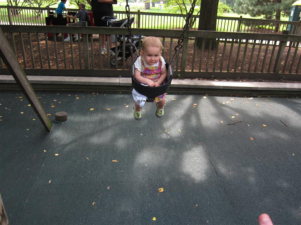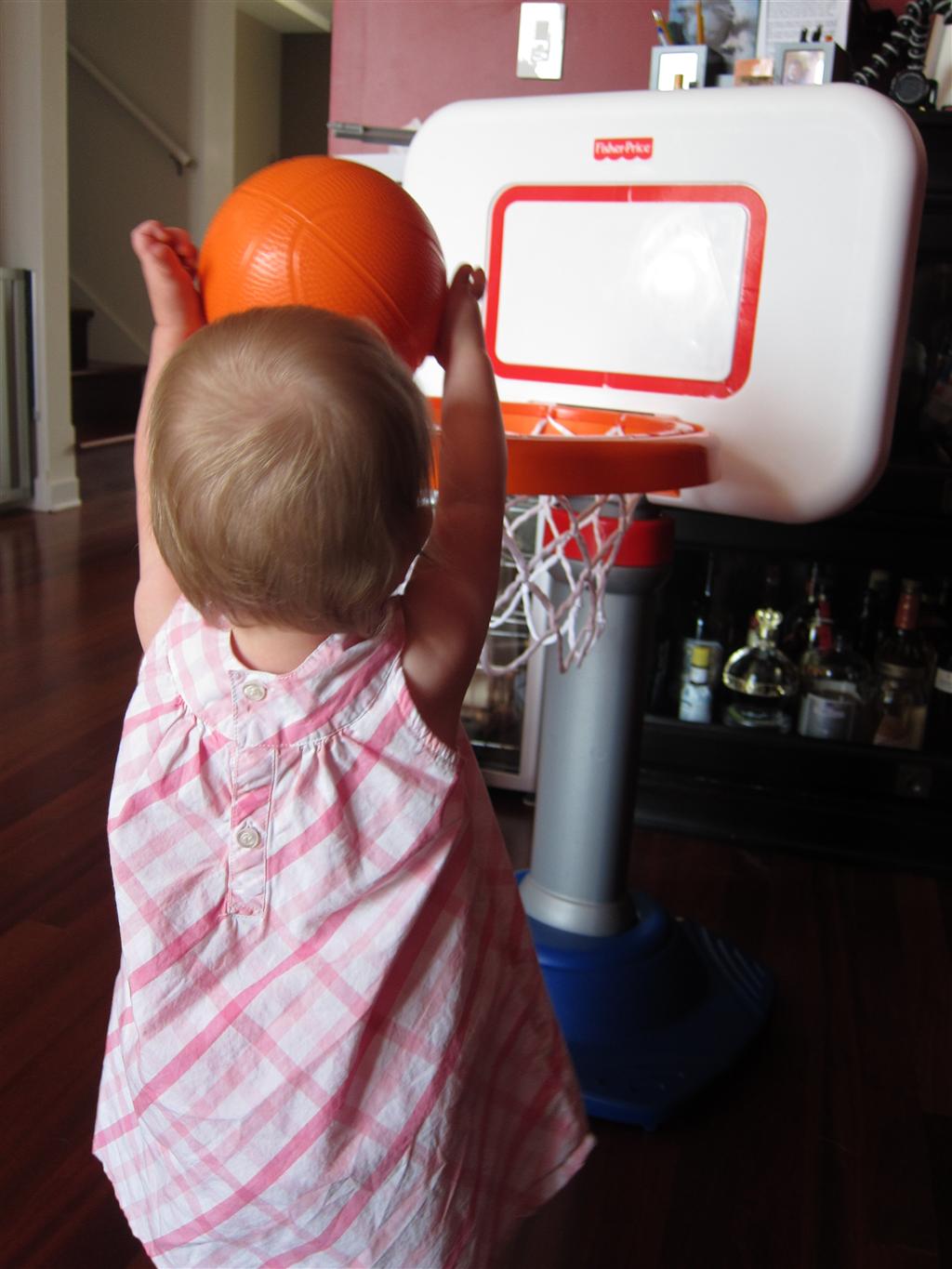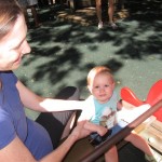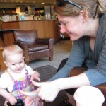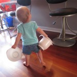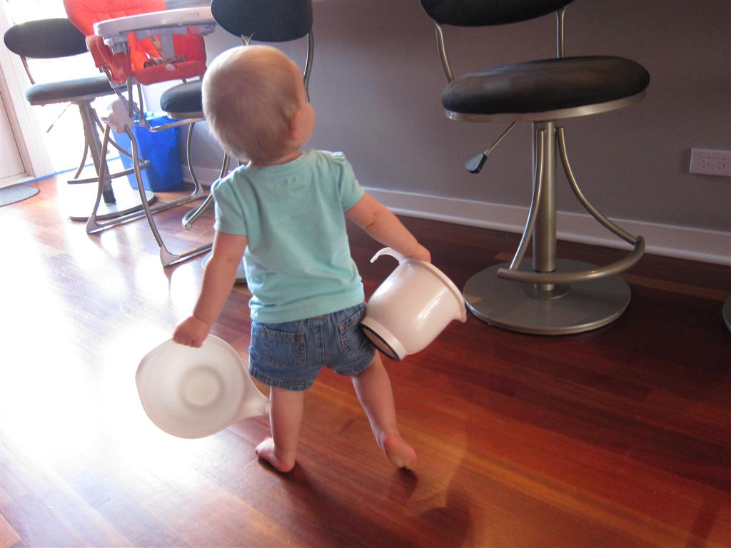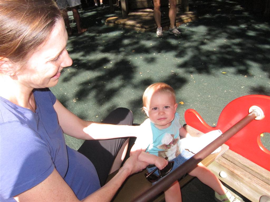 This week Eleanor took advantage of the good weather with lots of trips to the park – and lots of mac and cheese! She has also been working on her crawling and climbing technique. She has always preferred walking to crawling, but this has posed a problem for things like crawling tunnels. She tries to stand up i them, and hits her head and gets stuck. This week, she made it all the way through the crawling tunnel at music class by herself for the first time – and only stood up once! She has been practicing her climbing on the slide stairs at the park – and the practice is showing. She can now climb the stairs at home all by herself – she made it up an entire flight this week unassisted. She also made impressive progress at her swim class, completing a 5 second underwater “swim”, and graduating to “Level 2”. I thought it seemed a bit odd to have swimming “levels” for people unable to keep themselves afloat – but she is definitely getting used to the pool.