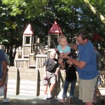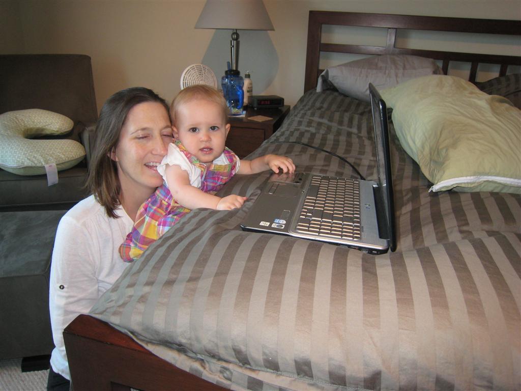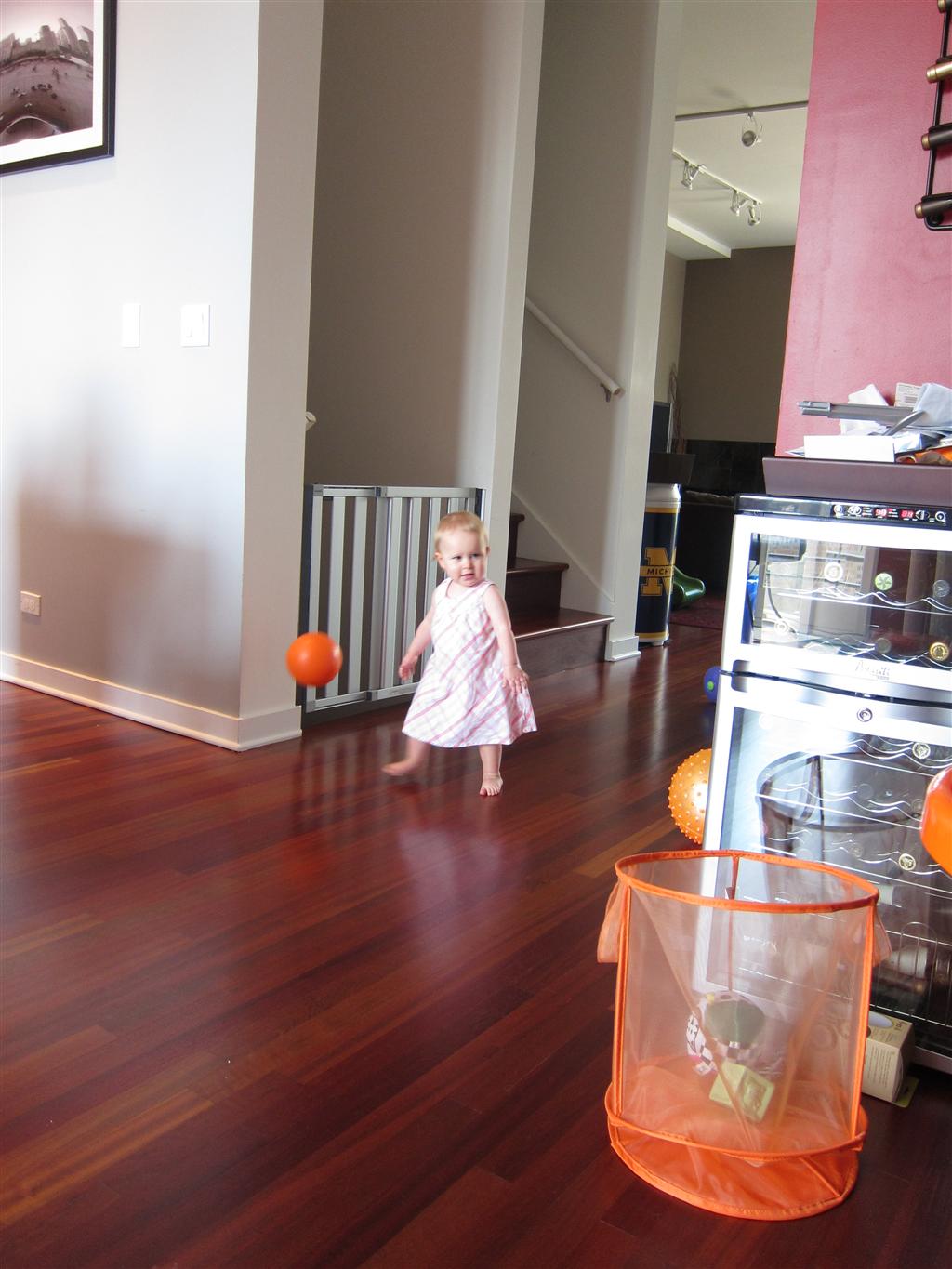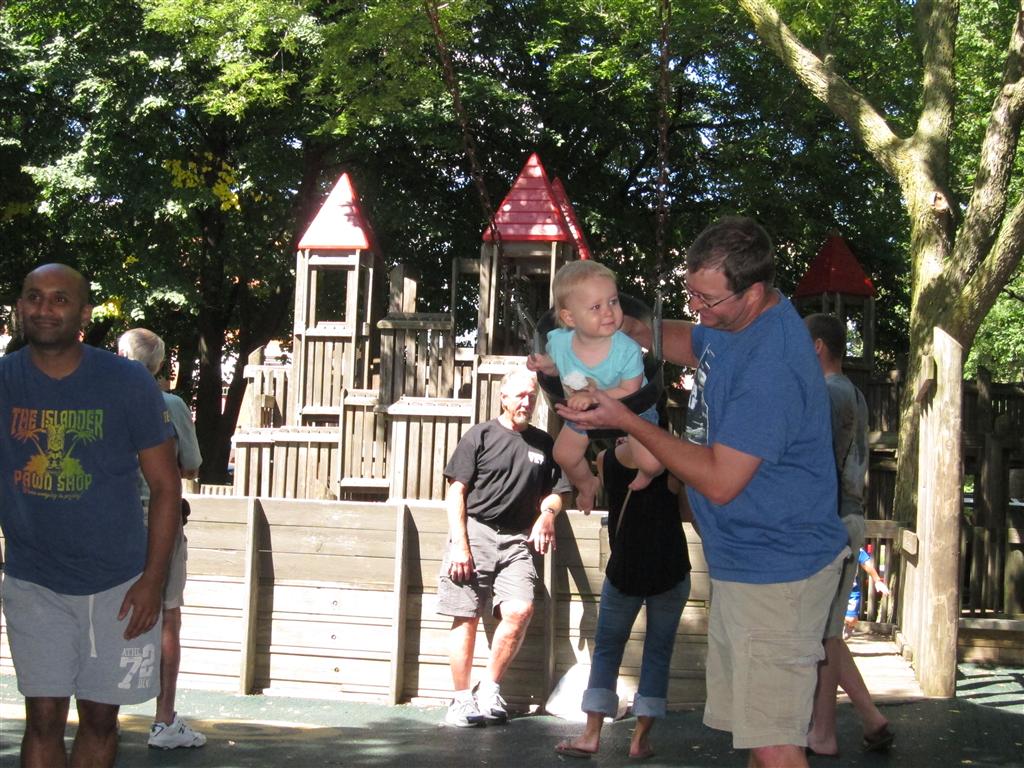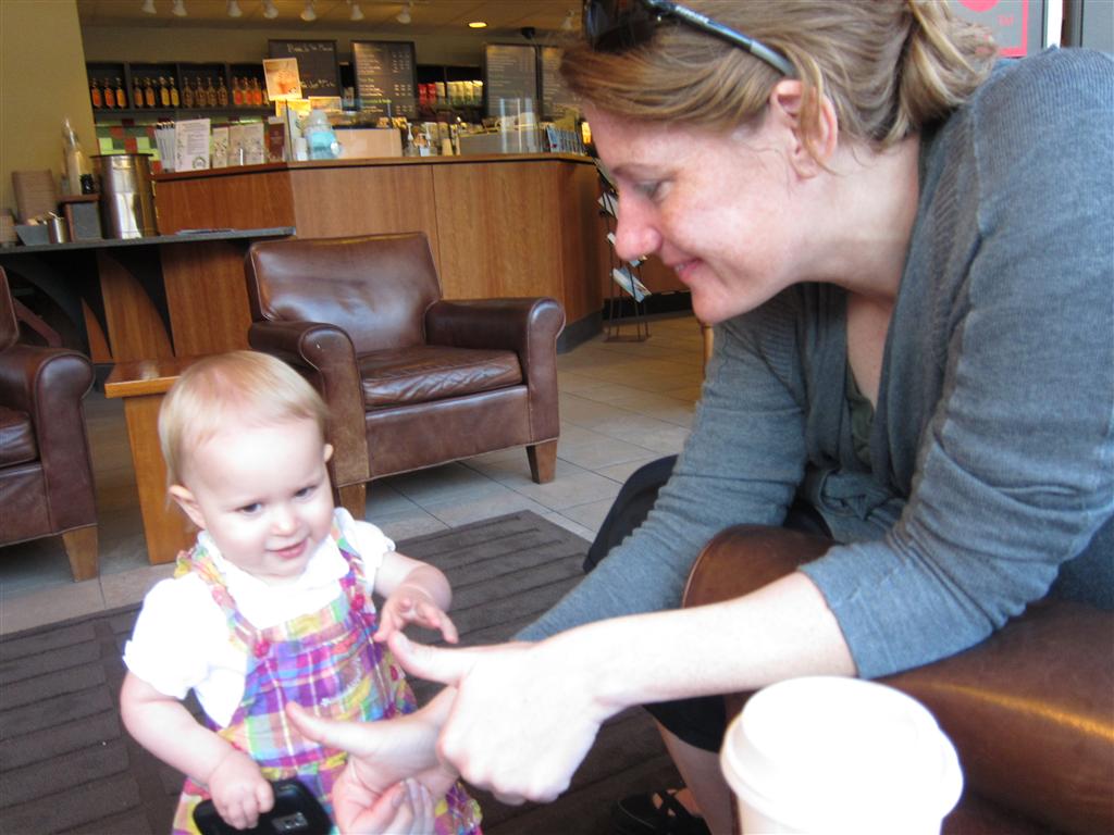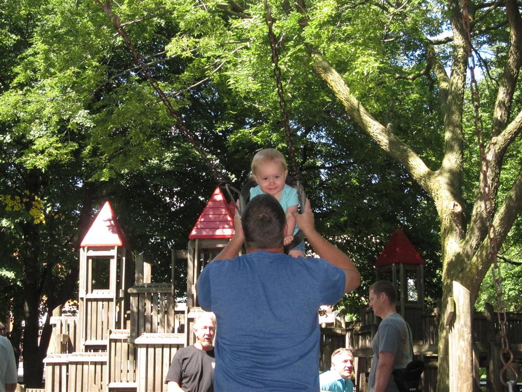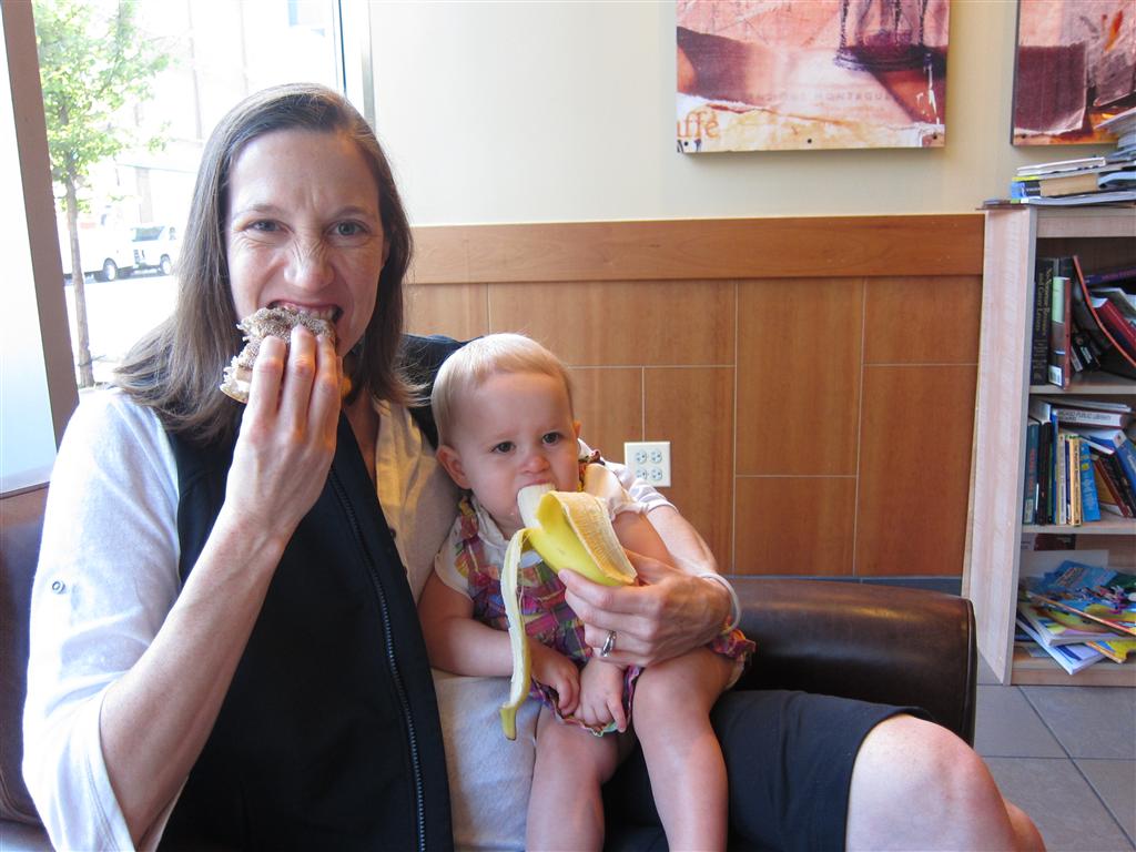This week Eleanor took advantage of the good weather with lots of trips to the park – and lots of mac and cheese! She has also been working on her crawling and climbing technique. She has always preferred walking to crawling, but this has posed a problem for things like crawling tunnels. She tries to stand up i them, and hits her head and gets stuck. This week, she made it all the way through the crawling tunnel at music class by herself for the first time – and only stood up once! She has been practicing her climbing on the slide stairs at the park – and the practice is showing. She can now climb the stairs at home all by herself – she made it up an entire flight this week unassisted. She also made impressive progress at her swim class, completing a 5 second underwater “swim”, and graduating to “Level 2”. I thought it seemed a bit odd to have swimming “levels” for people unable to keep themselves afloat – but she is definitely getting used to the pool.