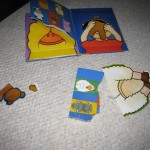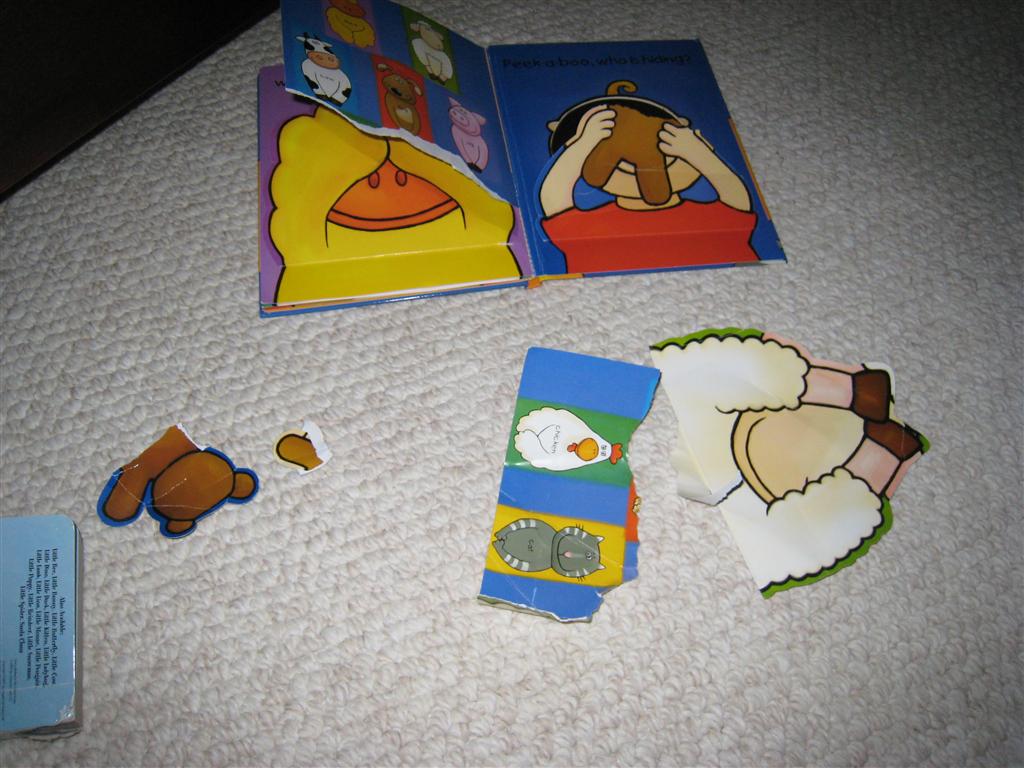 On a sad note, one of her favorite books was a casulty this week – we think she dropped it out of her crib during a nap, and in the process of trying to retrieve it, ripped it into a number of pieces. Poor sheep flap. Baaaaaaaa.