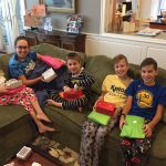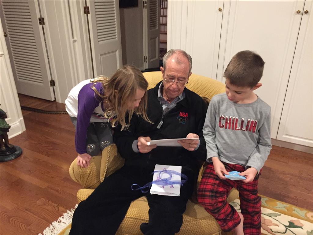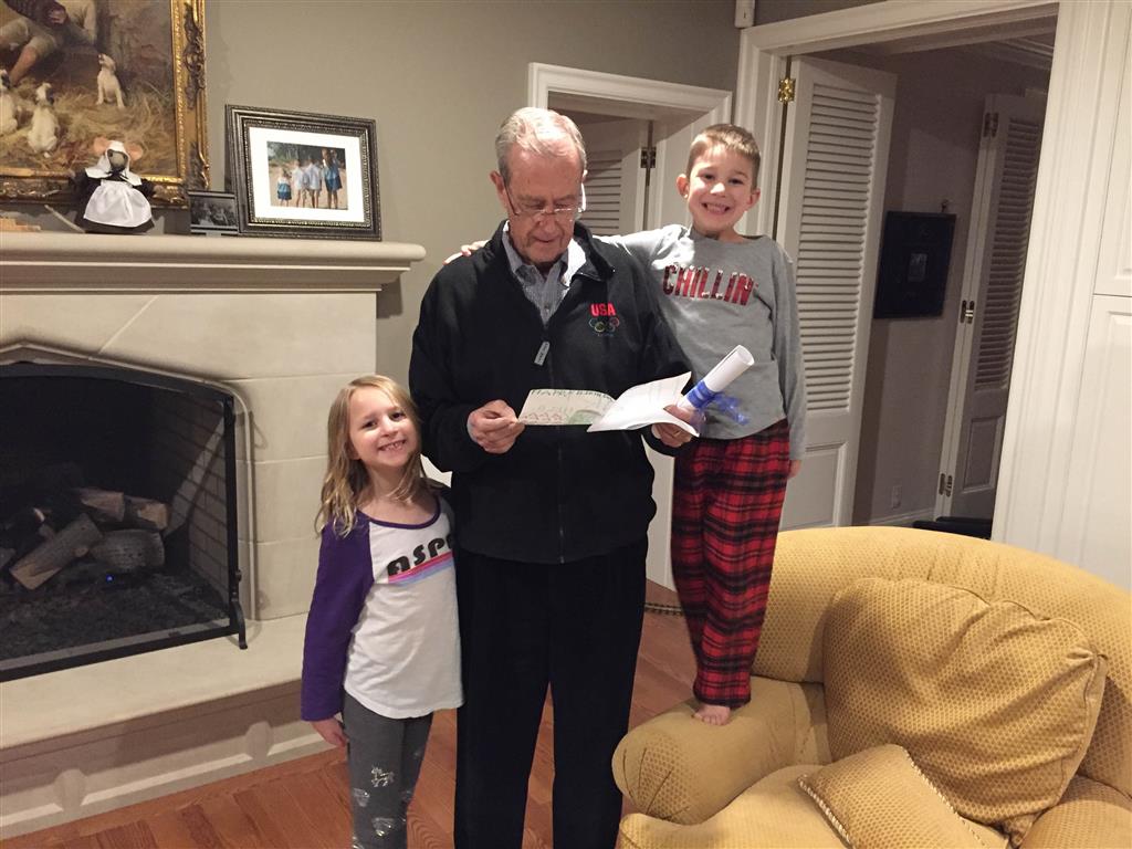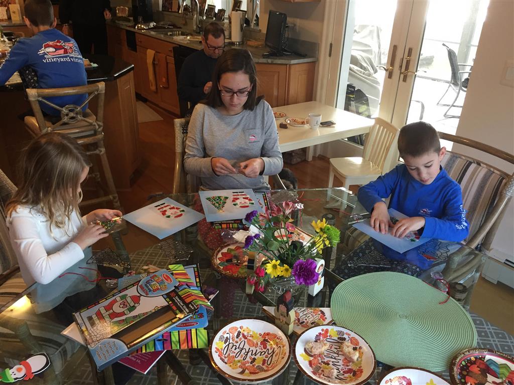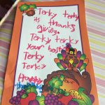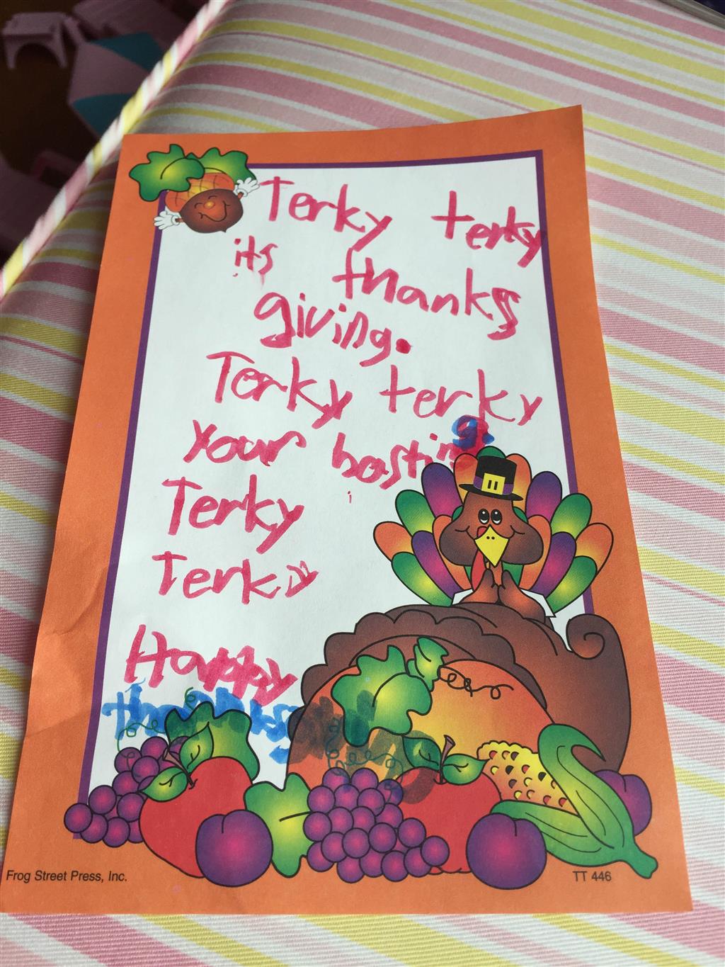 Eleanor and Henry celebrated Thanksgiving with a trip to see Grandma and Grandpa. The trains and Barbies were a big hit as always, along with some new additions – Eleanor loved playing ping pong with Grandpa, with her favorite part being chasing the ball once it hit the floor. Henry was excited about playing football it the back yard – he especially loves the quarterback sneak! On actual Thanksgiving, Henry could barely contain himself with all the excitement – he loved playing basketball with all of his cousins – his strategy was to just grab and try to tackle whoever had the ball. He was also quite impressed with all the desert options – he decided that he needed to try one of everything. Eleanor and Grandma had fun writing notes to each other, and Eleanor ended up writing two poems – maybe she has written others at school, but they are the first poems that I can remember her writing.