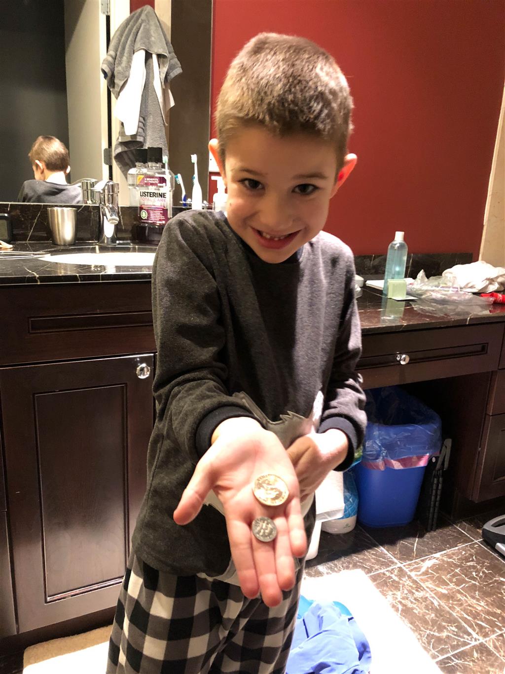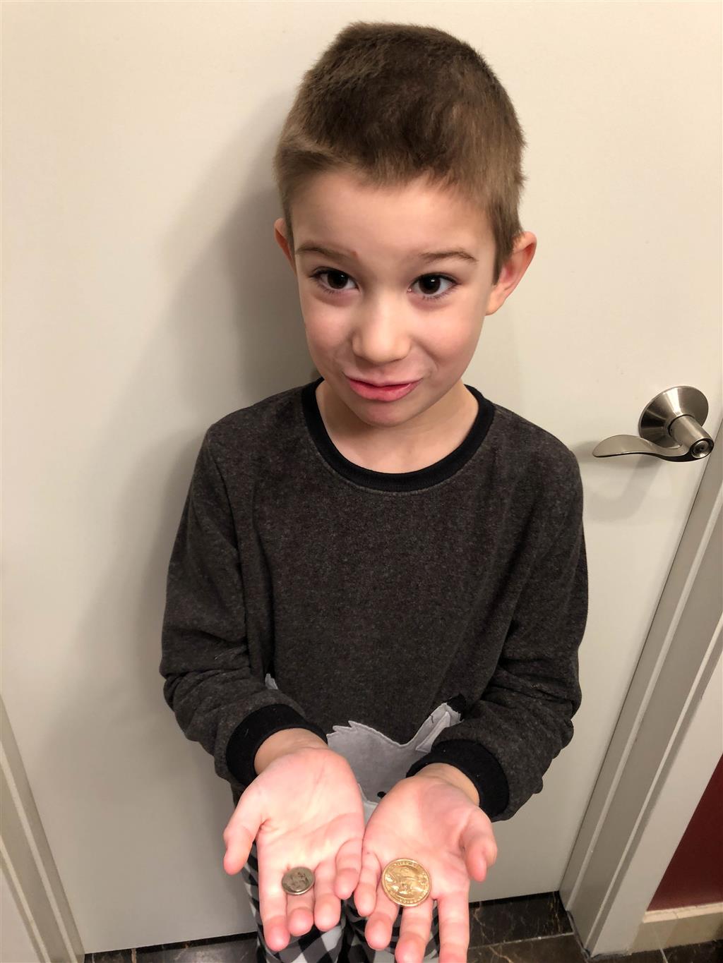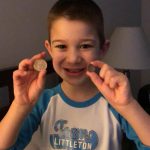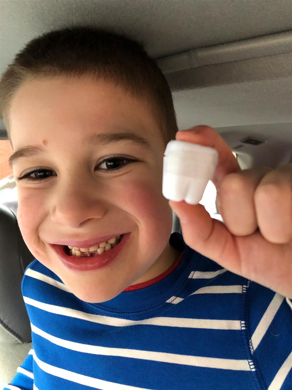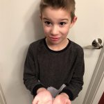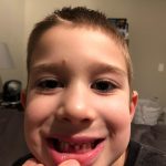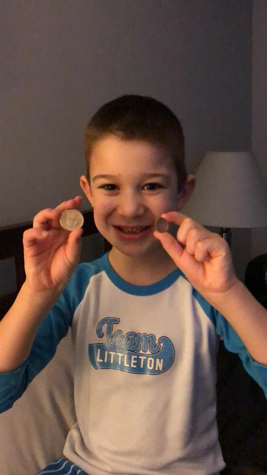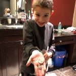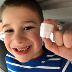 Henry lost both his bottom front teeth this week. The first one went missing on Tuesday, and we aren’t sure exactly when. We noticed that night while flossing, but Henry thinks perhaps he lost it at school – he most likely ate it. He was super sad that he didn’t have the tooth, but he cheered up once we explained that the tooth fairy would still come. He also checked in the bathroom for the next day or so to see if the tooth reappeared there! Then, on Thursday, the other bottom tooth came out, and this time he felt it as he was eating popcorn and was able to keep it. He was very proud of the tooth shaped container that the nurse gave him to carry his tooth home.