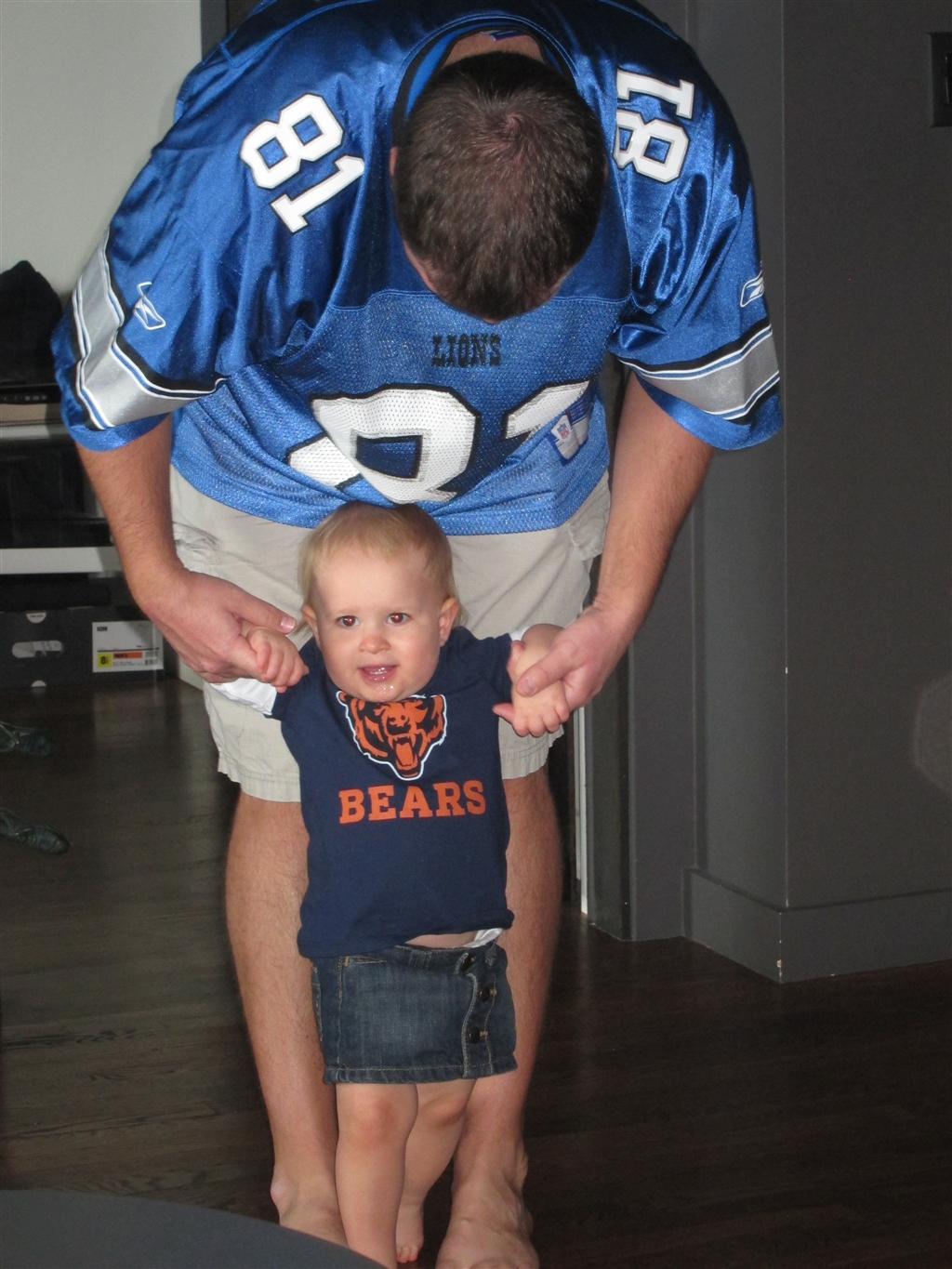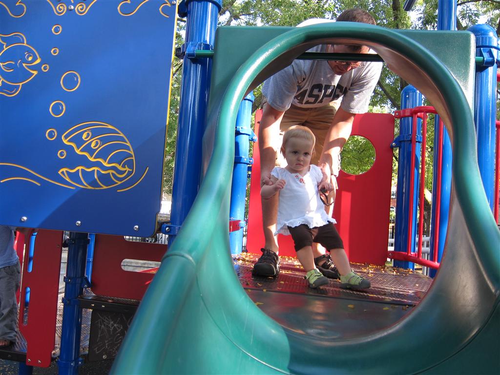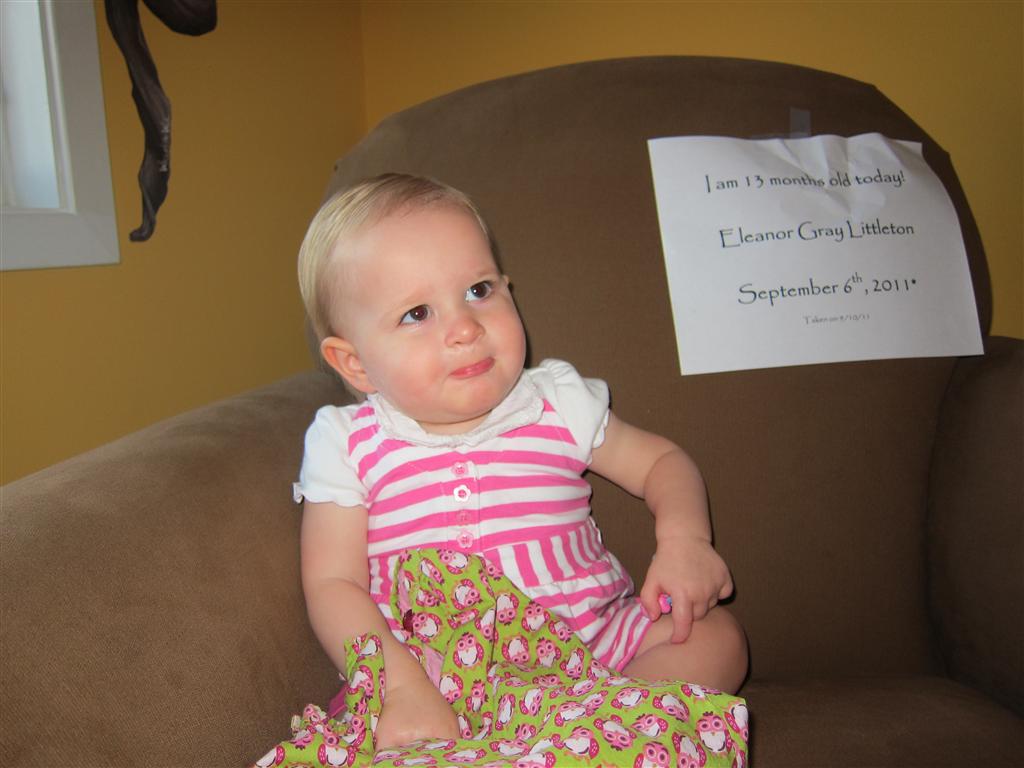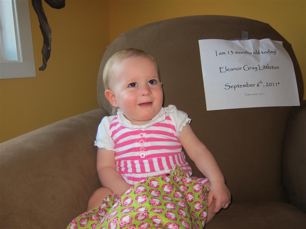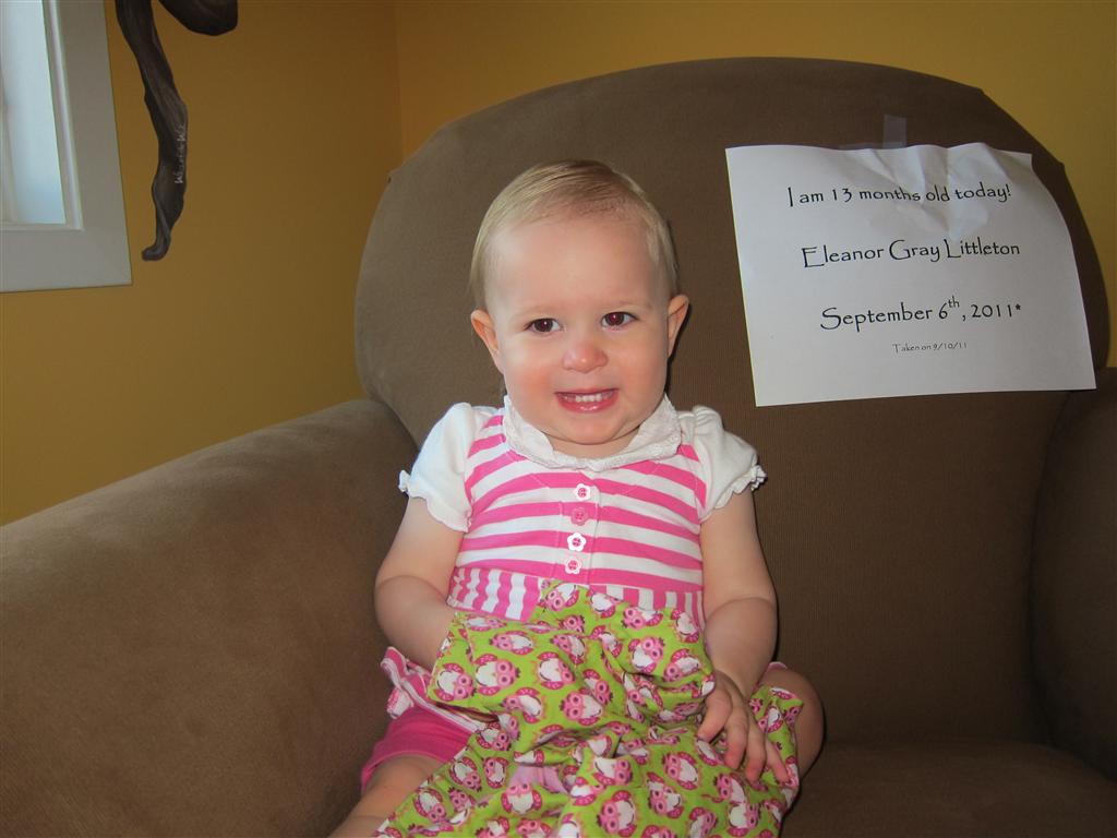 Eleanor celebrated the opening of the NFL season with a party at Uncle B’s house. She was sporting her new Bears outfit, but only because her Lions outfit doesn’t fit anymore. Dad will have to get her a replacement soon – I can’t have another Bears fan in the house. Eleanor also turned 13 months this week – although we took the official pictures a few days late (whoops!). We also had a few firsts this week – including going down a slide on our tummy, and successfully turning over the shape sorter to find the correct hole. Next week – algebra.