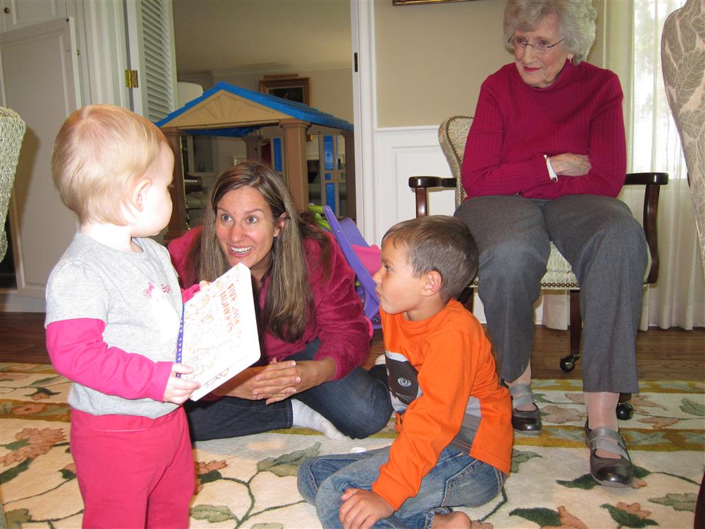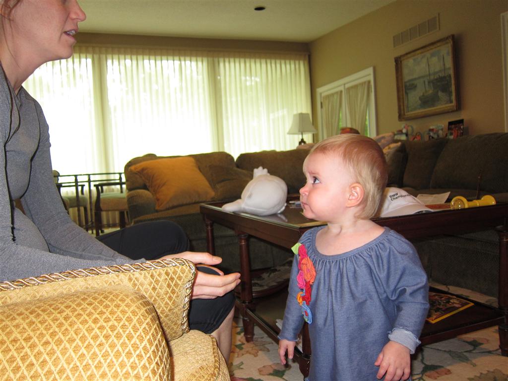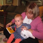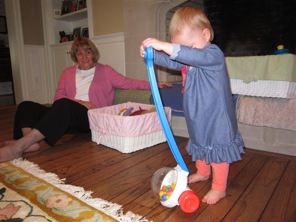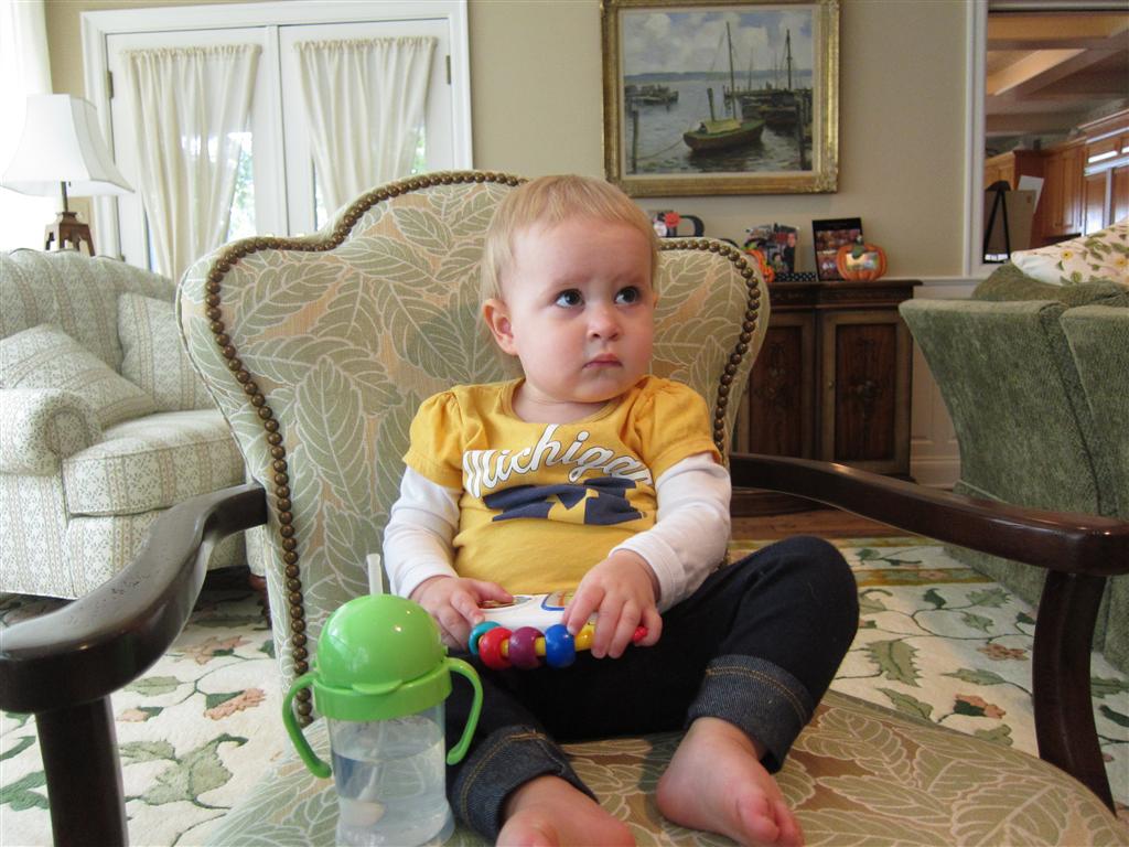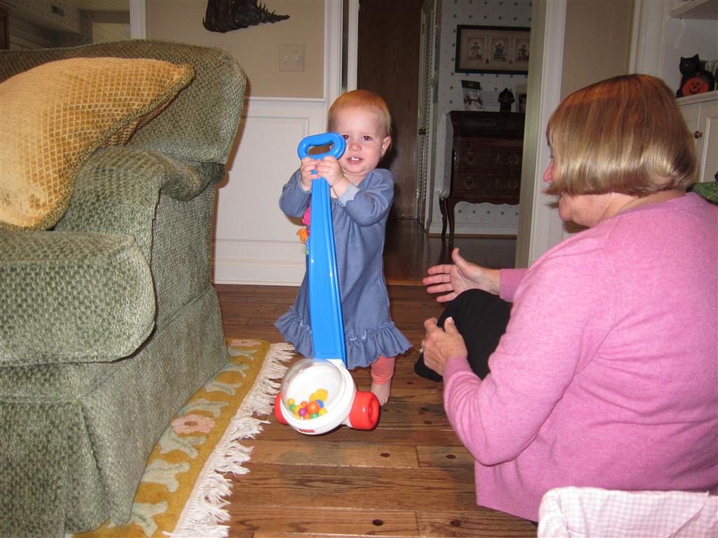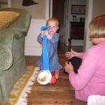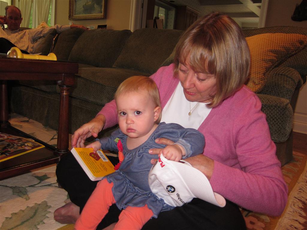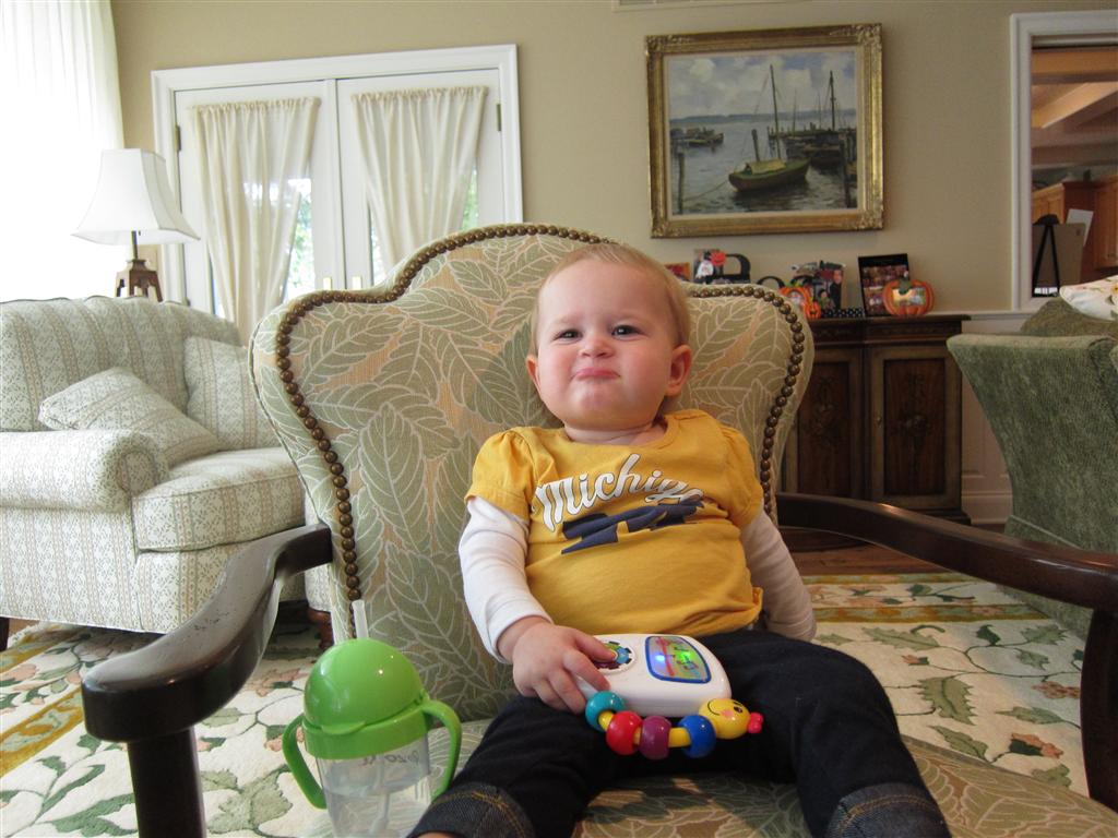 Eleanor had a week full of fall fun! Early in the week she took a trip to the aquarium for the first time. The ducks were definitely the biggest hit (I know – ducks at an aquarium – who knew?). At home there was lots of chasing the cat, and a new habit of holding all sorts of items up to her ear as if she was talking on the phone. The second half of the week brought a trip to visit Grandma and Grandpa, and Aunt Susan, Uncle Gabe, Mackenzie, Jack and Ben. They all took good care of Eleanor while Mom and Dad hit the town for a wedding. Eleanor did pretty well, and Grandma got some good snuggle time. Eleanor mastered saying “Zee” and “Ak” for “Mackenzie” and “Jack”, but the “Bee” for “Ben” still needs work.