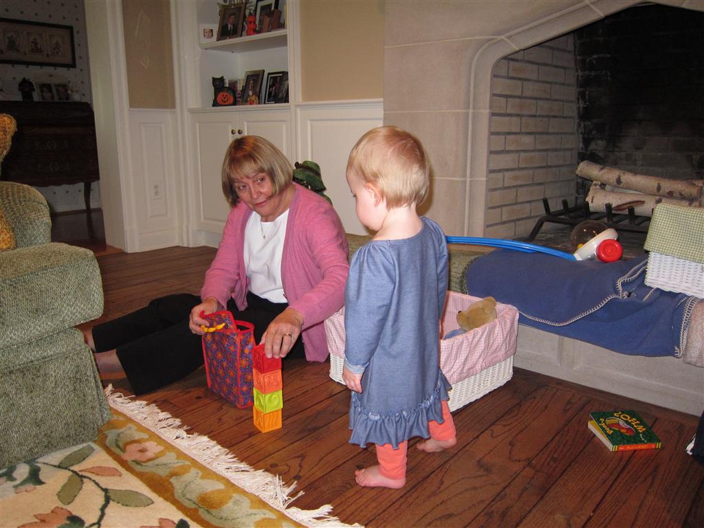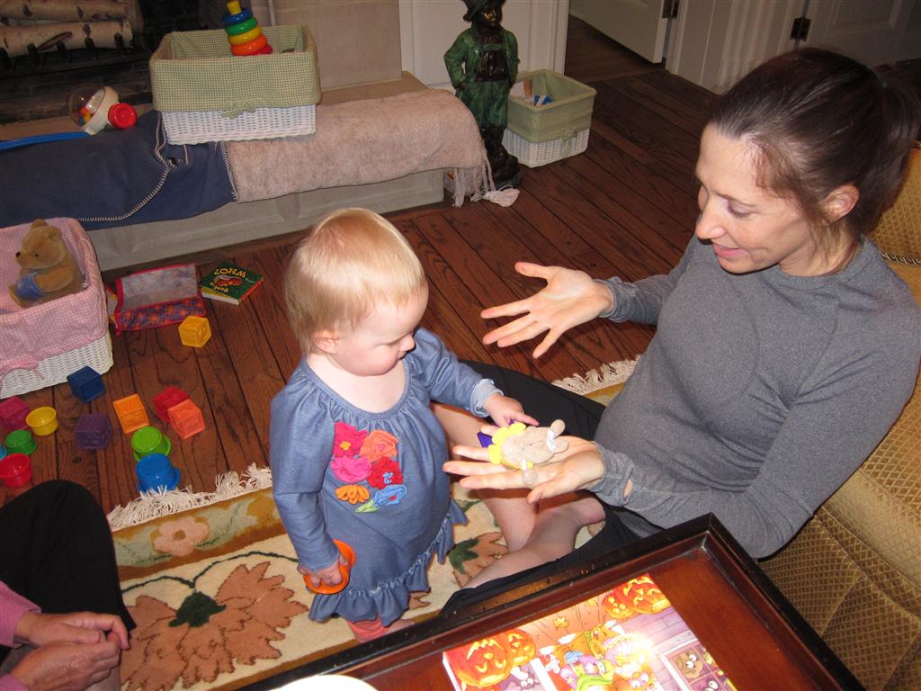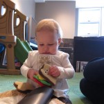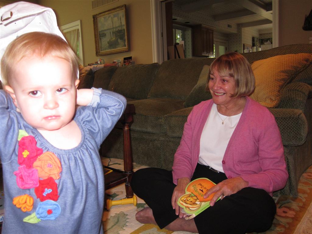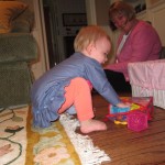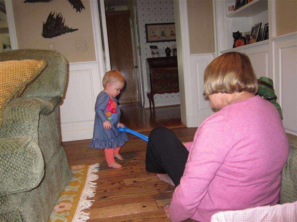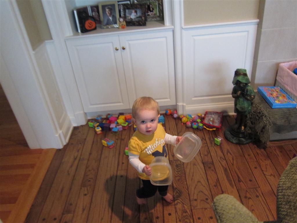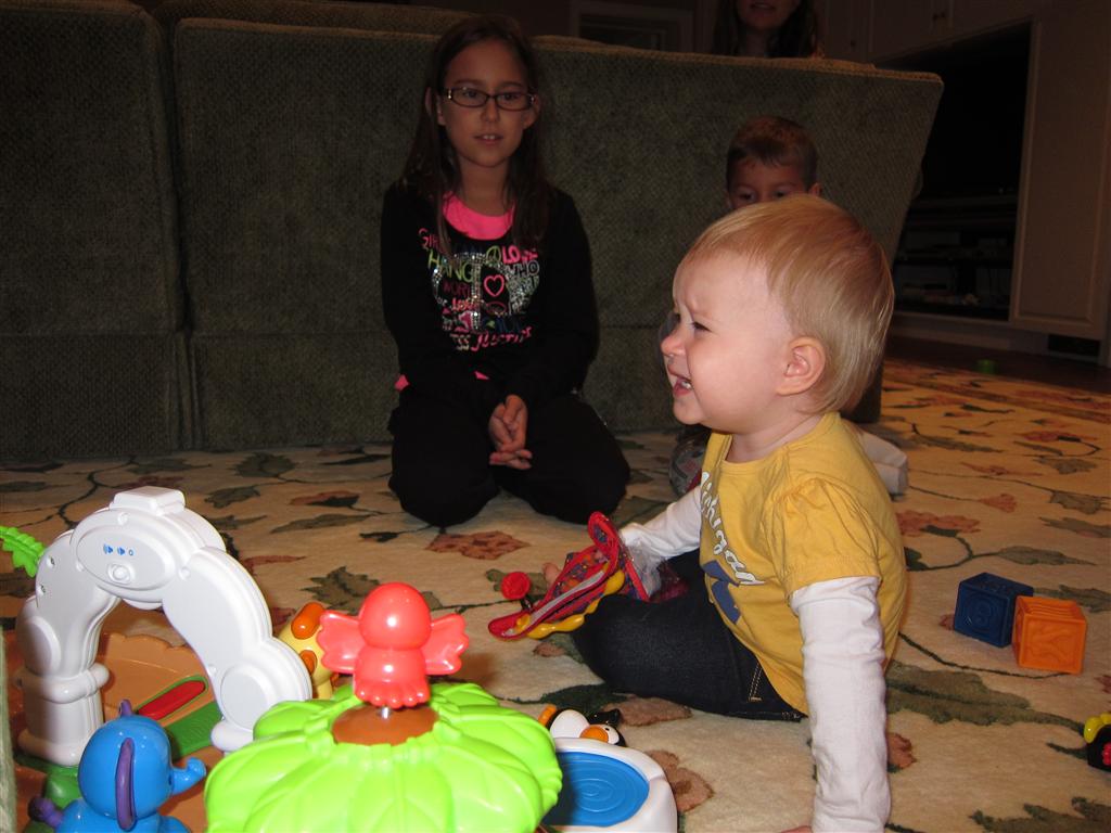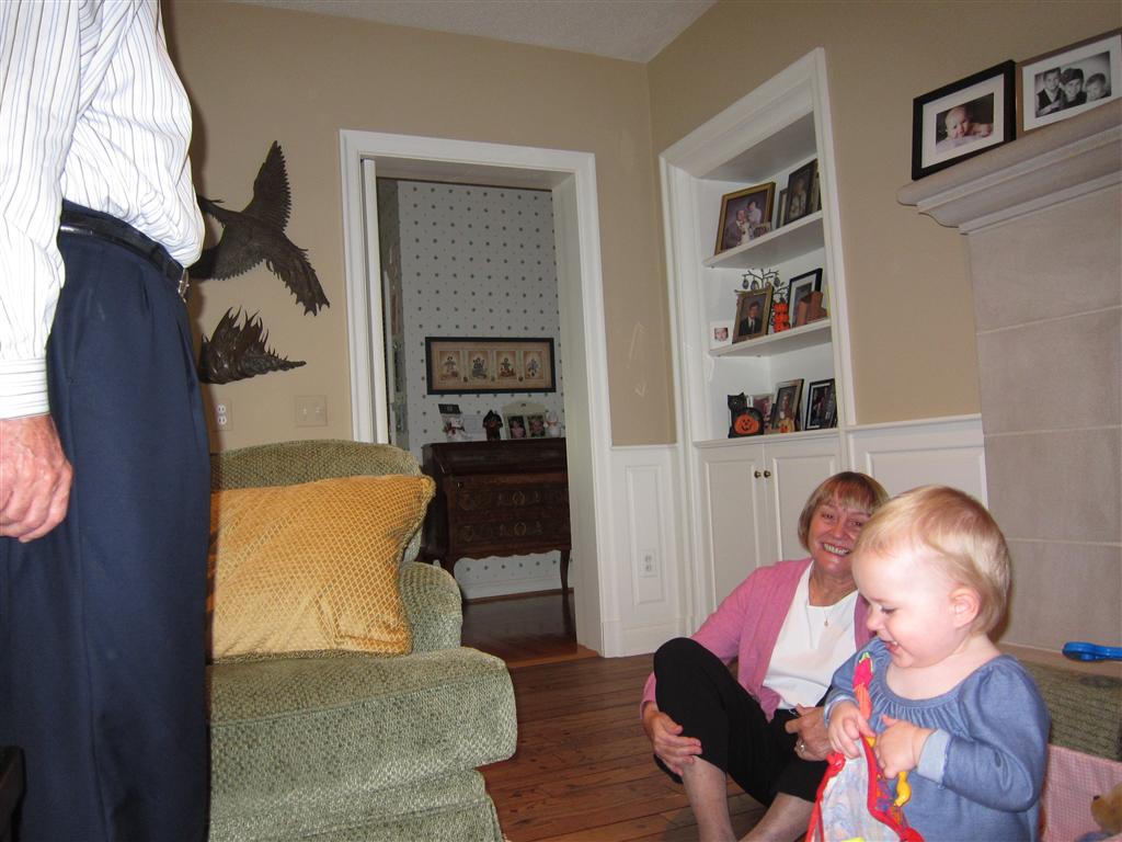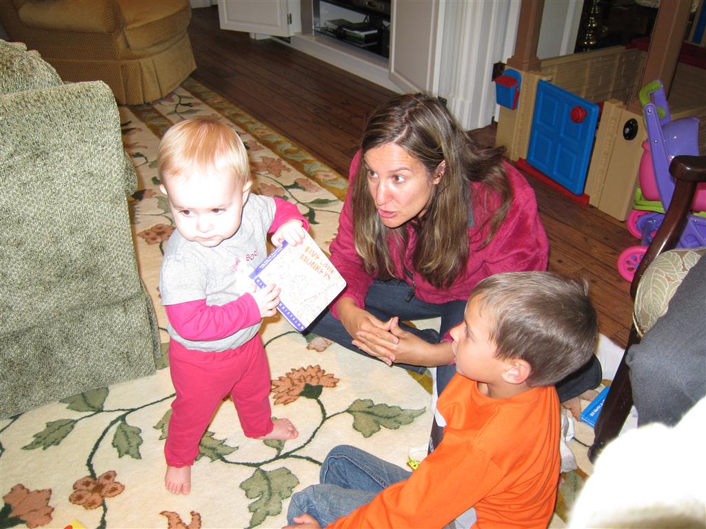 Eleanor had a week full of fall fun! Early in the week she took a trip to the aquarium for the first time. The ducks were definitely the biggest hit (I know – ducks at an aquarium – who knew?). At home there was lots of chasing the cat, and a new habit of holding all sorts of items up to her ear as if she was talking on the phone. The second half of the week brought a trip to visit Grandma and Grandpa, and Aunt Susan, Uncle Gabe, Mackenzie, Jack and Ben. They all took good care of Eleanor while Mom and Dad hit the town for a wedding. Eleanor did pretty well, and Grandma got some good snuggle time. Eleanor mastered saying “Zee” and “Ak” for “Mackenzie” and “Jack”, but the “Bee” for “Ben” still needs work.