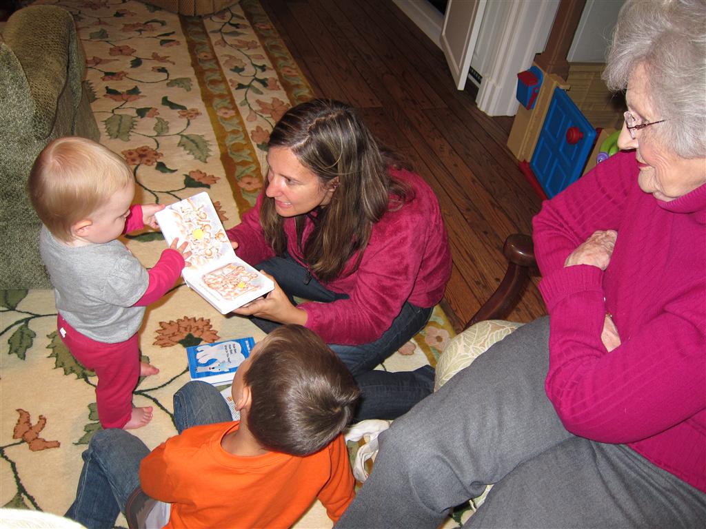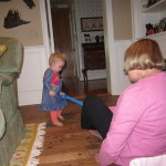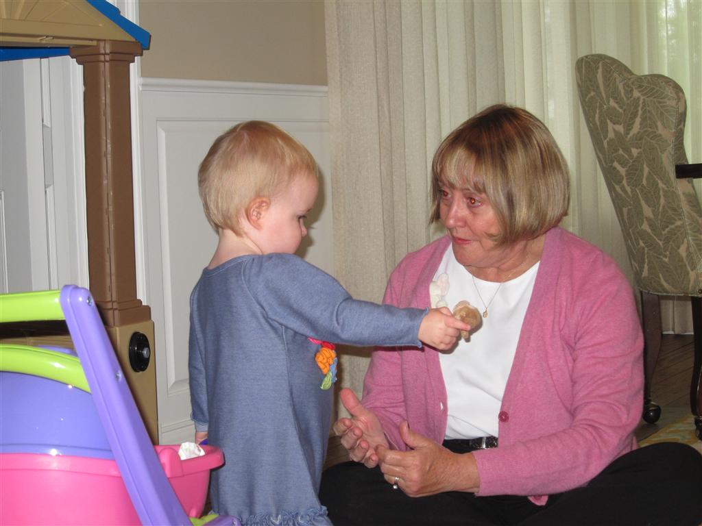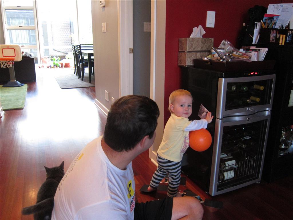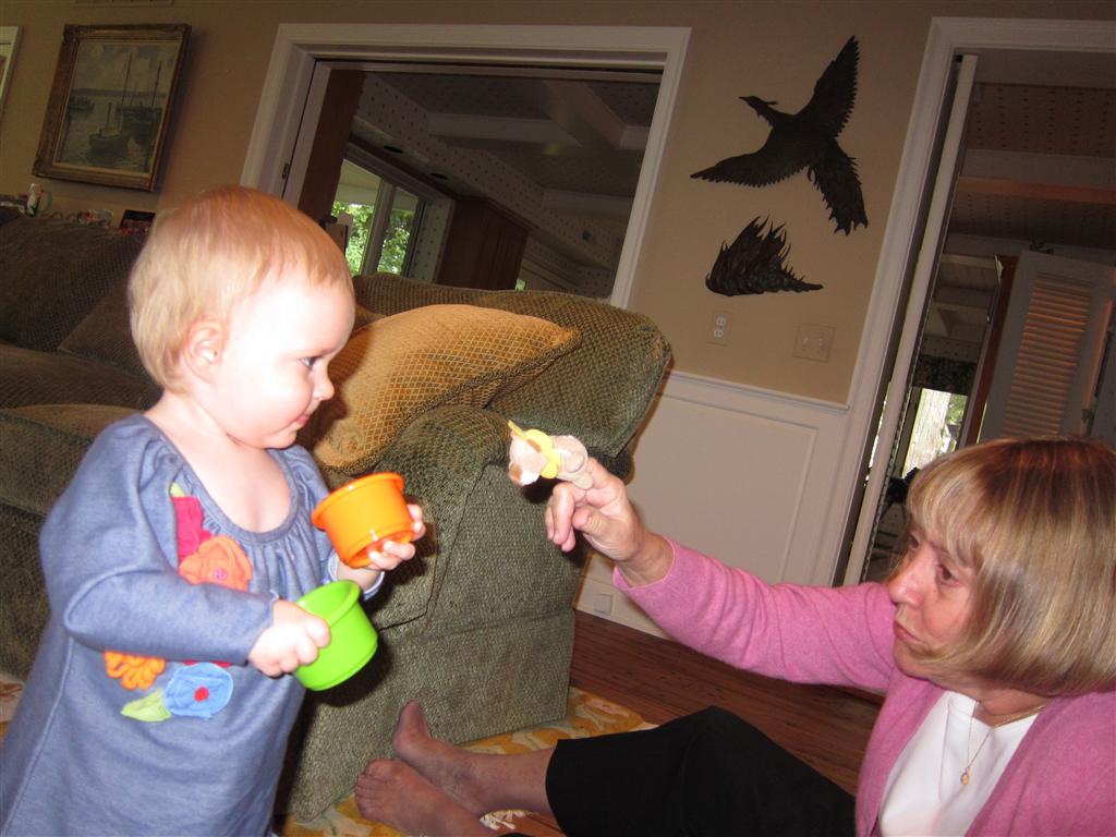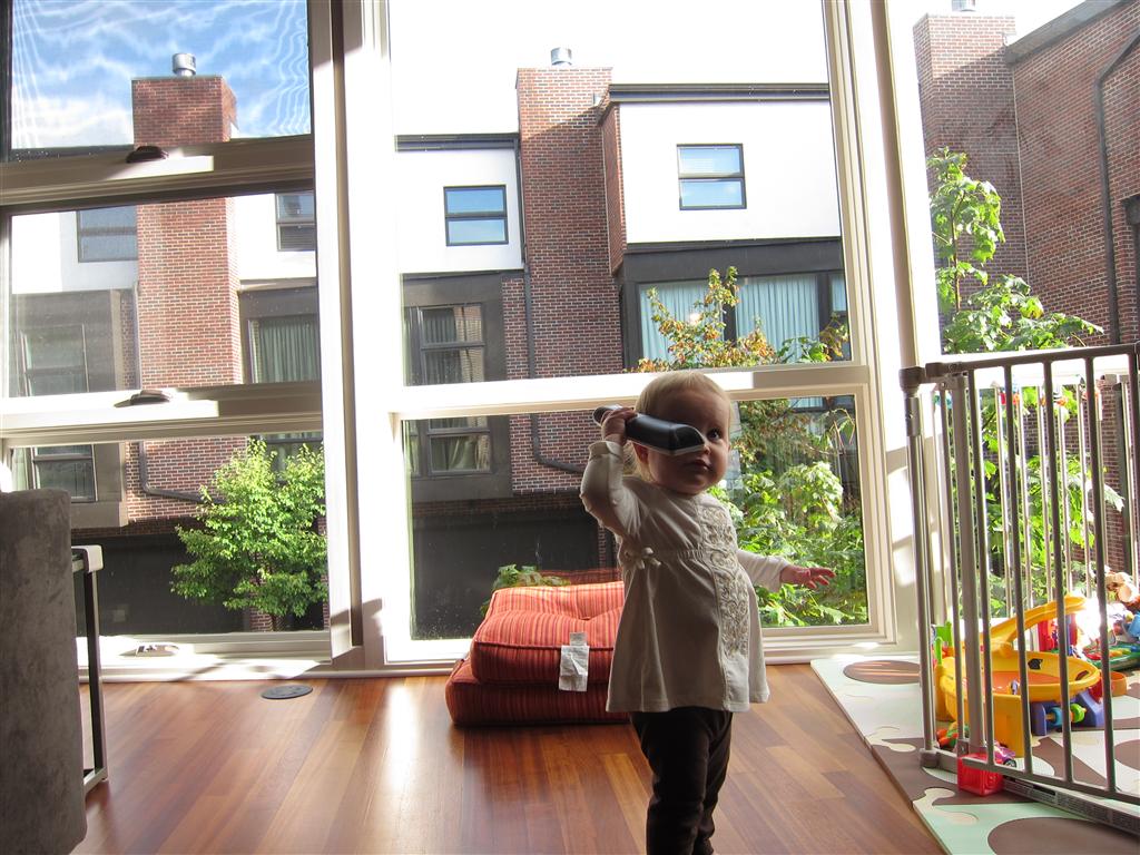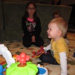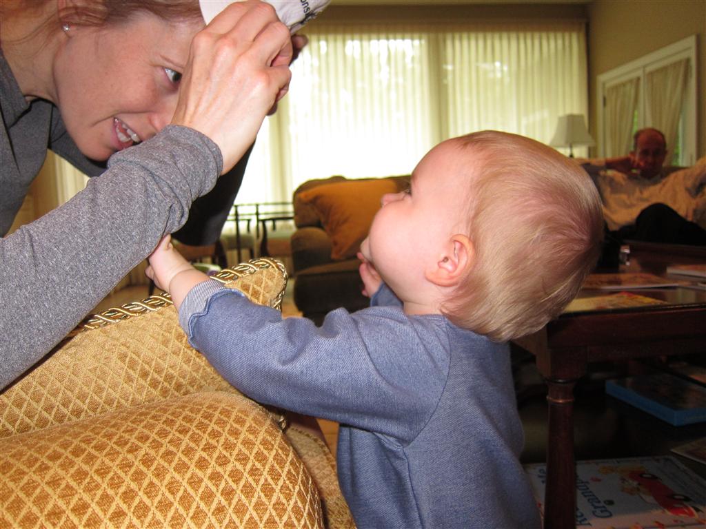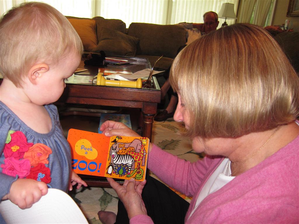 Eleanor had a week full of fall fun! Early in the week she took a trip to the aquarium for the first time. The ducks were definitely the biggest hit (I know – ducks at an aquarium – who knew?). At home there was lots of chasing the cat, and a new habit of holding all sorts of items up to her ear as if she was talking on the phone. The second half of the week brought a trip to visit Grandma and Grandpa, and Aunt Susan, Uncle Gabe, Mackenzie, Jack and Ben. They all took good care of Eleanor while Mom and Dad hit the town for a wedding. Eleanor did pretty well, and Grandma got some good snuggle time. Eleanor mastered saying “Zee” and “Ak” for “Mackenzie” and “Jack”, but the “Bee” for “Ben” still needs work.