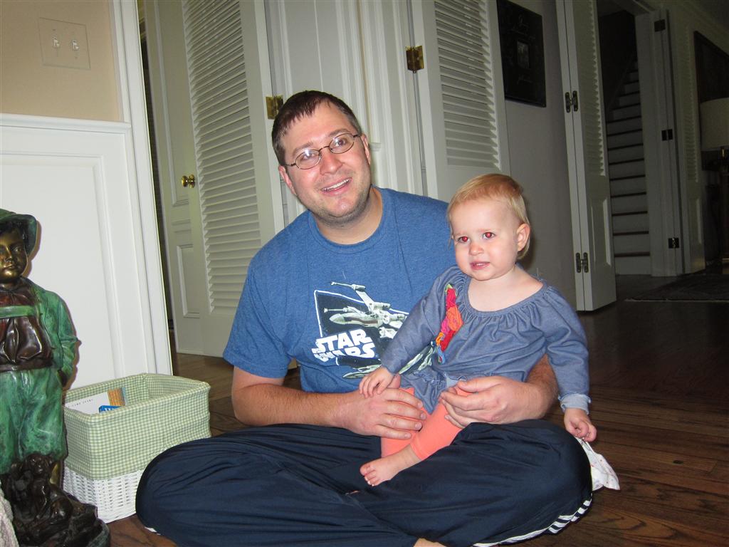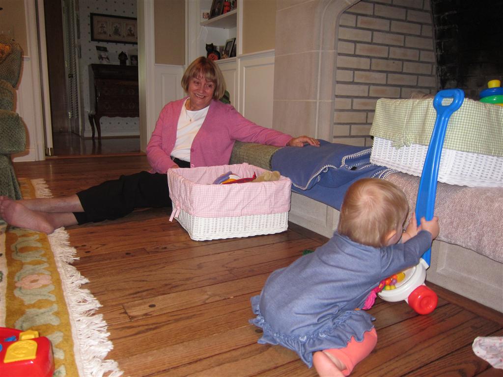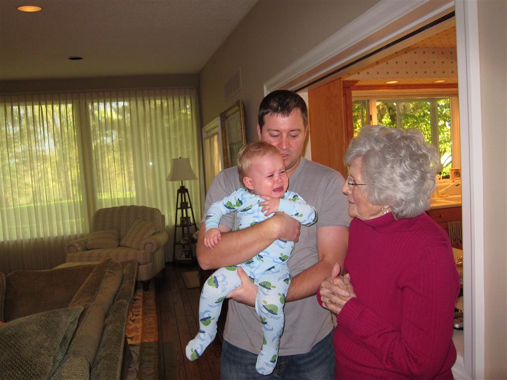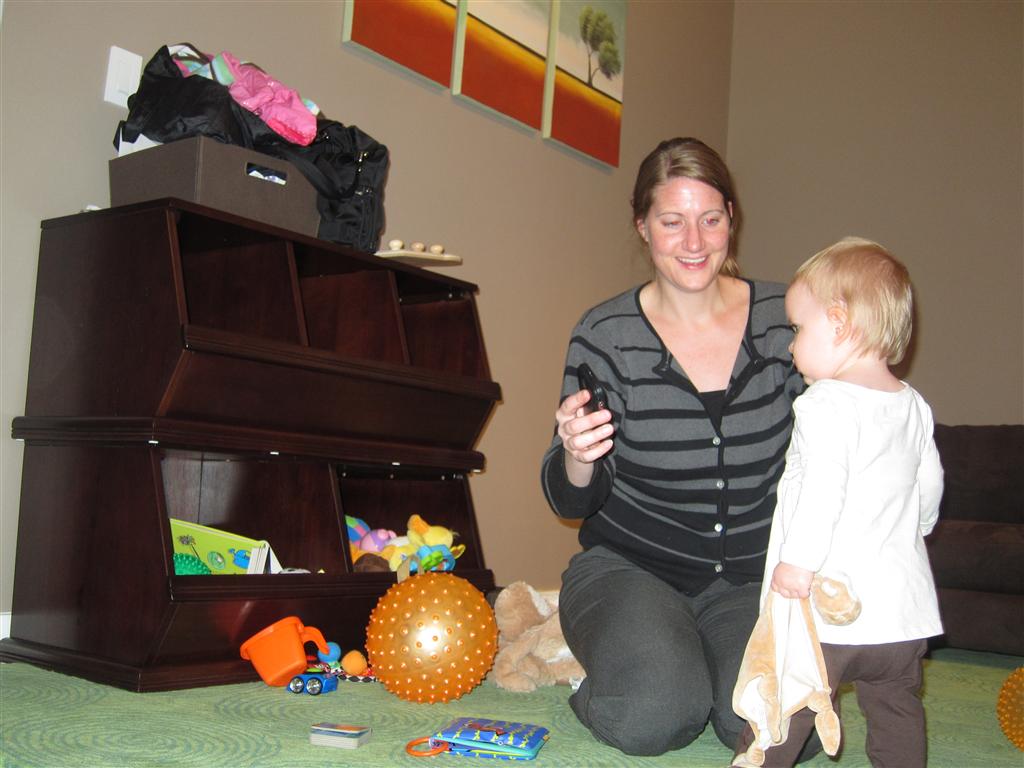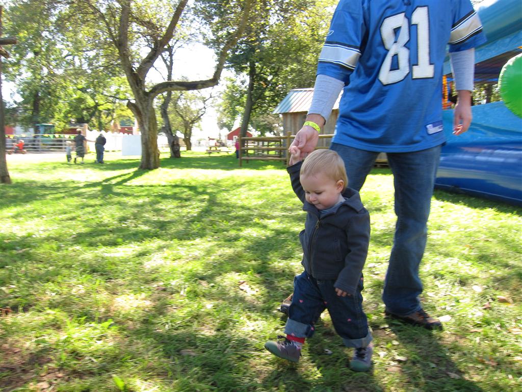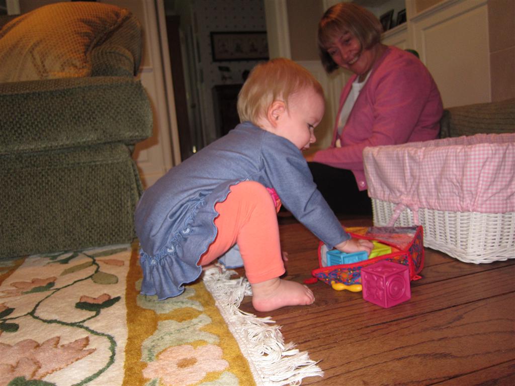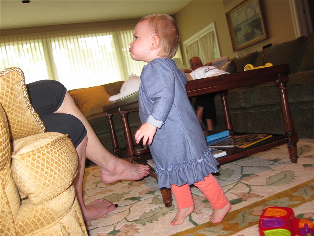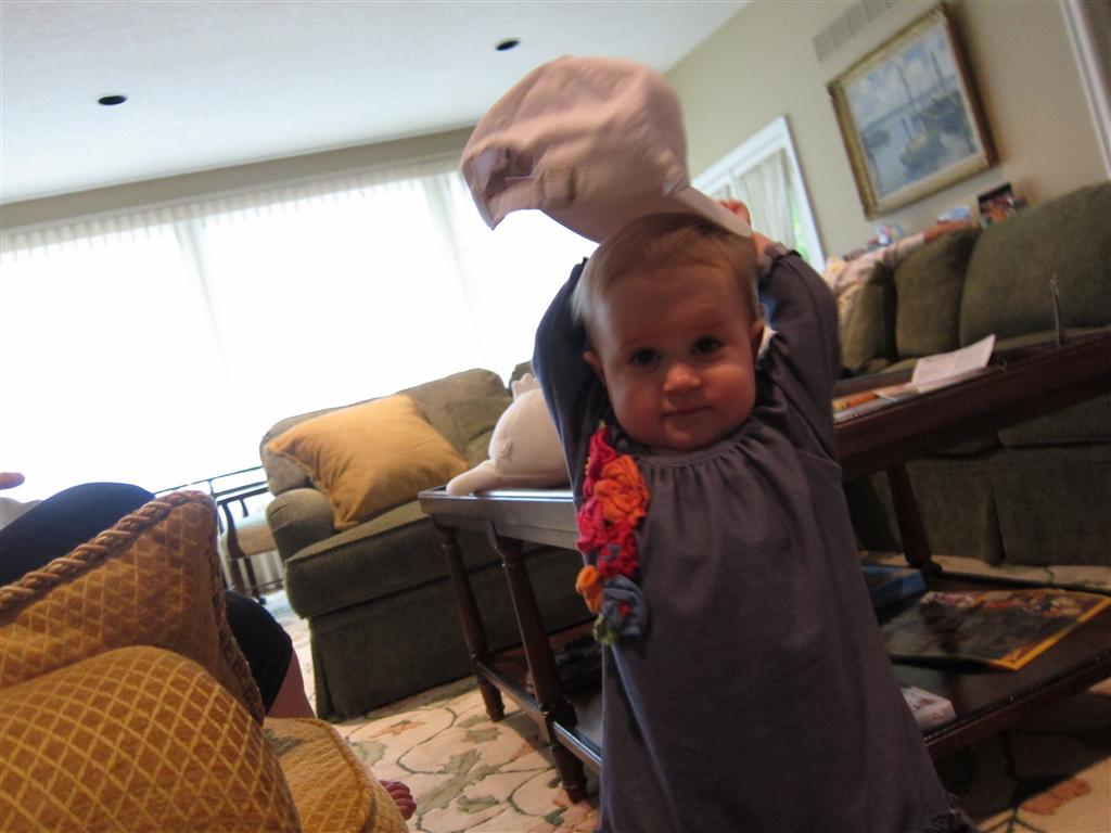 Eleanor had a week full of fall fun! Early in the week she took a trip to the aquarium for the first time. The ducks were definitely the biggest hit (I know – ducks at an aquarium – who knew?). At home there was lots of chasing the cat, and a new habit of holding all sorts of items up to her ear as if she was talking on the phone. The second half of the week brought a trip to visit Grandma and Grandpa, and Aunt Susan, Uncle Gabe, Mackenzie, Jack and Ben. They all took good care of Eleanor while Mom and Dad hit the town for a wedding. Eleanor did pretty well, and Grandma got some good snuggle time. Eleanor mastered saying “Zee” and “Ak” for “Mackenzie” and “Jack”, but the “Bee” for “Ben” still needs work.