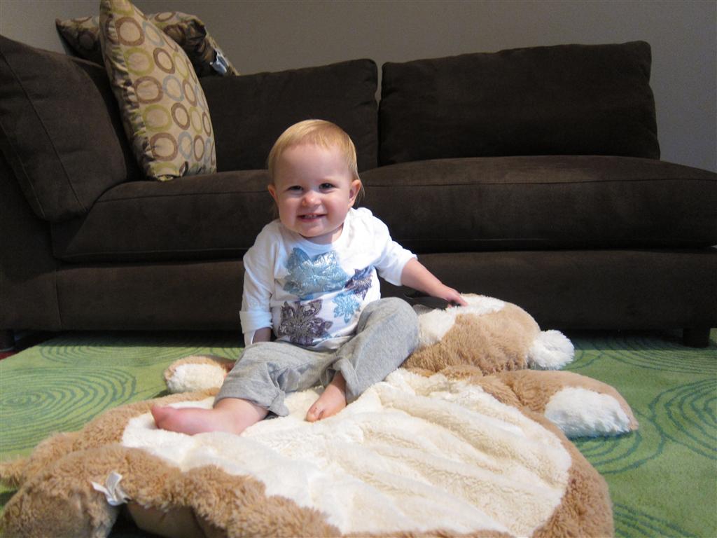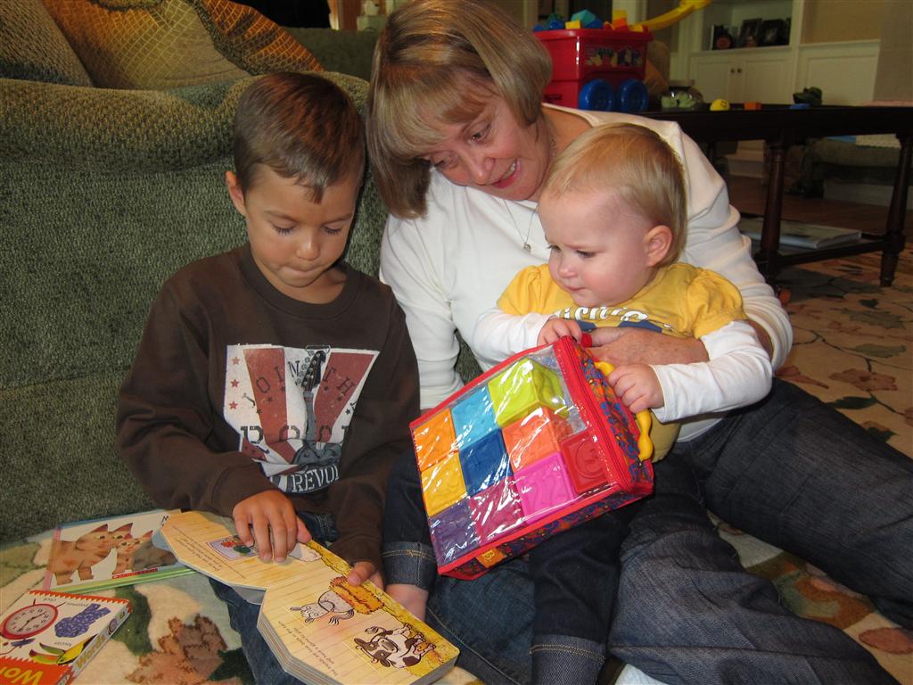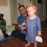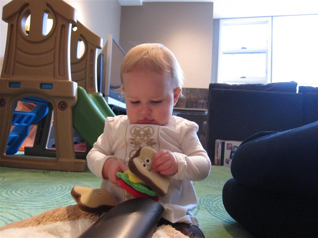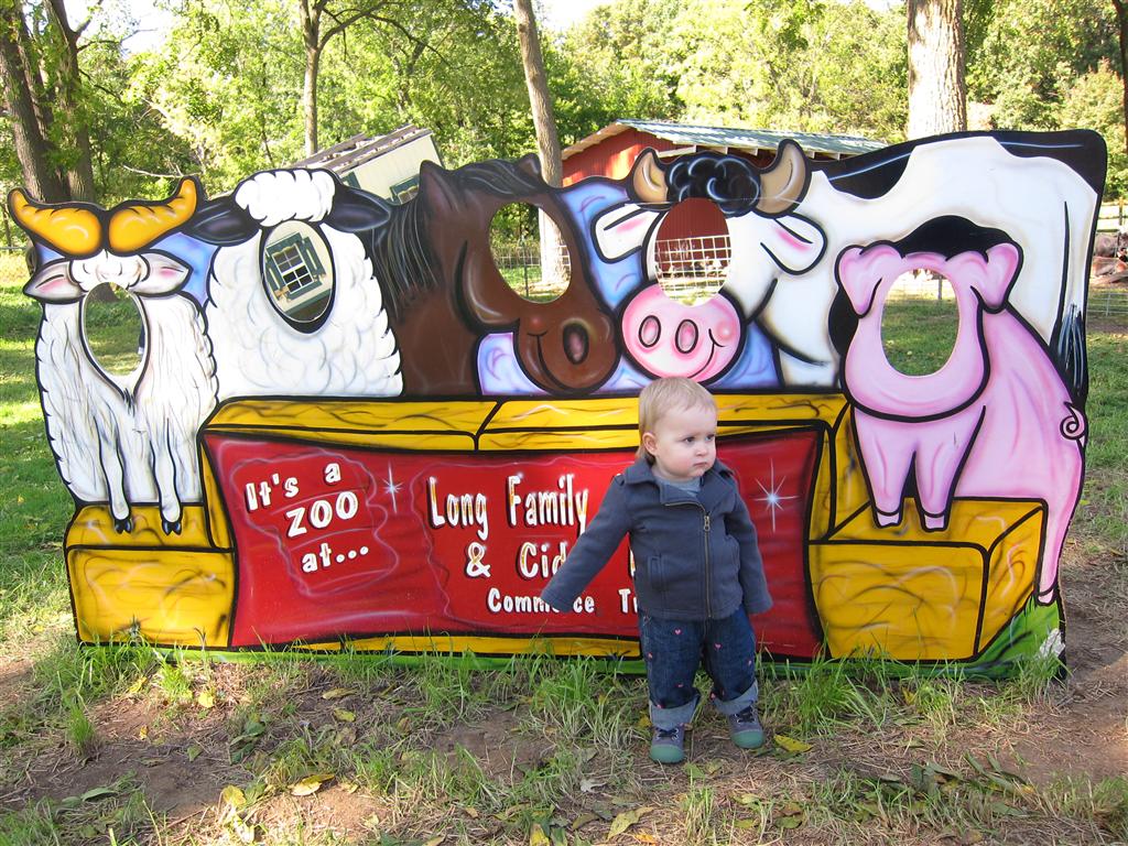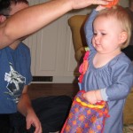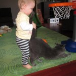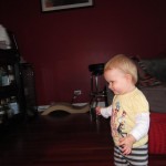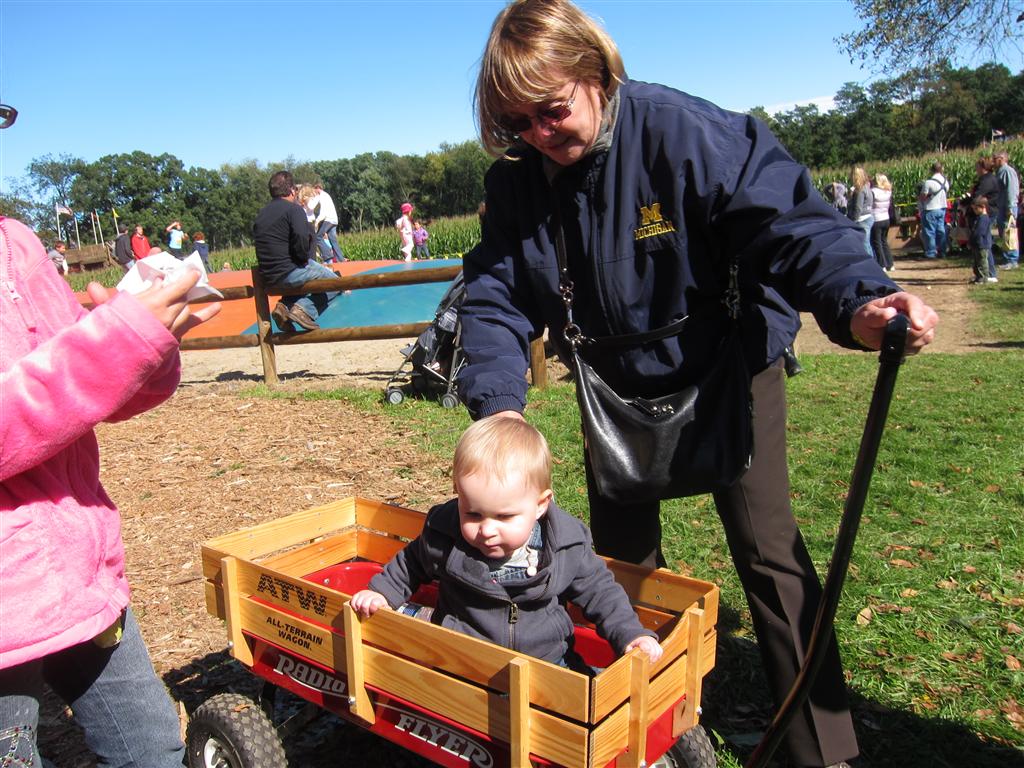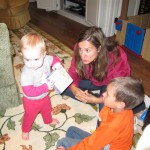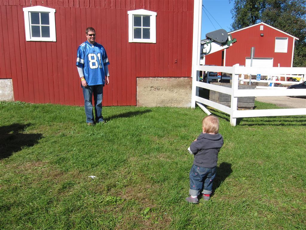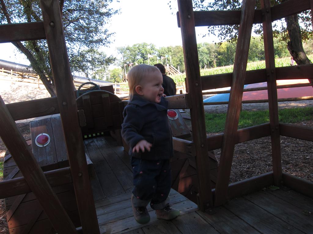 Eleanor had a week full of fall fun! Early in the week she took a trip to the aquarium for the first time. The ducks were definitely the biggest hit (I know – ducks at an aquarium – who knew?). At home there was lots of chasing the cat, and a new habit of holding all sorts of items up to her ear as if she was talking on the phone. The second half of the week brought a trip to visit Grandma and Grandpa, and Aunt Susan, Uncle Gabe, Mackenzie, Jack and Ben. They all took good care of Eleanor while Mom and Dad hit the town for a wedding. Eleanor did pretty well, and Grandma got some good snuggle time. Eleanor mastered saying “Zee” and “Ak” for “Mackenzie” and “Jack”, but the “Bee” for “Ben” still needs work.