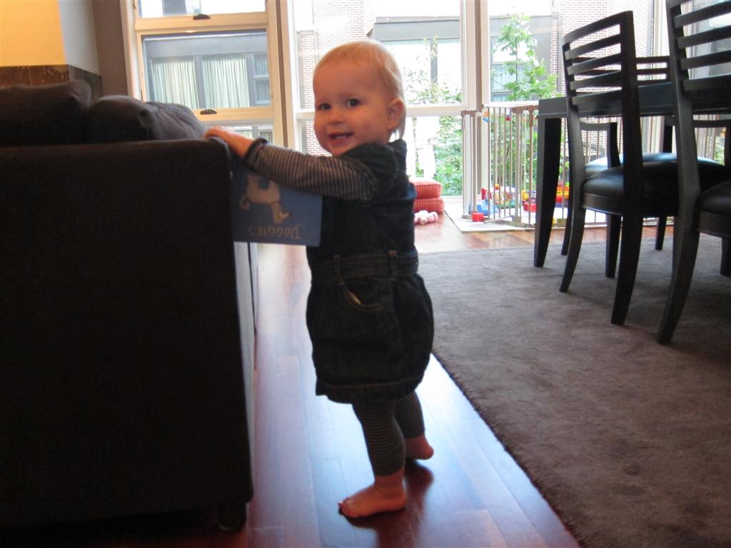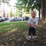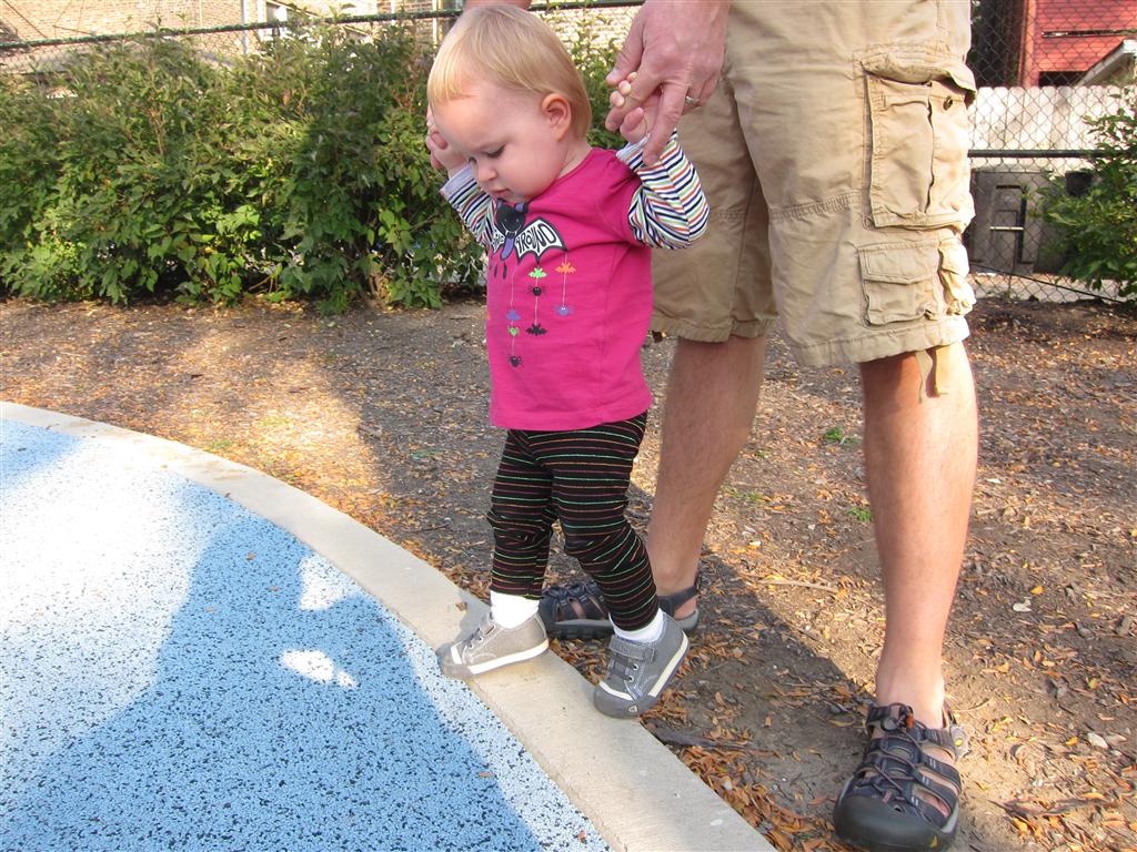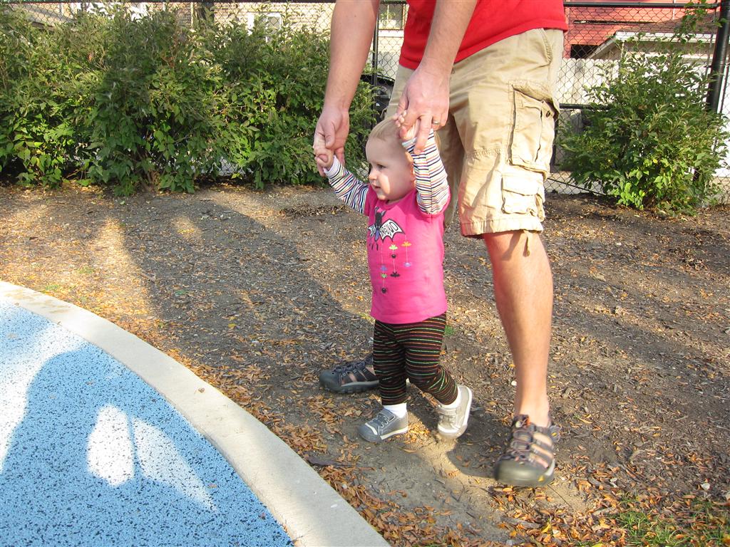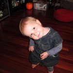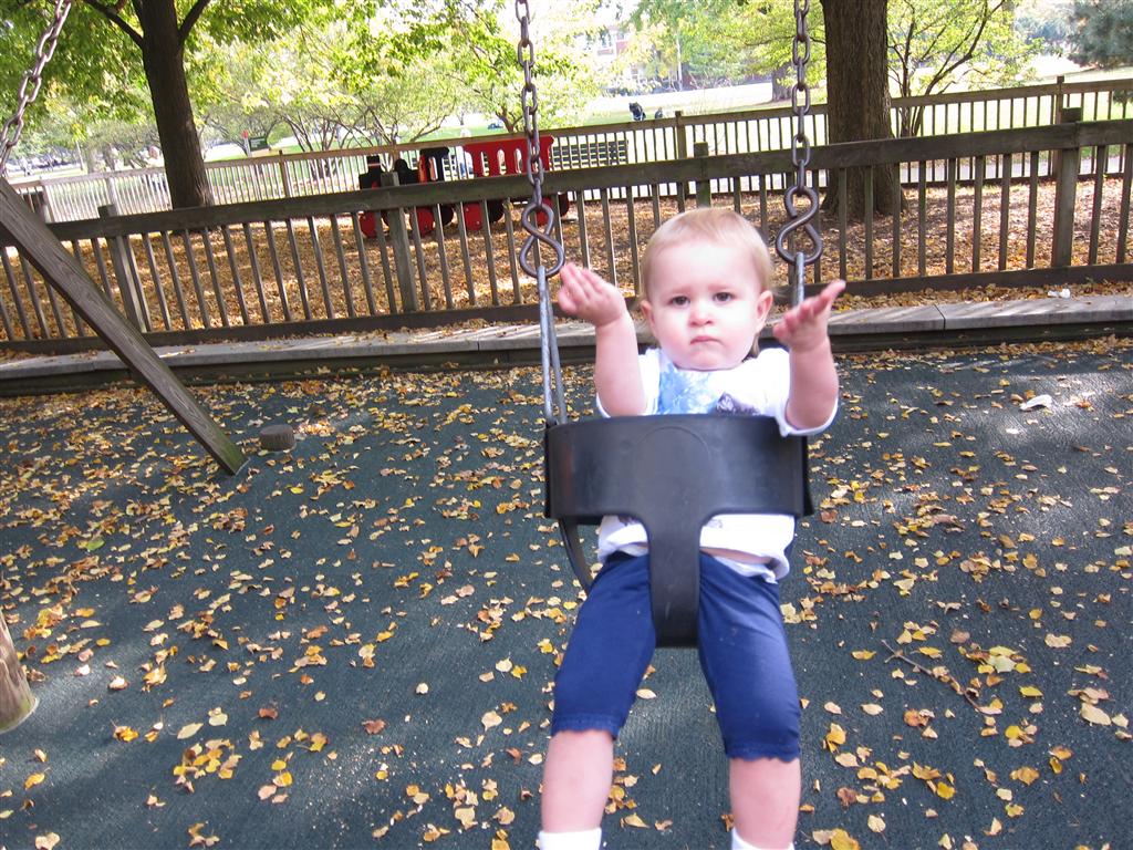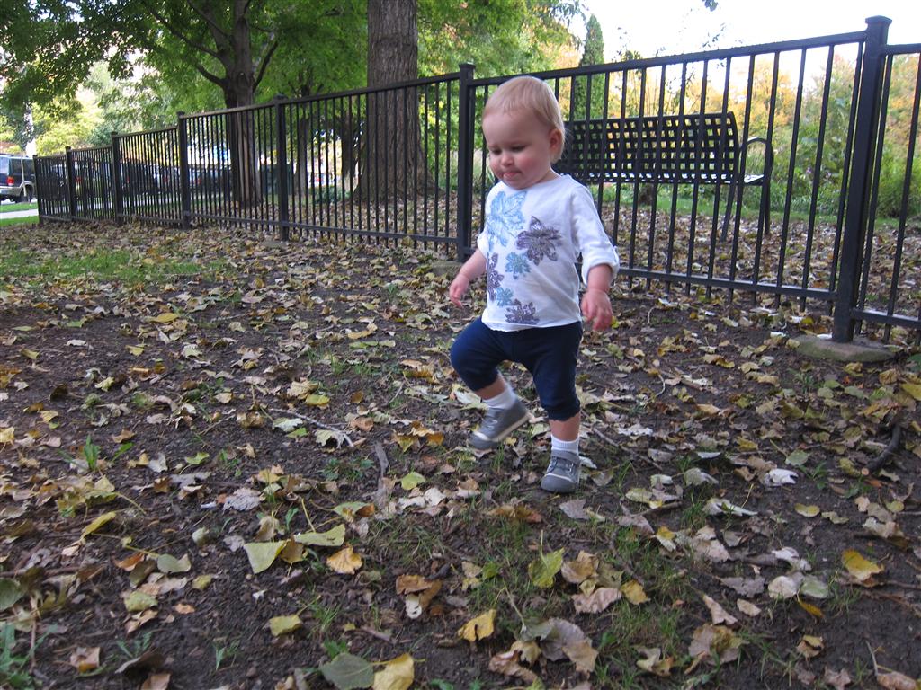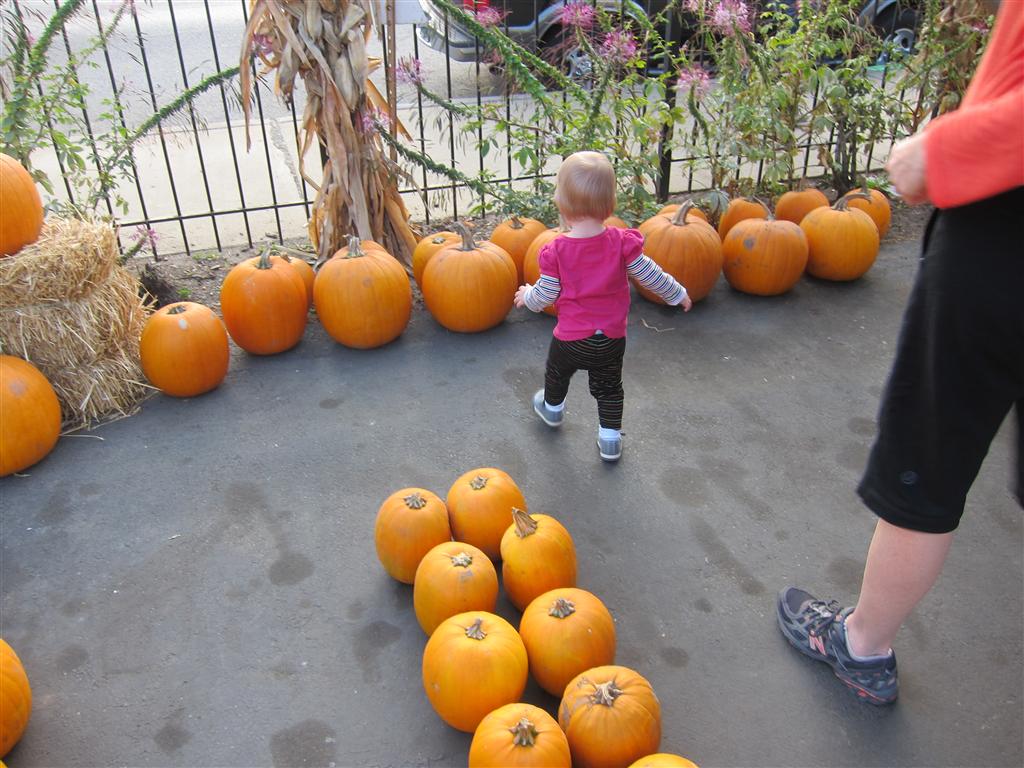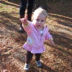 Eleanor took a trip to the pumpkin patch this week, among other fun fall activities, and also had her first swim lesson with Dad. She also went to a music performance where she mostly ignored the singer, but did mistake an orange crayon for a carrot. Fortunately, Mom noticed before too much wax was ingested. Eleanor is learning some hand signals to the song “No more monkeys jumping on the bed”, which is very cute. We will have to try and get it on video. She is also working on stepping up on small steps, she especially likes the cat’s scratch pad and small drops between slabs on sidewalks, as well as transitioning from sidewalk to grass. She is very proud of herself when she successfully navigates one by herself. Her last new trick of the week is grabbing her belly button when asked :)