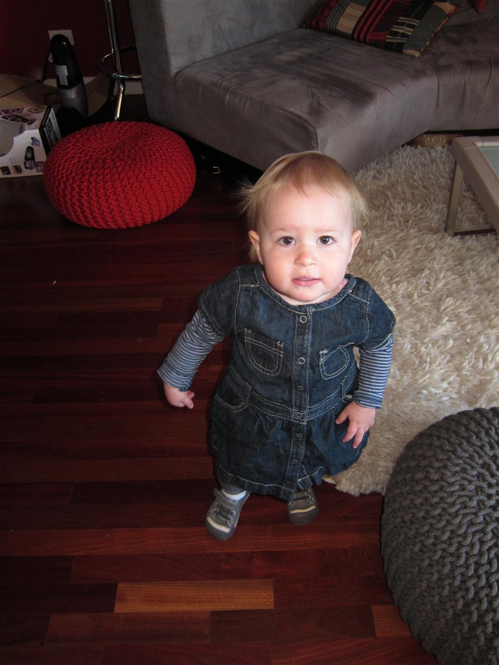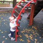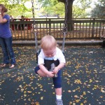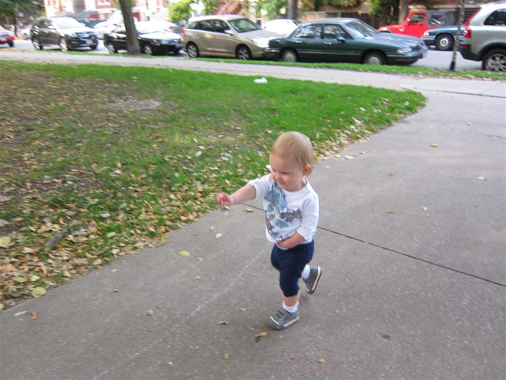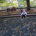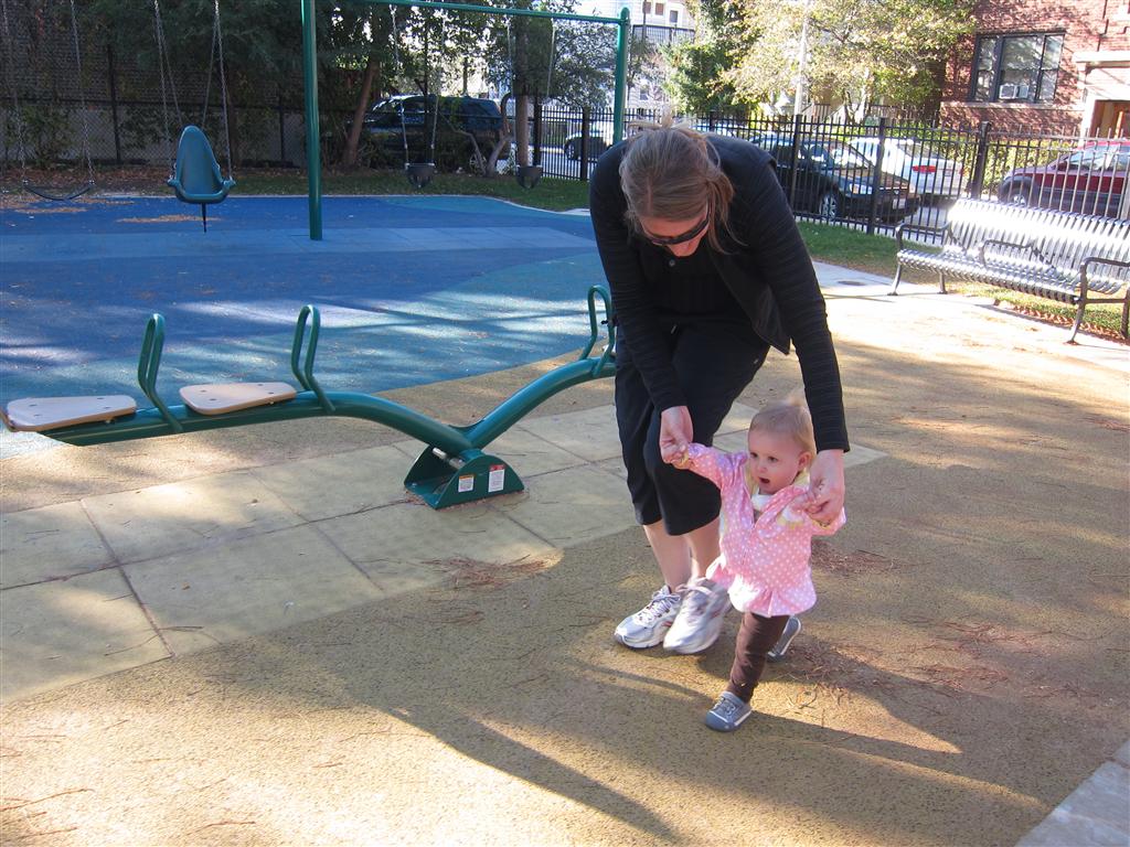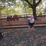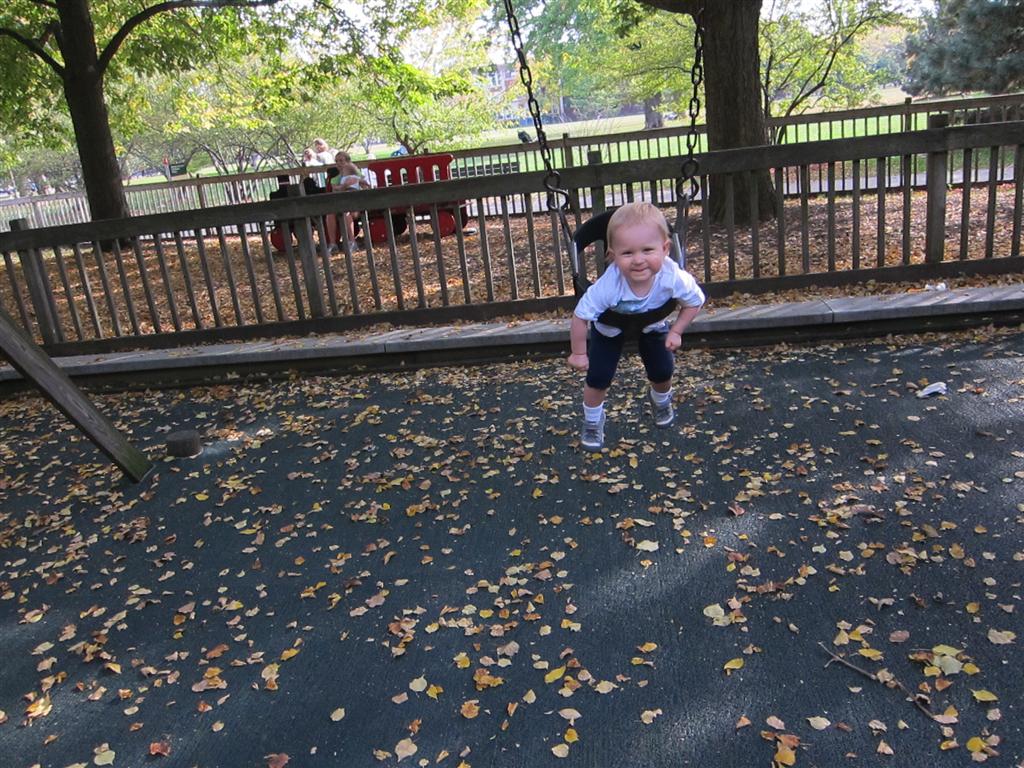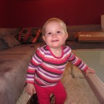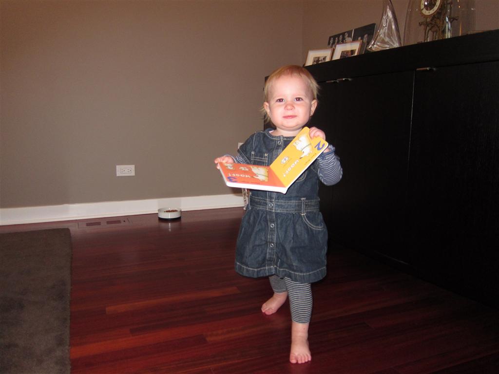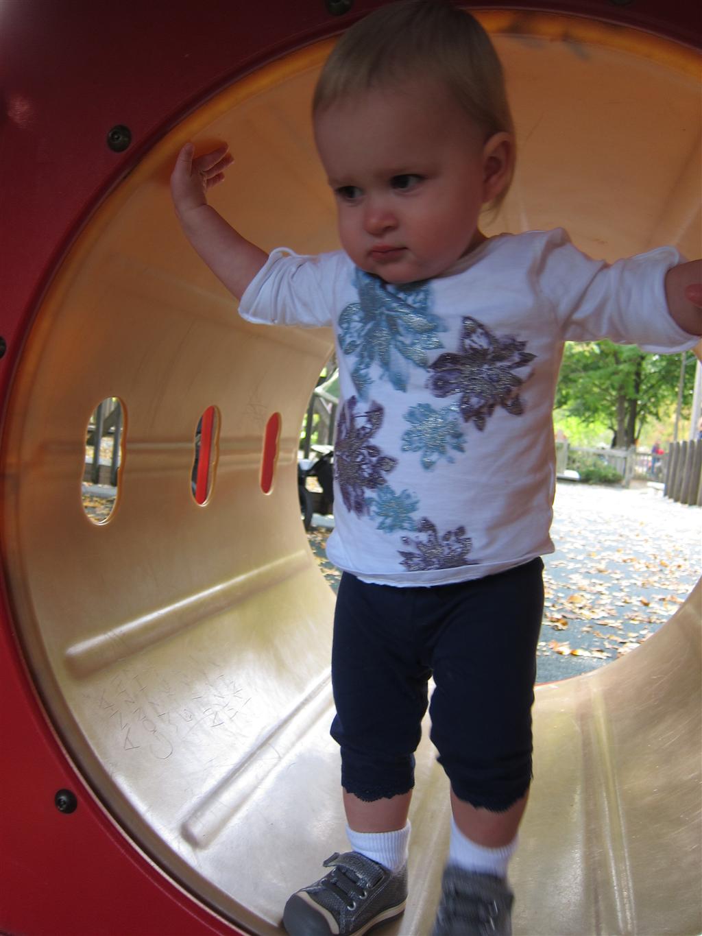 Eleanor took a trip to the pumpkin patch this week, among other fun fall activities, and also had her first swim lesson with Dad. She also went to a music performance where she mostly ignored the singer, but did mistake an orange crayon for a carrot. Fortunately, Mom noticed before too much wax was ingested. Eleanor is learning some hand signals to the song “No more monkeys jumping on the bed”, which is very cute. We will have to try and get it on video. She is also working on stepping up on small steps, she especially likes the cat’s scratch pad and small drops between slabs on sidewalks, as well as transitioning from sidewalk to grass. She is very proud of herself when she successfully navigates one by herself. Her last new trick of the week is grabbing her belly button when asked :)