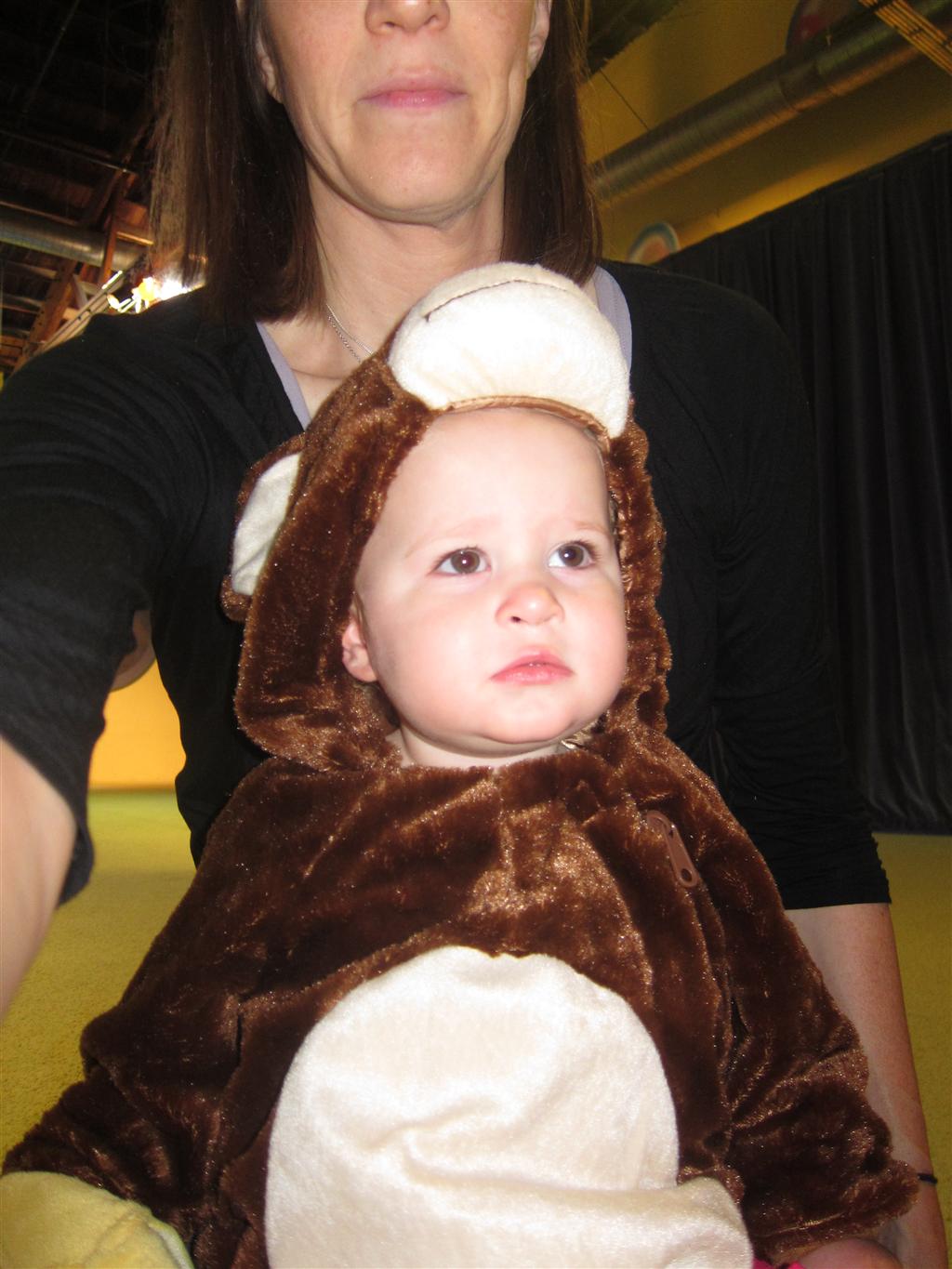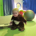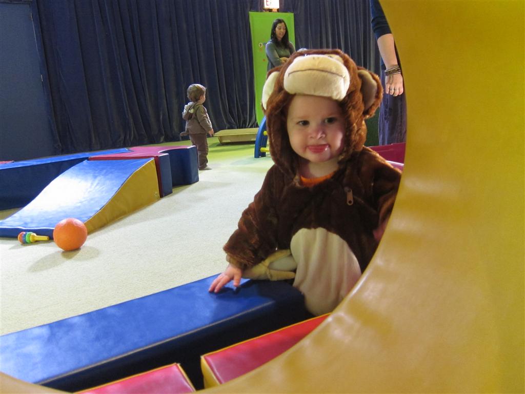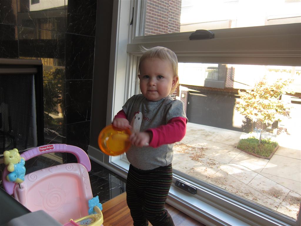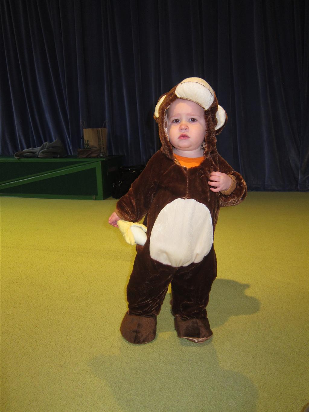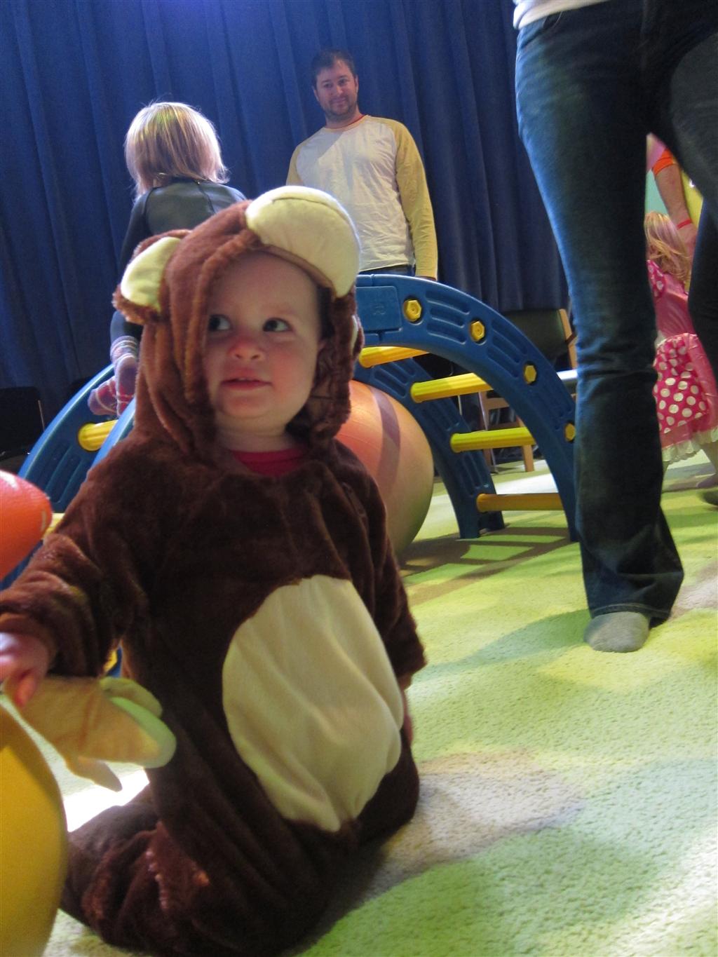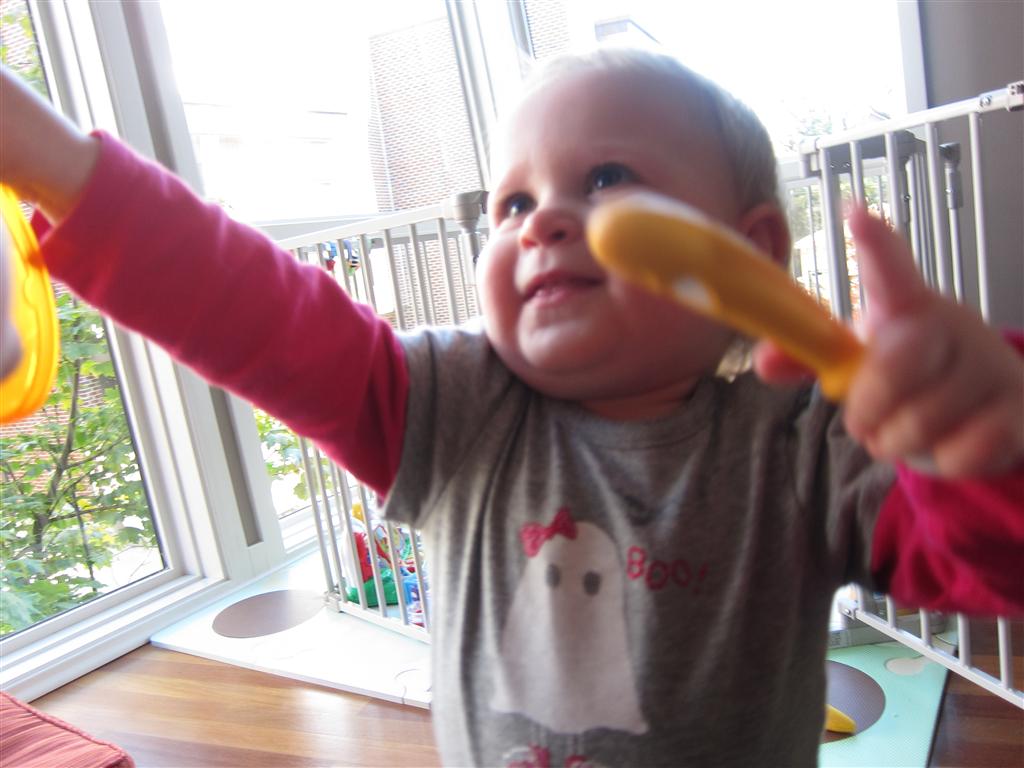 Eleanor maximized her costume time this week by participating in two Halloween parties, and Halloween is still coming up tomorrow! She dressed up as a monkey, a costume that she choose herself. While walking down the aisle at target, Eleanor got very excited pointing and making monkey sounds when she saw the costume on the shelf. A couple of her friends from music class also dressed up as monkeys, making for some fun pictures. Eleanor completed the monkey costume at the party on Sunday by picking up two cymbals. If only she had a box to hop out of :) In a notable first this week, Eleanor can now stack four blocks on top of each other. Her previous best was two, and mostly by accident. Now she is interested in trying to build towers as well as knock them down. While playing with our neighbor Zack, Eleanor watched him “march” and has picked that up. I even caught her “high stepping”