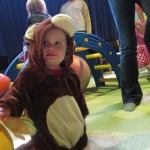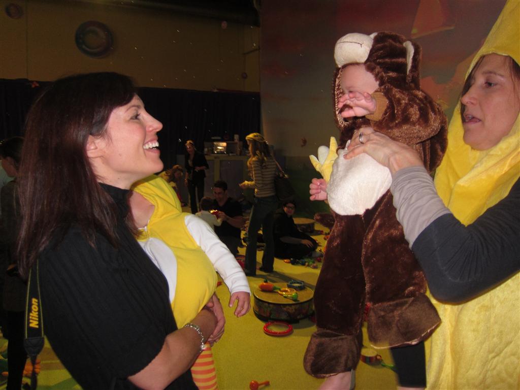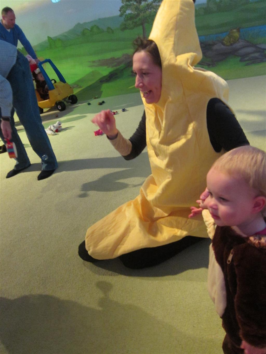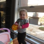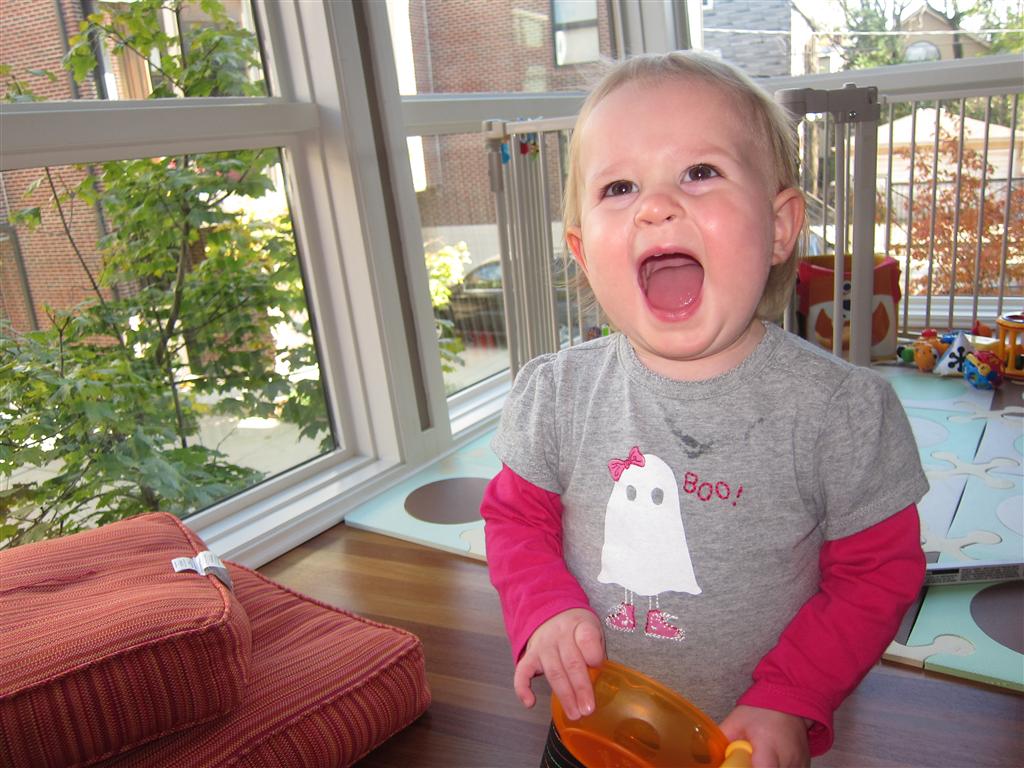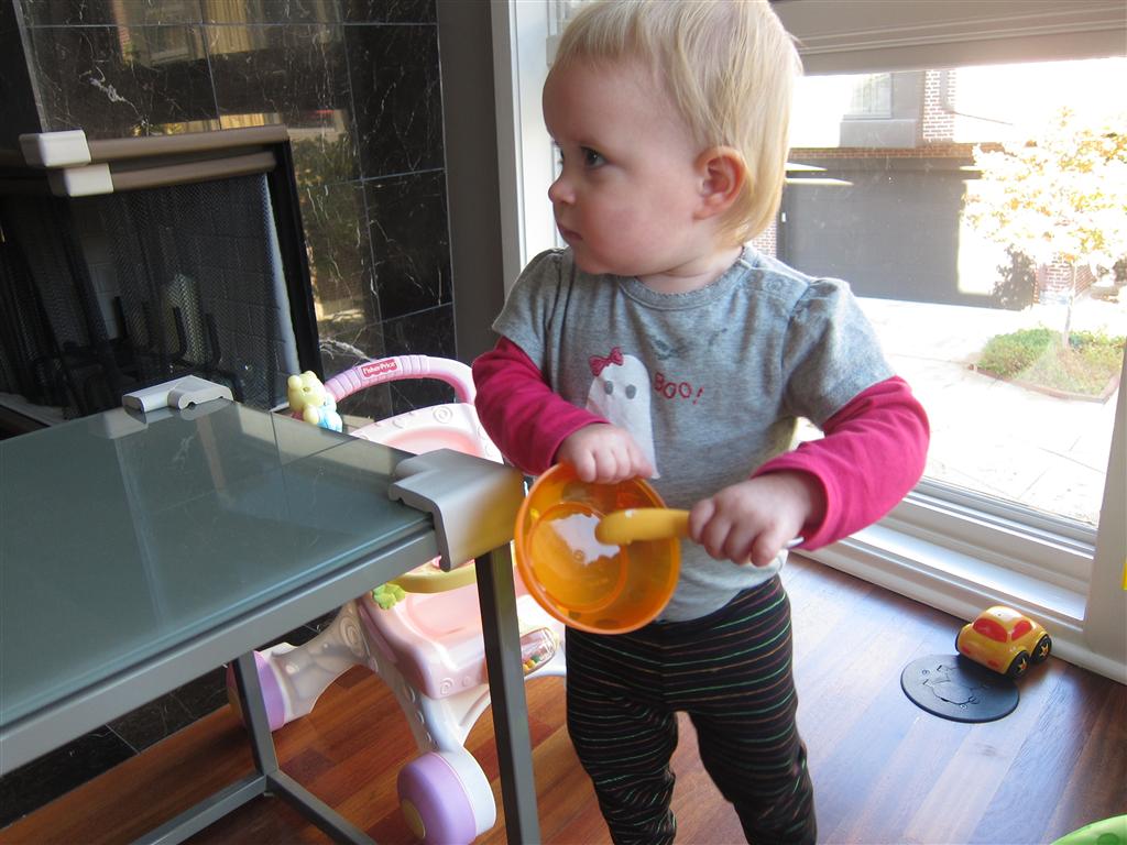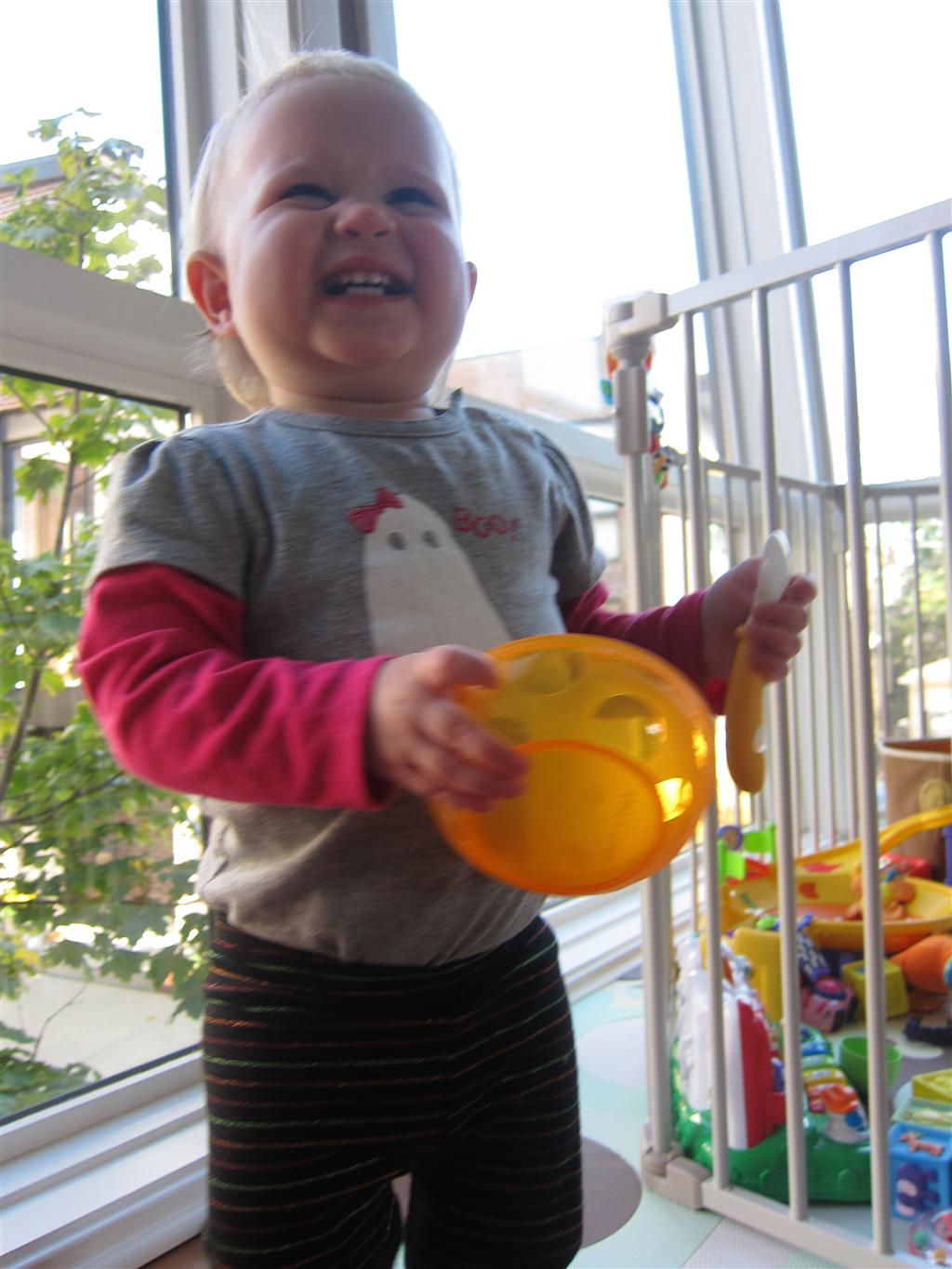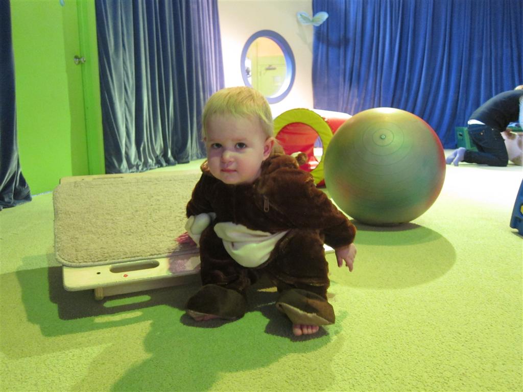 Eleanor maximized her costume time this week by participating in two Halloween parties, and Halloween is still coming up tomorrow! She dressed up as a monkey, a costume that she choose herself. While walking down the aisle at target, Eleanor got very excited pointing and making monkey sounds when she saw the costume on the shelf. A couple of her friends from music class also dressed up as monkeys, making for some fun pictures. Eleanor completed the monkey costume at the party on Sunday by picking up two cymbals. If only she had a box to hop out of :) In a notable first this week, Eleanor can now stack four blocks on top of each other. Her previous best was two, and mostly by accident. Now she is interested in trying to build towers as well as knock them down. While playing with our neighbor Zack, Eleanor watched him “march” and has picked that up. I even caught her “high stepping”