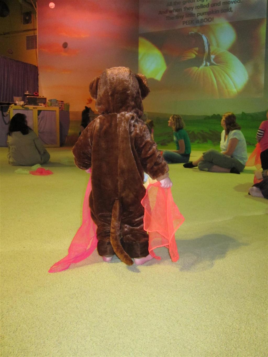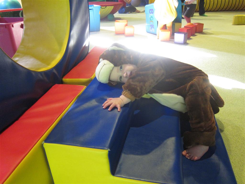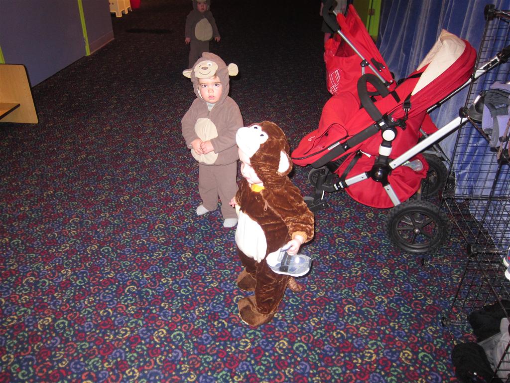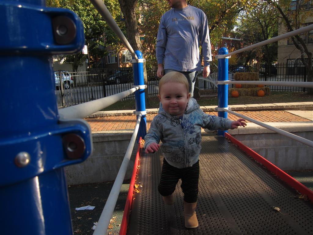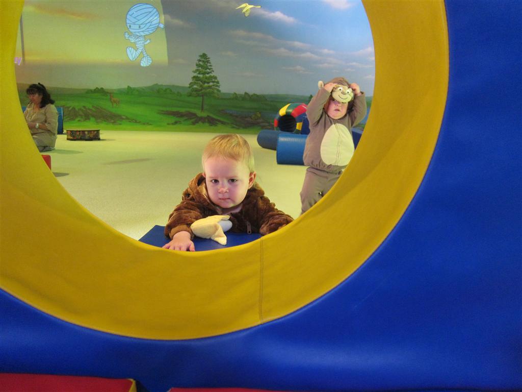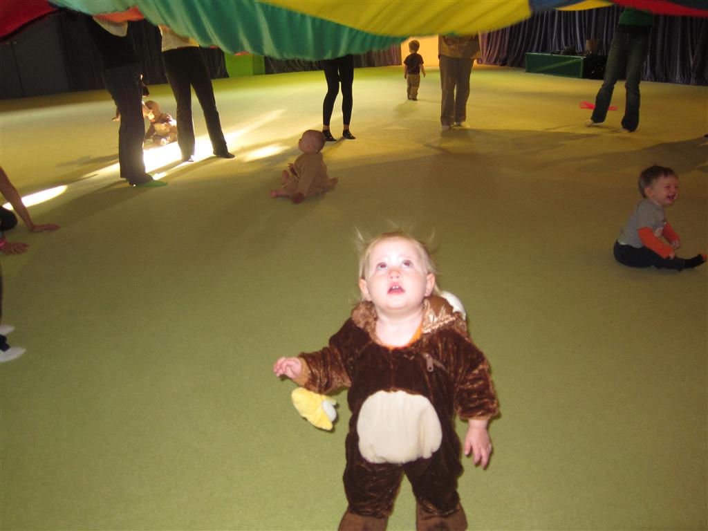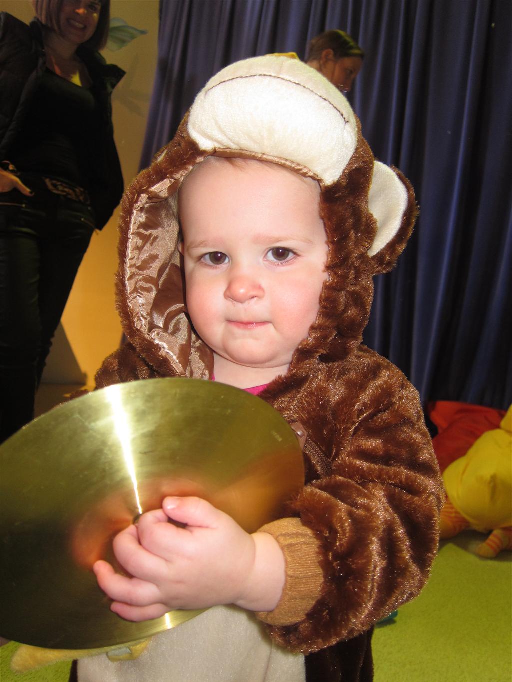 Eleanor maximized her costume time this week by participating in two Halloween parties, and Halloween is still coming up tomorrow! She dressed up as a monkey, a costume that she choose herself. While walking down the aisle at target, Eleanor got very excited pointing and making monkey sounds when she saw the costume on the shelf. A couple of her friends from music class also dressed up as monkeys, making for some fun pictures. Eleanor completed the monkey costume at the party on Sunday by picking up two cymbals. If only she had a box to hop out of :) In a notable first this week, Eleanor can now stack four blocks on top of each other. Her previous best was two, and mostly by accident. Now she is interested in trying to build towers as well as knock them down. While playing with our neighbor Zack, Eleanor watched him “march” and has picked that up. I even caught her “high stepping”