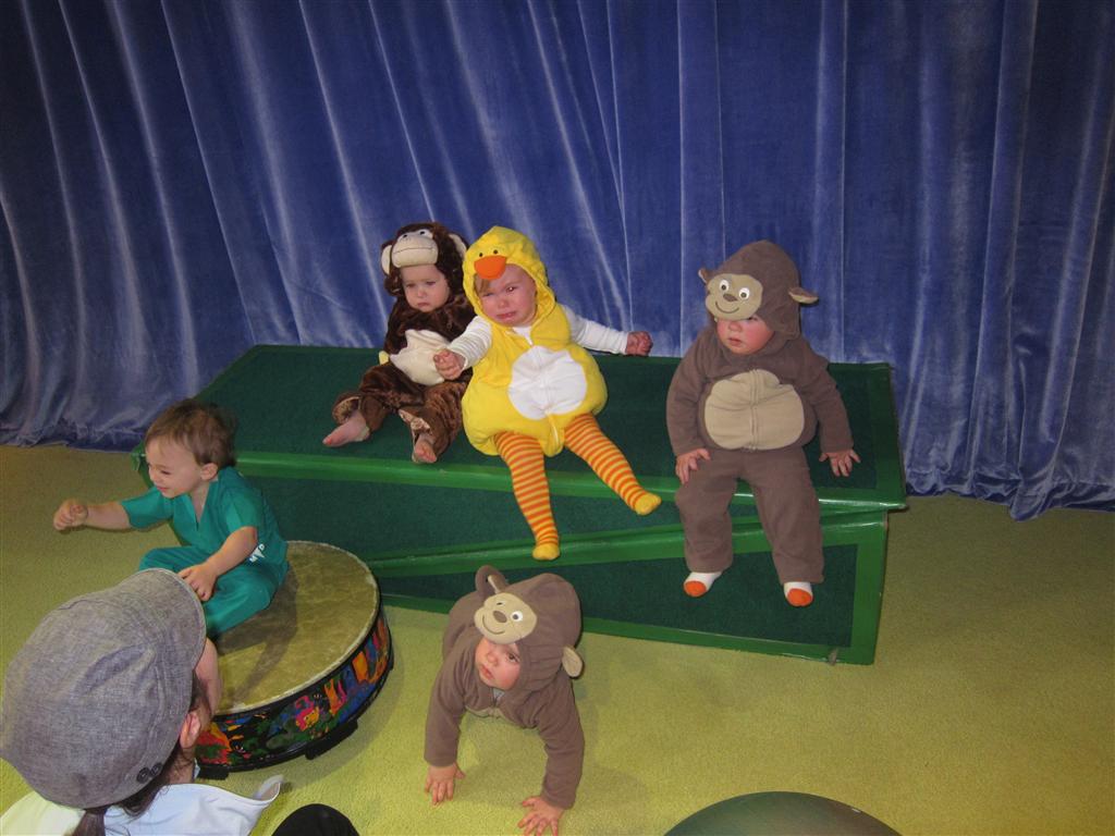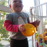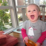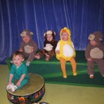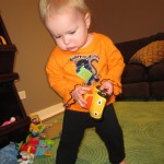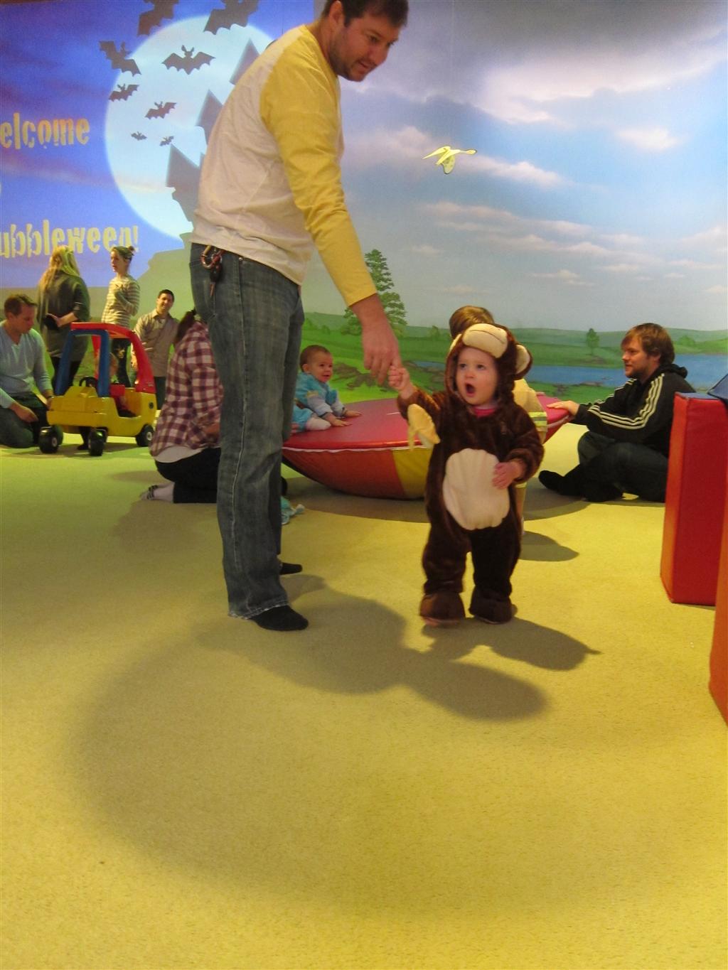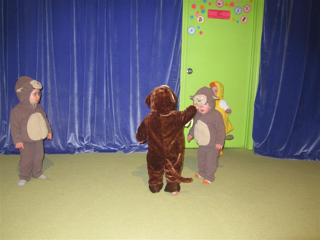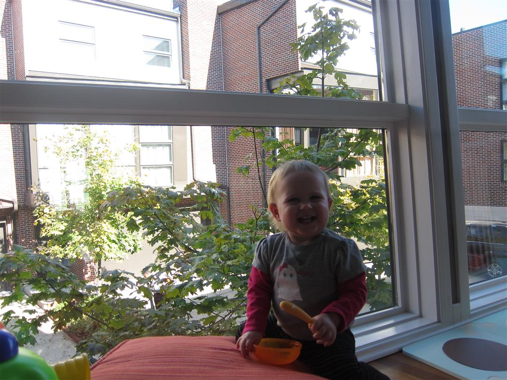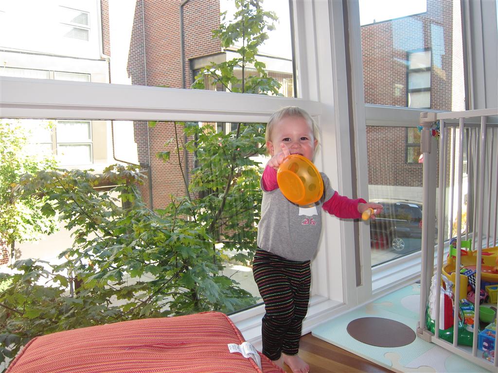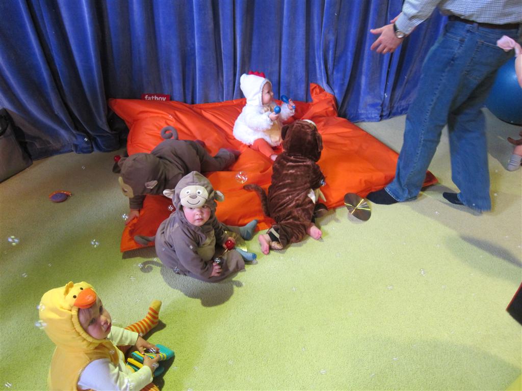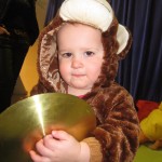 Eleanor maximized her costume time this week by participating in two Halloween parties, and Halloween is still coming up tomorrow! She dressed up as a monkey, a costume that she choose herself. While walking down the aisle at target, Eleanor got very excited pointing and making monkey sounds when she saw the costume on the shelf. A couple of her friends from music class also dressed up as monkeys, making for some fun pictures. Eleanor completed the monkey costume at the party on Sunday by picking up two cymbals. If only she had a box to hop out of :) In a notable first this week, Eleanor can now stack four blocks on top of each other. Her previous best was two, and mostly by accident. Now she is interested in trying to build towers as well as knock them down. While playing with our neighbor Zack, Eleanor watched him “march” and has picked that up. I even caught her “high stepping”
