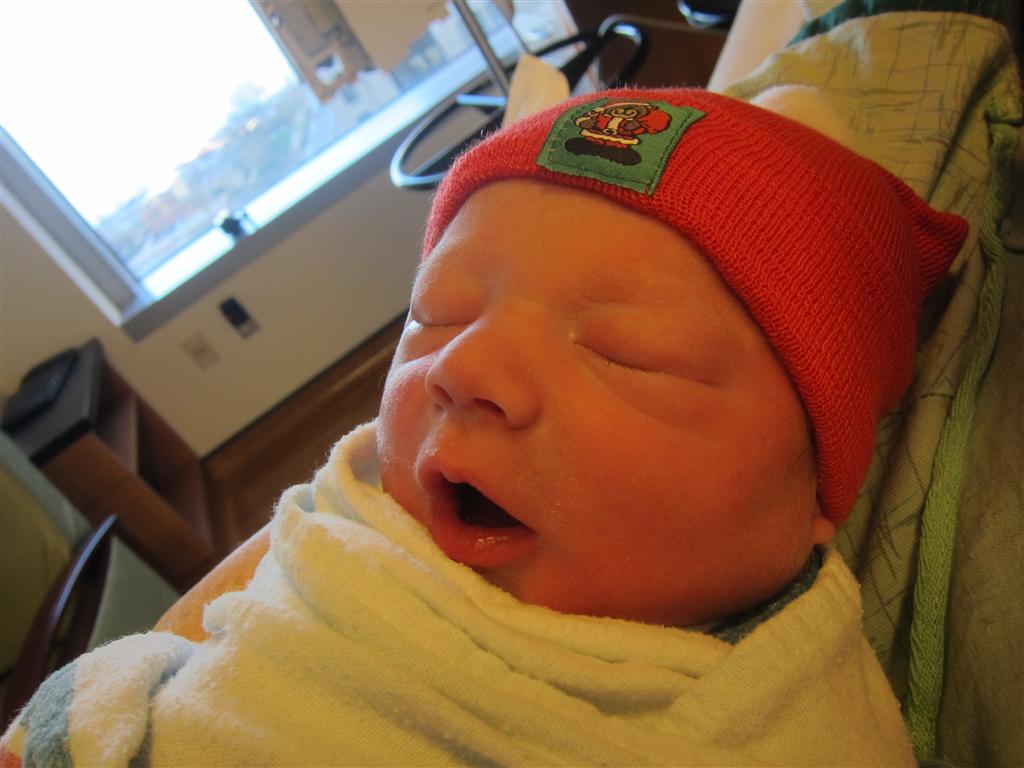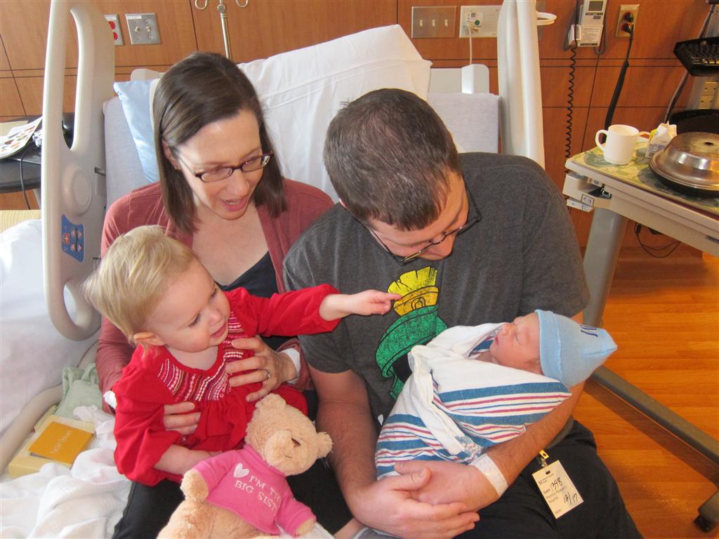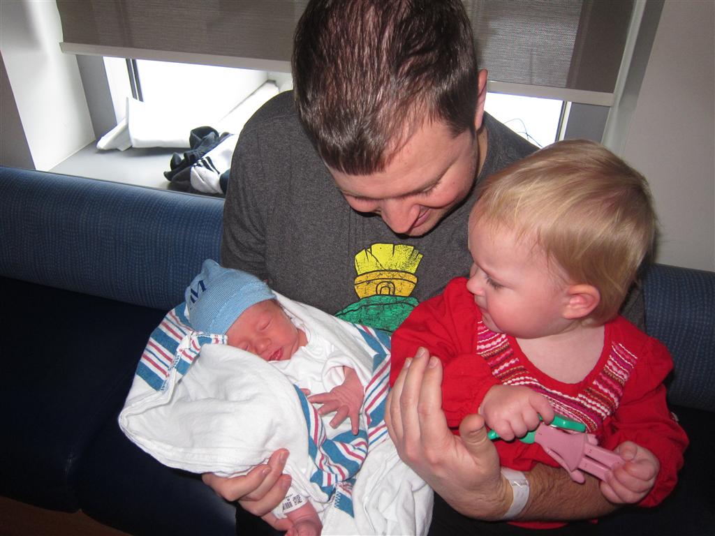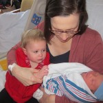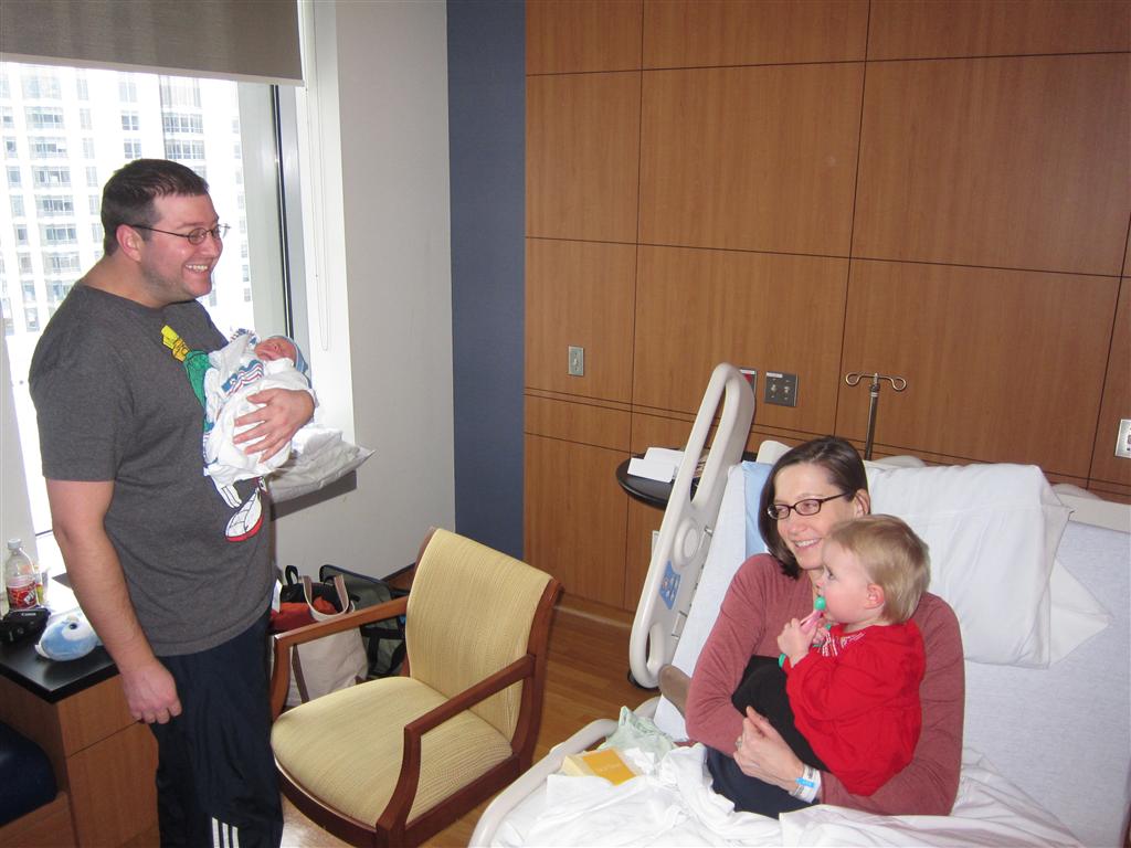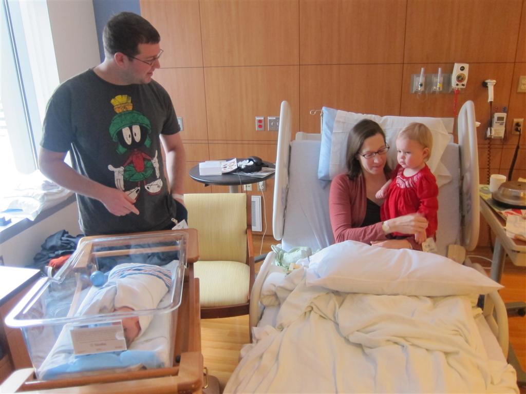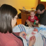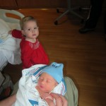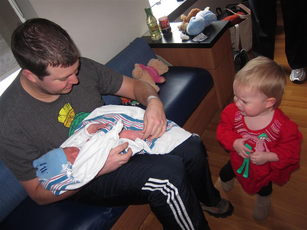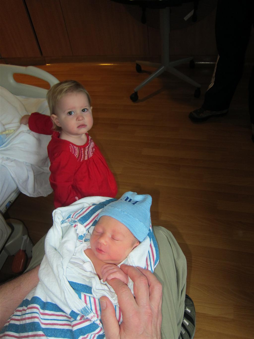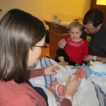 What a week! Amy, Eleanor and I were all surprised with the early arrival of Henry – I was sure that he wouldn’t be here until after Christmas – but he had other plans. Henry was born on Friday 12/16 at 12:13 PM. He was 19.6 inches and 6 pounds 15 ounces. Eleanor started the week as an only child, and she and Mom had a super fun day on Wednesday visiting the Christmas “El” train and then going to Nordstrom’s for a picture on Santa’s lap (well, technically Amy was on Santa’s lap, and Eleanor on hers). They finished the day with a fun dinner out at the Burger Bar. Then on Thursday night, Mimi came over to stay with Eleanor as Mom and Dad headed to the hospital. Aunt LaLa and Papa joined Mimi and took care of Eleanor all weekend. It was a long night on Thursday with little sleep and lots of beeping machines, a bit of a waiting game. Things started to get going around 7:00 AM on Friday, and by just after noon little Henry had joined the family. He even got a red Santa hat from the hospital in honor of his December arrival. It took Amy and I a little while to finalize on the name (being 2+ weeks early there were/are a number of things that were supposed to get finished before his arrival that didn’t), and I think everyone was getting a bit anxious to here more details. We didn’t send out anything other than “Baby arrived, he and mom doing well” until 4 something that afternoon. Uncharacteristically, Uncle B was the first to actually call requesting additional info. Once we finalized the name and got settled in our new room, all three took a quick nap. Friday night Uncle B, Aunt Tia, Breanne and Aunt LaLa all came to visit. Henry was quite good through the night, giving us one 4+ hour interval of sleep! On Saturday, Eleanor came with Mimi, Papa and LaLa for a visit. Her first reaction was to say “aise” (her word for Eyes) and point to Henry’s eyes. Past that, she wasn’t too interested. Once she settled into the room, she got a little more curious, and decided to play the “bump” game with Henry, where you say the word “Bump!” and then either tap your own head or tap the other person’s head. She of course opted for tapping Henry’s head, in the first of what I’m sure will be many incidents of sibling “love taps”. On Sunday, Henry came home with Mom and Dad and everyone was glad to be able to relax a bit. Not surprisingly, there are lots of pictures this week – enjoy!