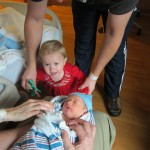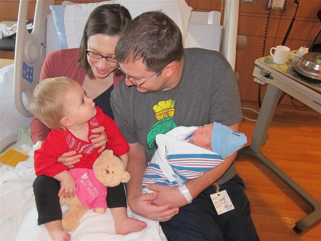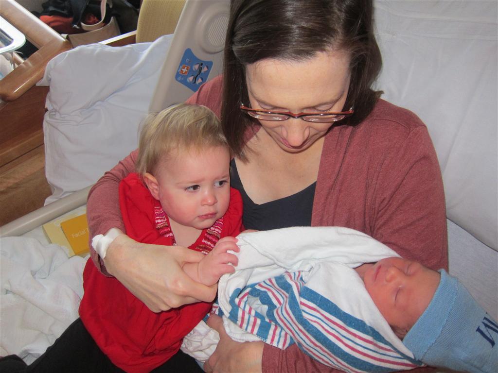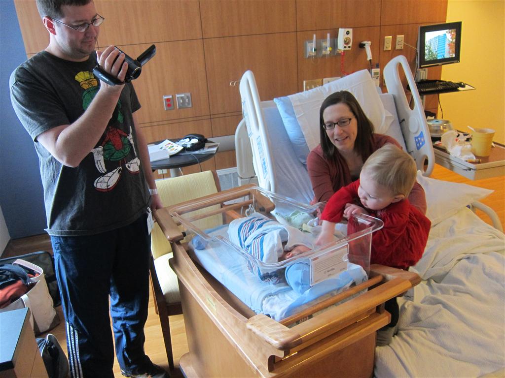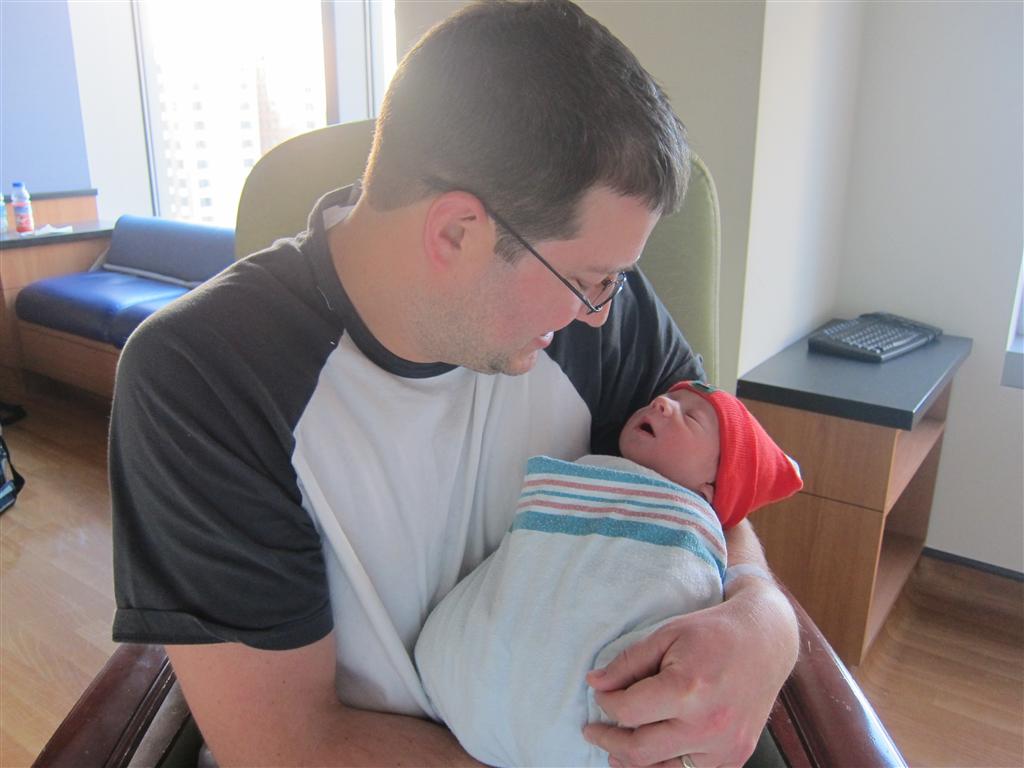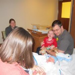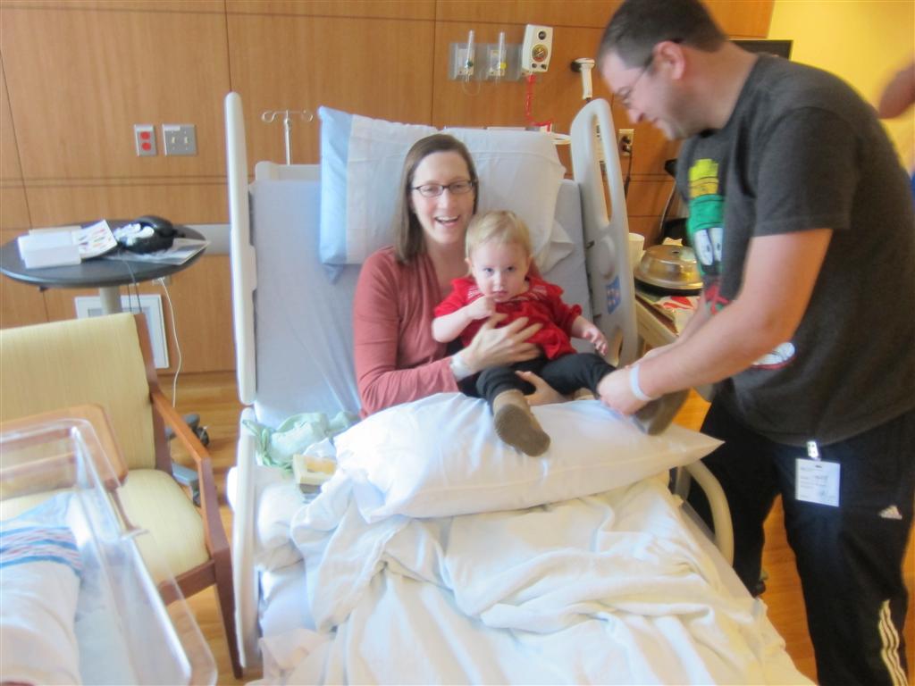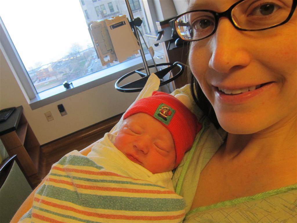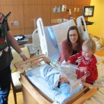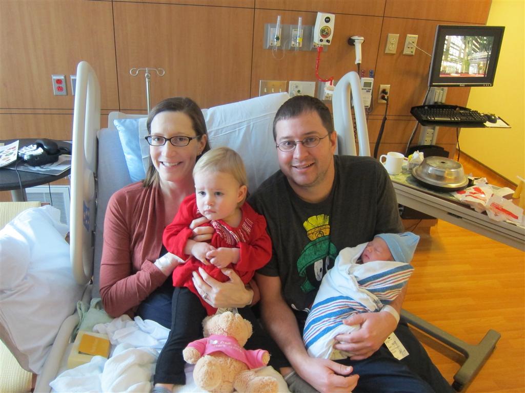 What a week! Amy, Eleanor and I were all surprised with the early arrival of Henry – I was sure that he wouldn’t be here until after Christmas – but he had other plans. Henry was born on Friday 12/16 at 12:13 PM. He was 19.6 inches and 6 pounds 15 ounces. Eleanor started the week as an only child, and she and Mom had a super fun day on Wednesday visiting the Christmas “El” train and then going to Nordstrom’s for a picture on Santa’s lap (well, technically Amy was on Santa’s lap, and Eleanor on hers). They finished the day with a fun dinner out at the Burger Bar. Then on Thursday night, Mimi came over to stay with Eleanor as Mom and Dad headed to the hospital. Aunt LaLa and Papa joined Mimi and took care of Eleanor all weekend. It was a long night on Thursday with little sleep and lots of beeping machines, a bit of a waiting game. Things started to get going around 7:00 AM on Friday, and by just after noon little Henry had joined the family. He even got a red Santa hat from the hospital in honor of his December arrival. It took Amy and I a little while to finalize on the name (being 2+ weeks early there were/are a number of things that were supposed to get finished before his arrival that didn’t), and I think everyone was getting a bit anxious to here more details. We didn’t send out anything other than “Baby arrived, he and mom doing well” until 4 something that afternoon. Uncharacteristically, Uncle B was the first to actually call requesting additional info. Once we finalized the name and got settled in our new room, all three took a quick nap. Friday night Uncle B, Aunt Tia, Breanne and Aunt LaLa all came to visit. Henry was quite good through the night, giving us one 4+ hour interval of sleep! On Saturday, Eleanor came with Mimi, Papa and LaLa for a visit. Her first reaction was to say “aise” (her word for Eyes) and point to Henry’s eyes. Past that, she wasn’t too interested. Once she settled into the room, she got a little more curious, and decided to play the “bump” game with Henry, where you say the word “Bump!” and then either tap your own head or tap the other person’s head. She of course opted for tapping Henry’s head, in the first of what I’m sure will be many incidents of sibling “love taps”. On Sunday, Henry came home with Mom and Dad and everyone was glad to be able to relax a bit. Not surprisingly, there are lots of pictures this week – enjoy!