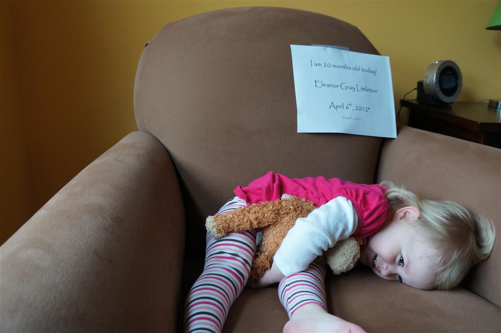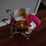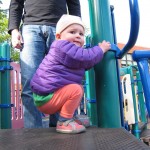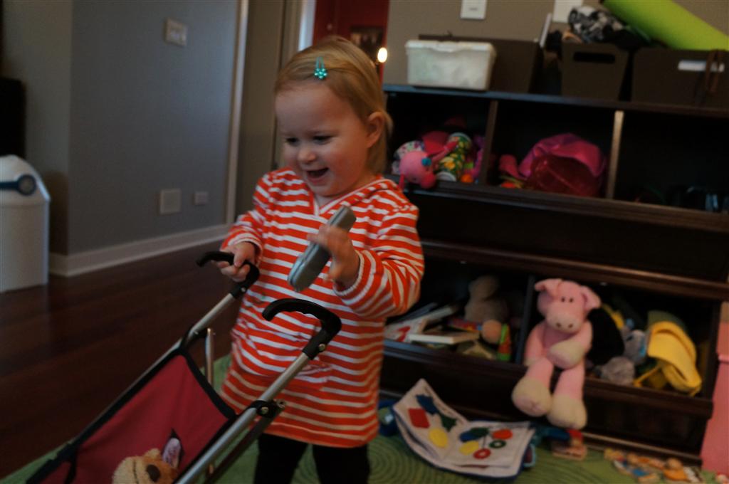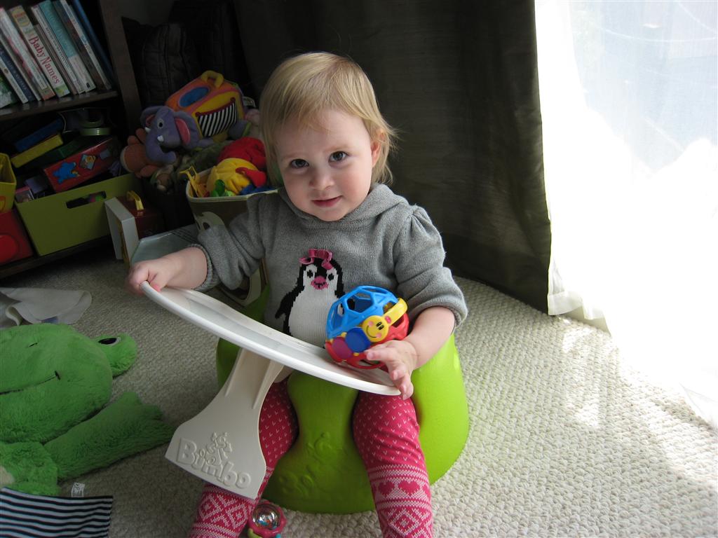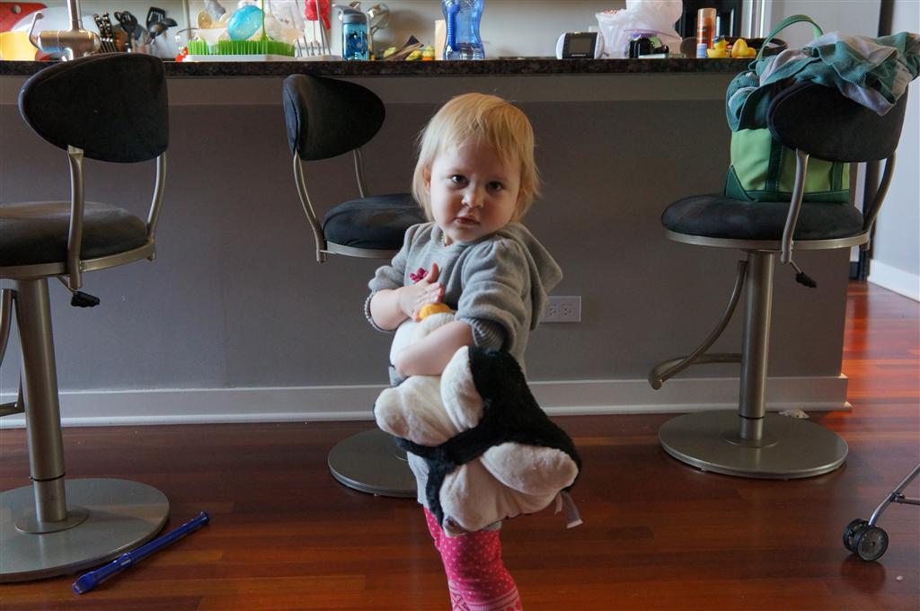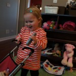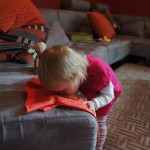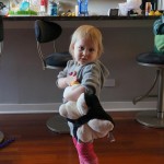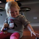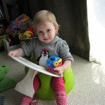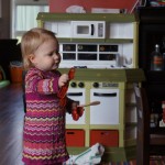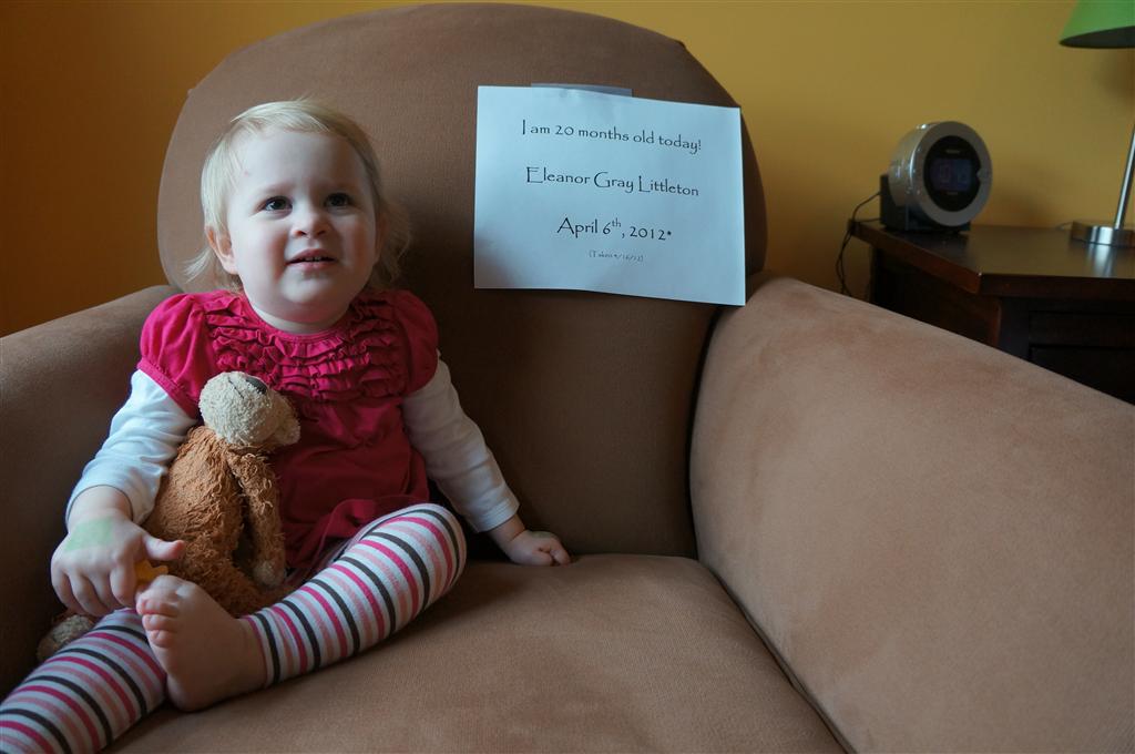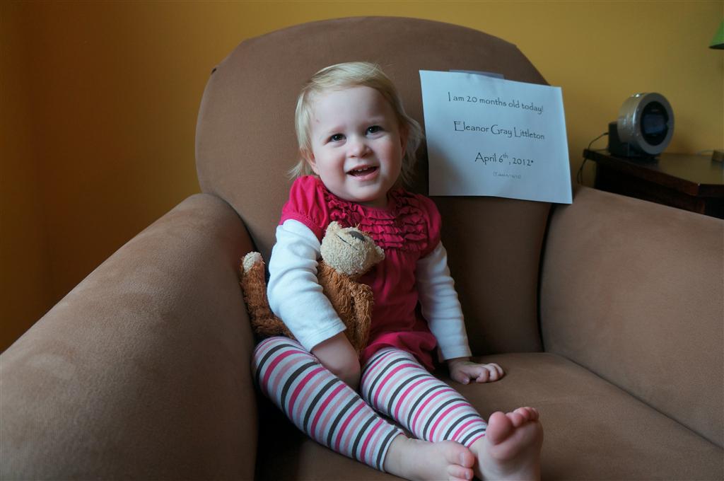 Eleanor has been working on saying longer phrases. She often says them in a kind of rapid mumble, so you have to be paying attention, but she will say four and even five word phrases. Most of the time it is imitating something that Mom or Dad does. We are also trying to teach her to smile for the camera – thus a few strange teeth bearing expressions in this week’s gallery :)