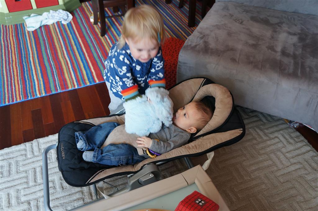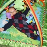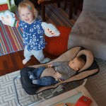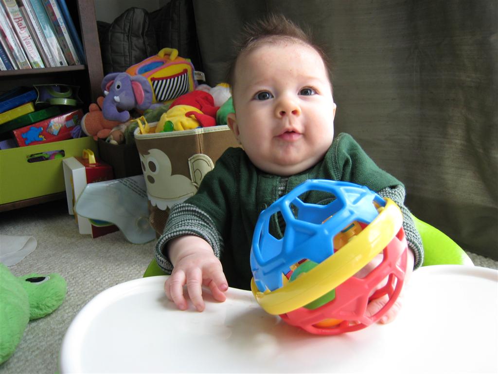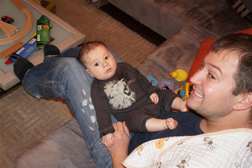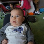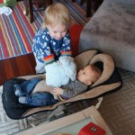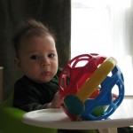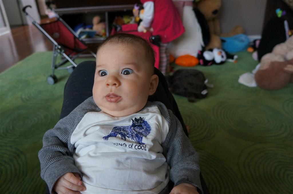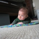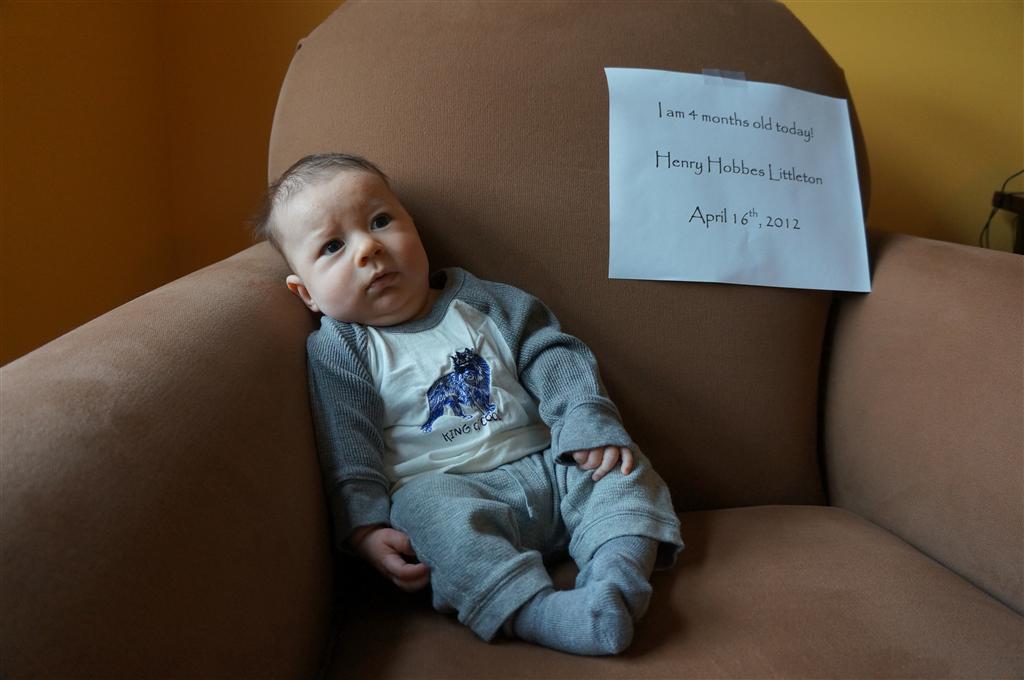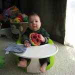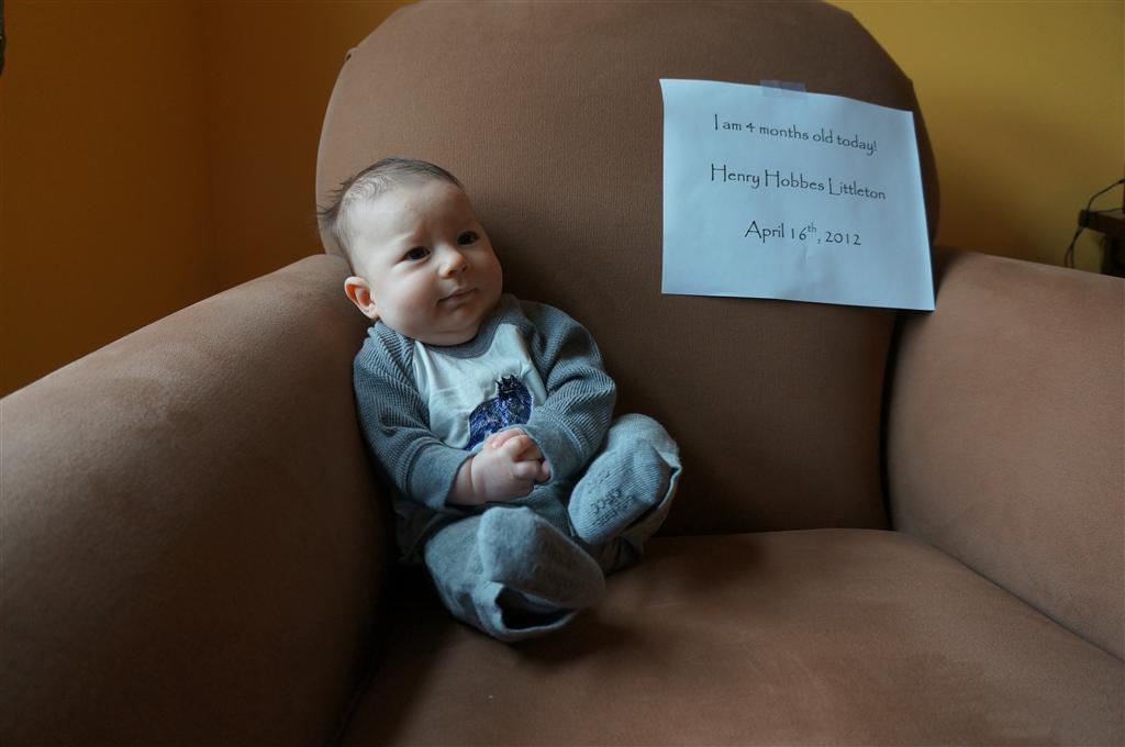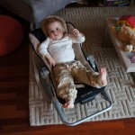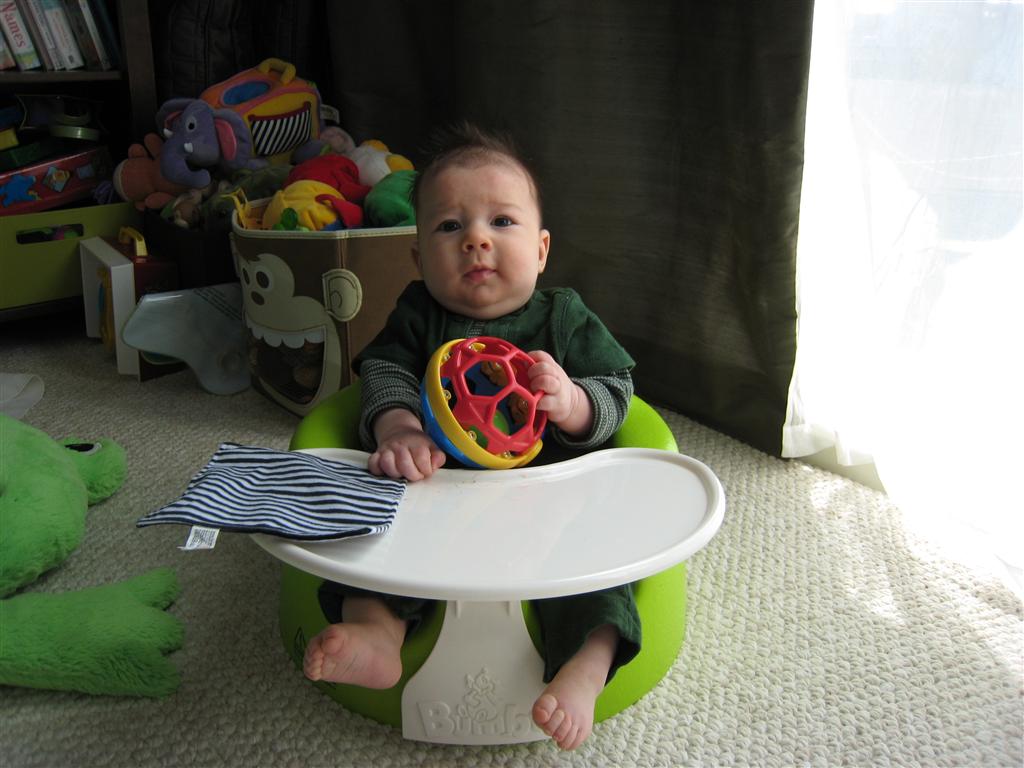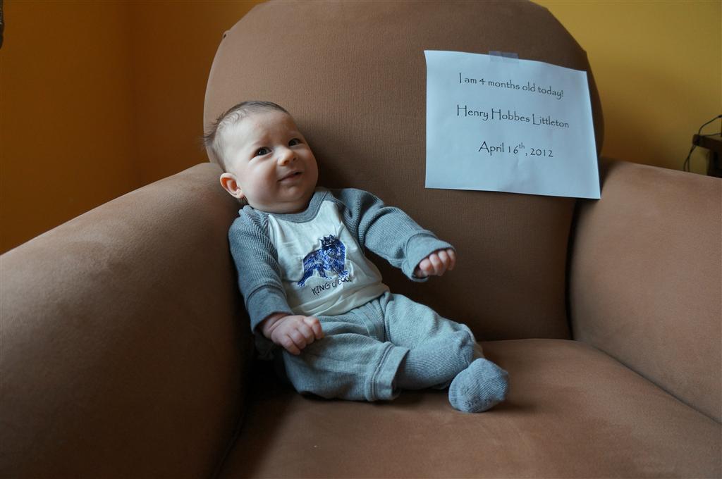 Henry turned four months old this week! He celebrated with a couple of new tricks. First, he can now make a razzing noise, and second, he can roll over if we prop him up on his arms during tummy time. I’m not quite ready to give him full credit for rolling over, becuse we have to help him get his arms under him, but it is definitely close. His head control is also coming along, he can now sit in the bumpo chair, and tonight he tried the jumparoo for the first time. Eleanor’s response was “El-nor”, which is her typical response when Henry is doing something, and it means “now it’s Eleanor’s turn”. We had to explain to her that she would no longer fit in the jumparoo. Henry can also now grab his own toes – which is always fun.