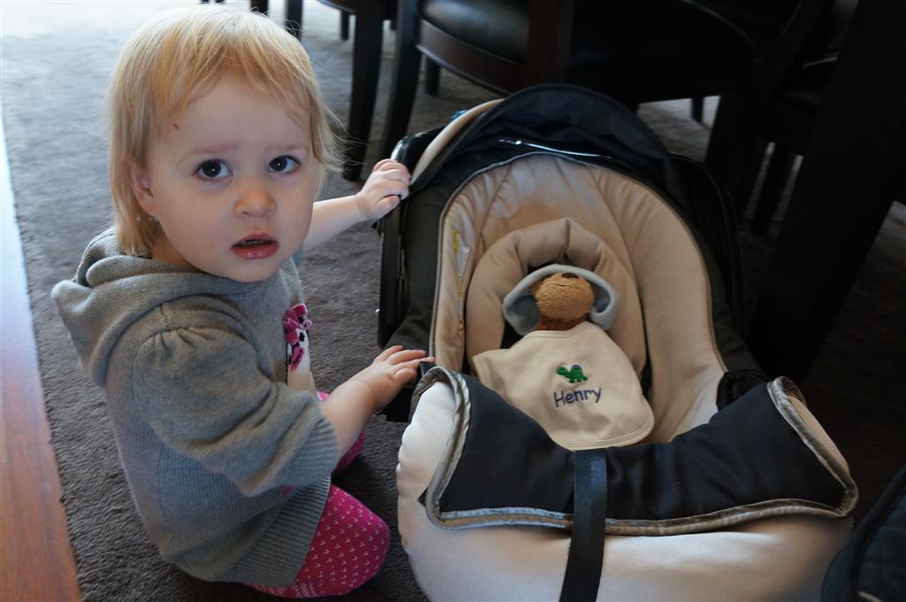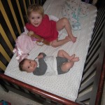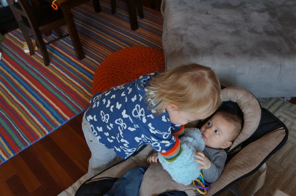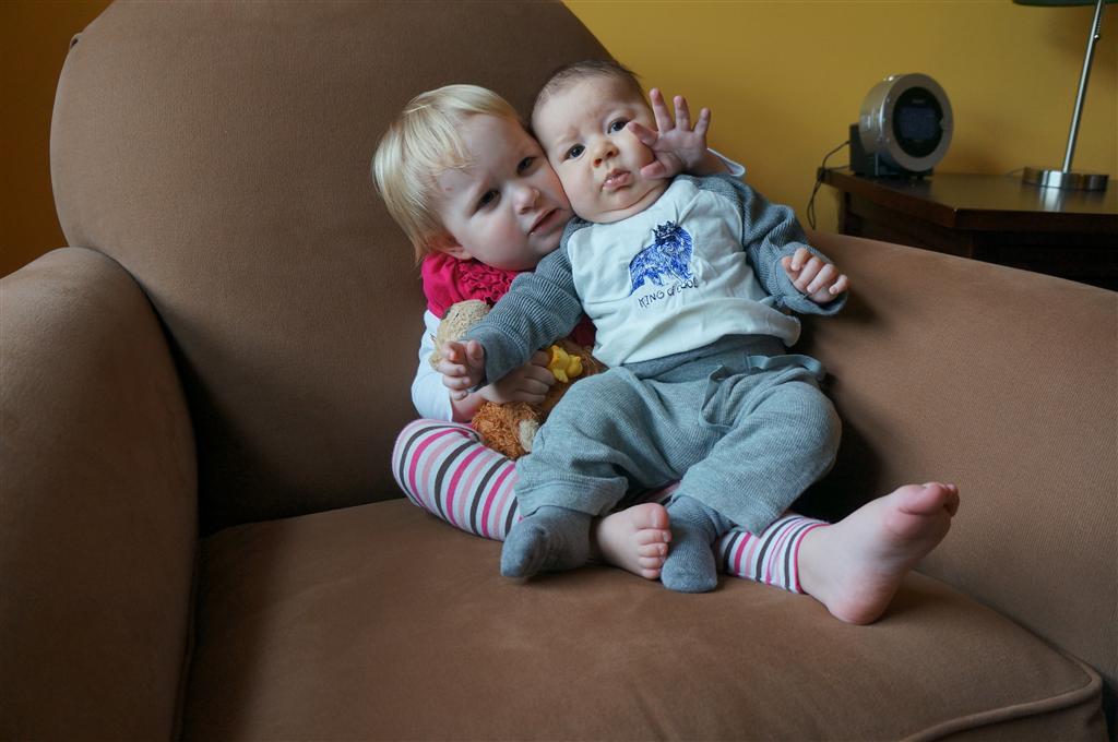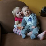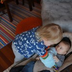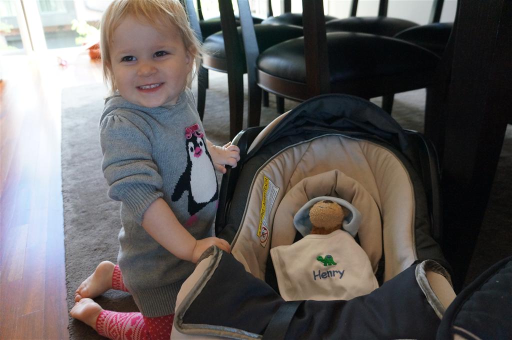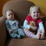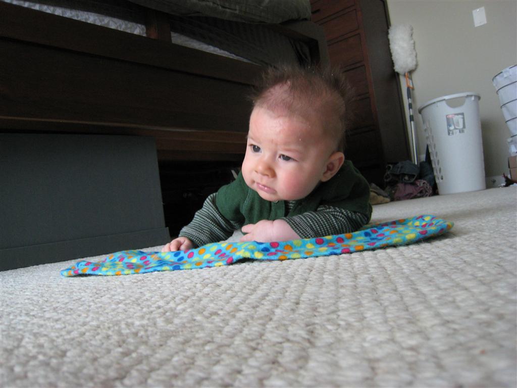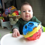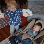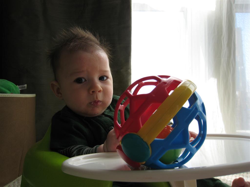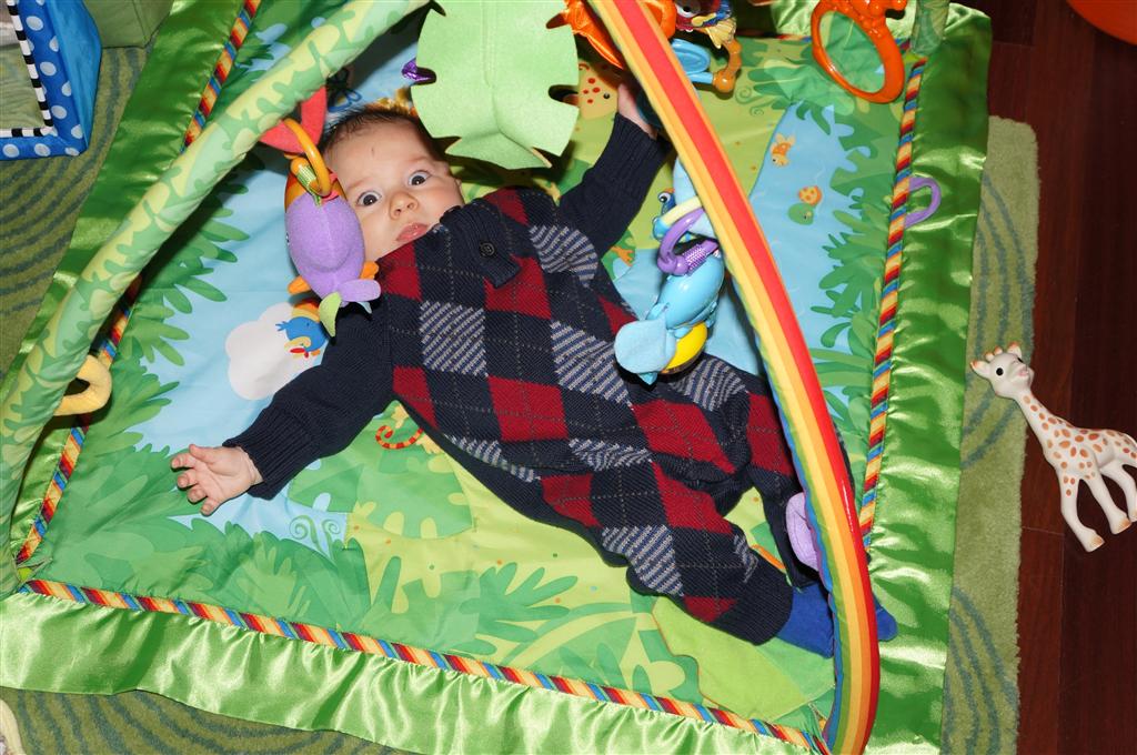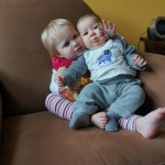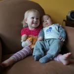 Henry turned four months old this week! He celebrated with a couple of new tricks. First, he can now make a razzing noise, and second, he can roll over if we prop him up on his arms during tummy time. I’m not quite ready to give him full credit for rolling over, becuse we have to help him get his arms under him, but it is definitely close. His head control is also coming along, he can now sit in the bumpo chair, and tonight he tried the jumparoo for the first time. Eleanor’s response was “El-nor”, which is her typical response when Henry is doing something, and it means “now it’s Eleanor’s turn”. We had to explain to her that she would no longer fit in the jumparoo. Henry can also now grab his own toes – which is always fun.