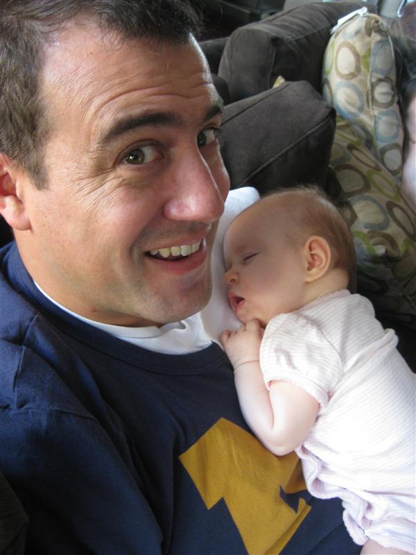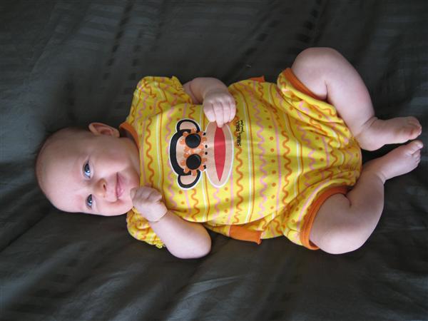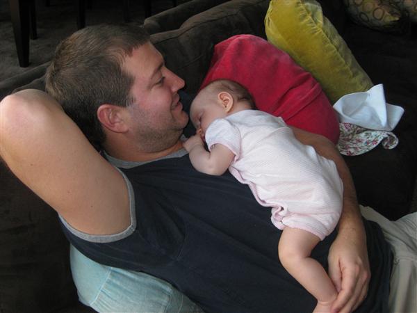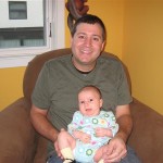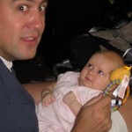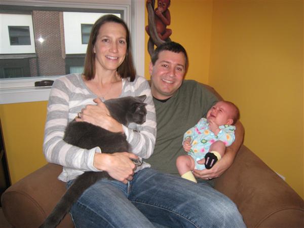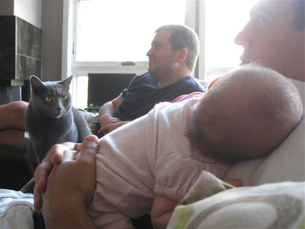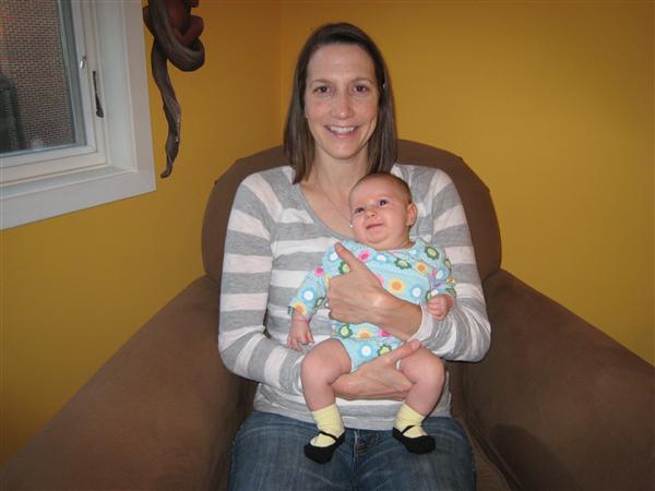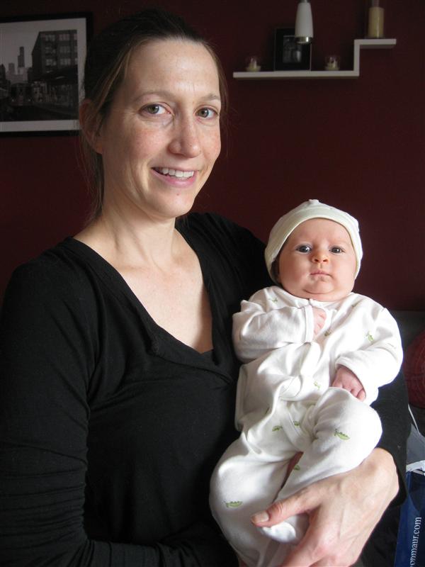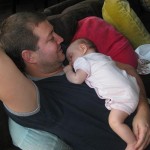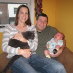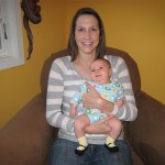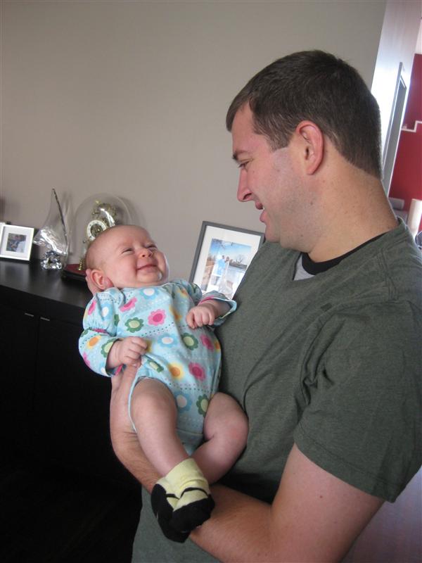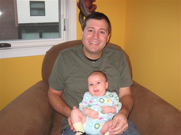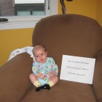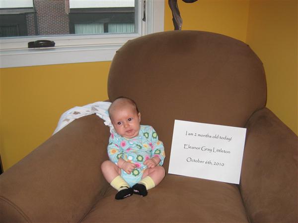 We had lots of fun this week, including our official Two Month Old photo. Side by side you can really notice quite a difference from the Official One Month Old photo. A few firsts this week: full length Pj’s, and holding a toy in our hand (a monkey, or as Amy would say, a frog). [Editor’s note: please see the post “How to Create a Nursery” for Amy’s monkey/frog confusion]. We also had a trip to the Doctor (everything is great) and got three shots and one drinkable immunization. We were able to confirm the Doctor’s hypothesis that she would be “Extra fussy and extra sleepy.” after the shots. Uncle B came over to watch the Michigan Michigan State game, while Ellie slept on his chest and Zappa watched Ellie. Cousin Rachel stopped in to say hi and to run the Chicago Marathon (well done!). Amy and I snuck out for an evening on the town to watch the Blackhawks raise their championship banner. We finished off the week napping with Mimi Sheri.
