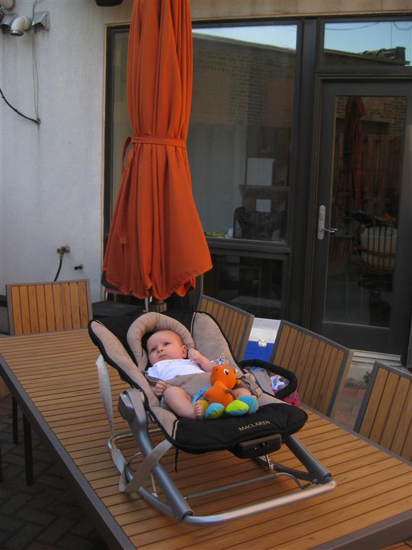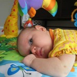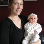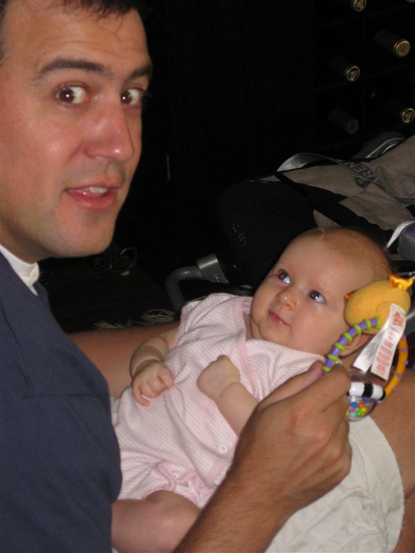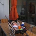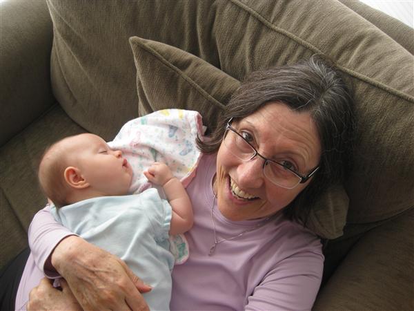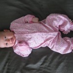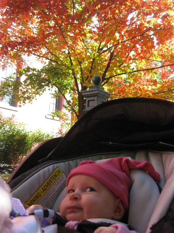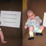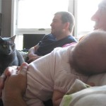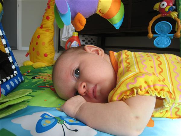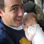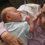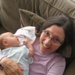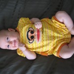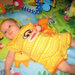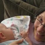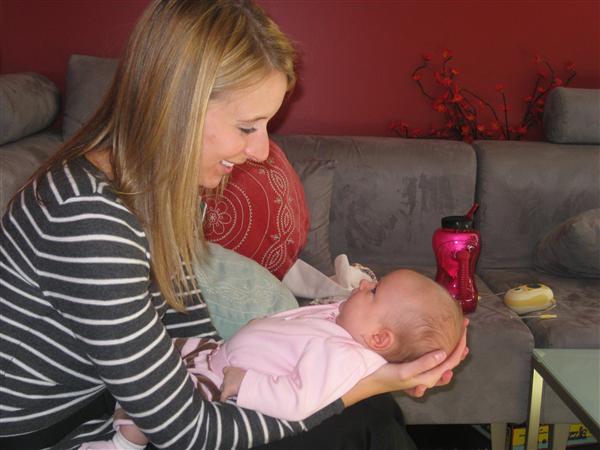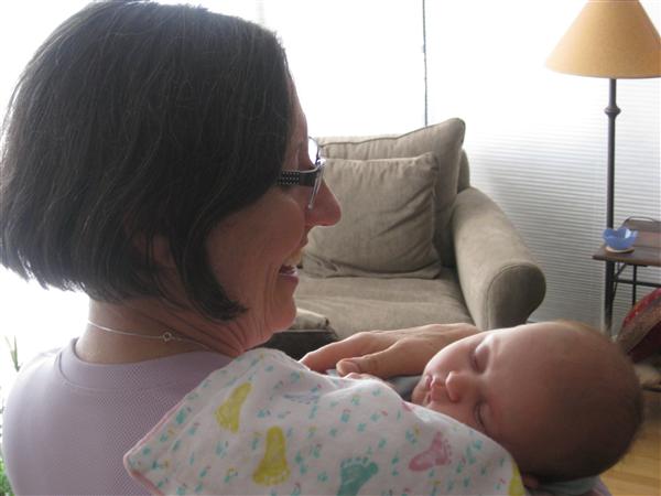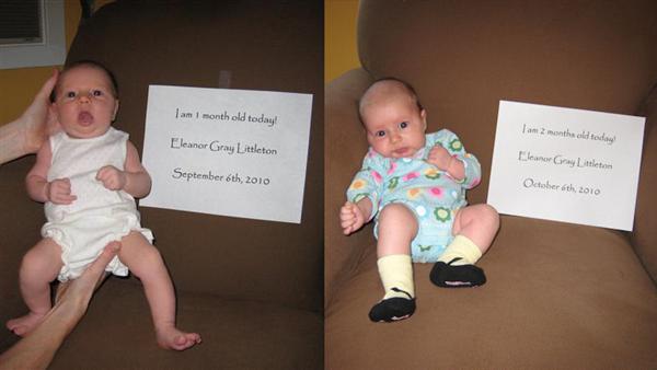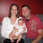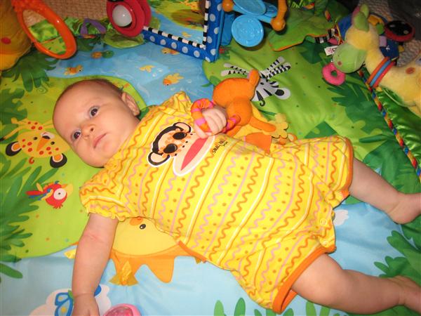 We had lots of fun this week, including our official Two Month Old photo. Side by side you can really notice quite a difference from the Official One Month Old photo. A few firsts this week: full length Pj’s, and holding a toy in our hand (a monkey, or as Amy would say, a frog). [Editor’s note: please see the post “How to Create a Nursery” for Amy’s monkey/frog confusion]. We also had a trip to the Doctor (everything is great) and got three shots and one drinkable immunization. We were able to confirm the Doctor’s hypothesis that she would be “Extra fussy and extra sleepy.” after the shots. Uncle B came over to watch the Michigan Michigan State game, while Ellie slept on his chest and Zappa watched Ellie. Cousin Rachel stopped in to say hi and to run the Chicago Marathon (well done!). Amy and I snuck out for an evening on the town to watch the Blackhawks raise their championship banner. We finished off the week napping with Mimi Sheri.