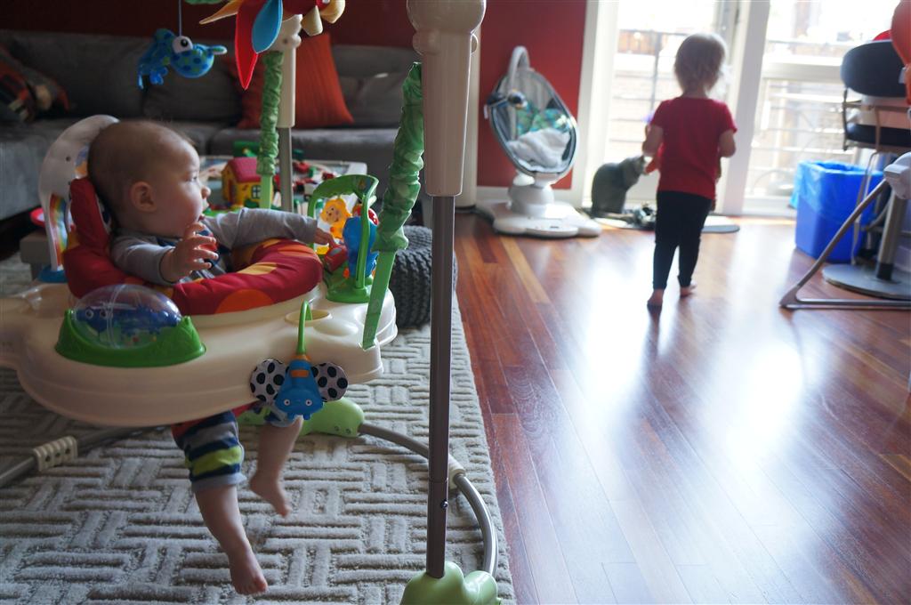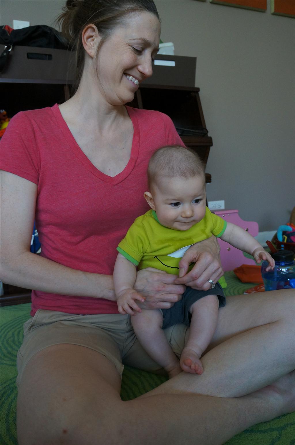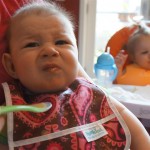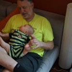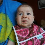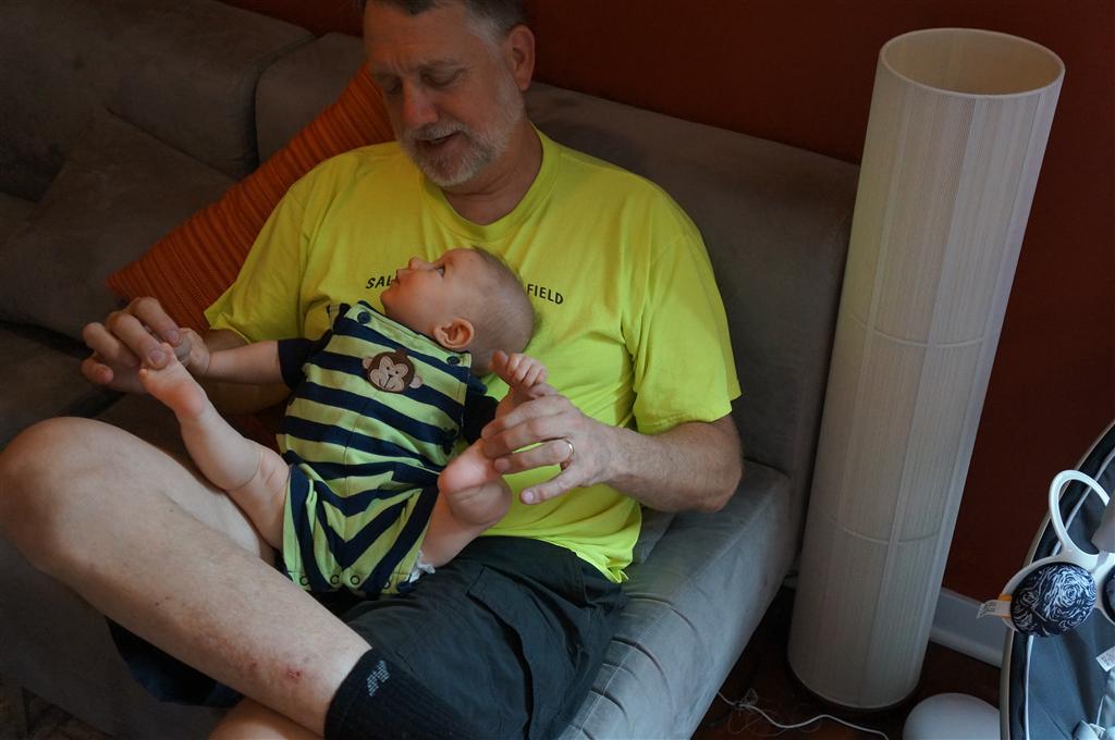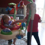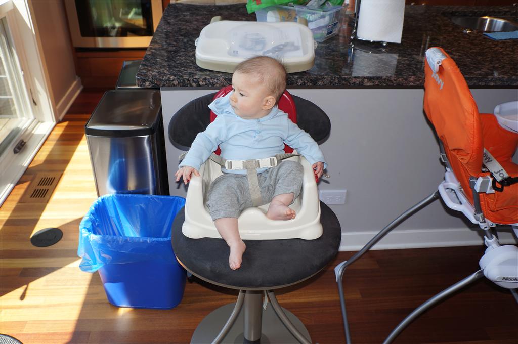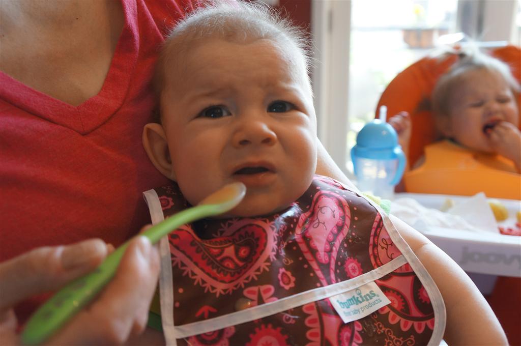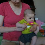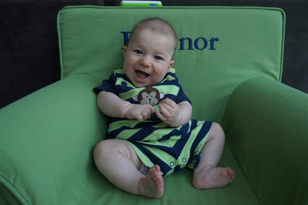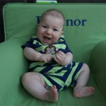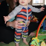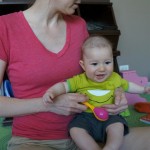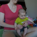 Henry had his first bites of food this week – pears. He wasn’t a big fan, but I’m sure that he will come around. The first bites were mostly met with confusion and funny face expressions. He did end up eating a little bit, but most of it came back out his mouth. Eleanor was eating lunch at the time, but that didn’t seem to instill a great appetite in Henry. This weekend he and Eleanor alternated their naps a bit, so Henry got some rare time with both Mom and Dad, which was fun. Henry is starting to put some weight on his legs, and sometimes can bear all of his weight for a few seconds.