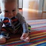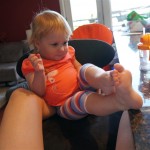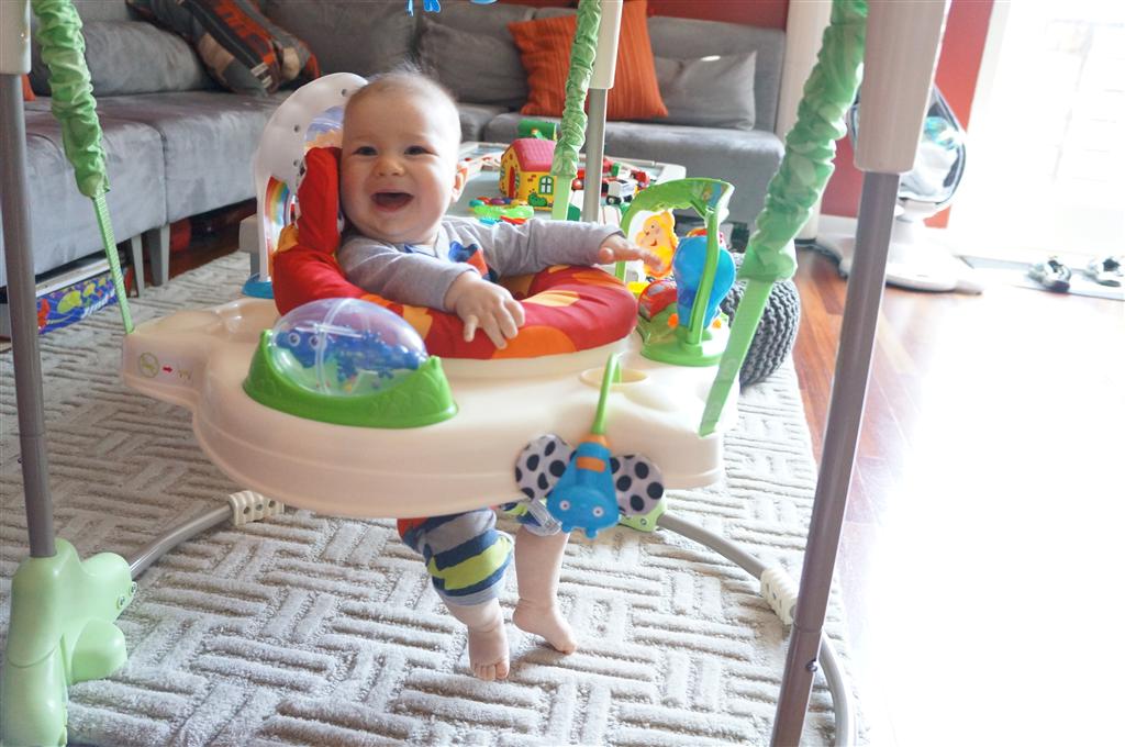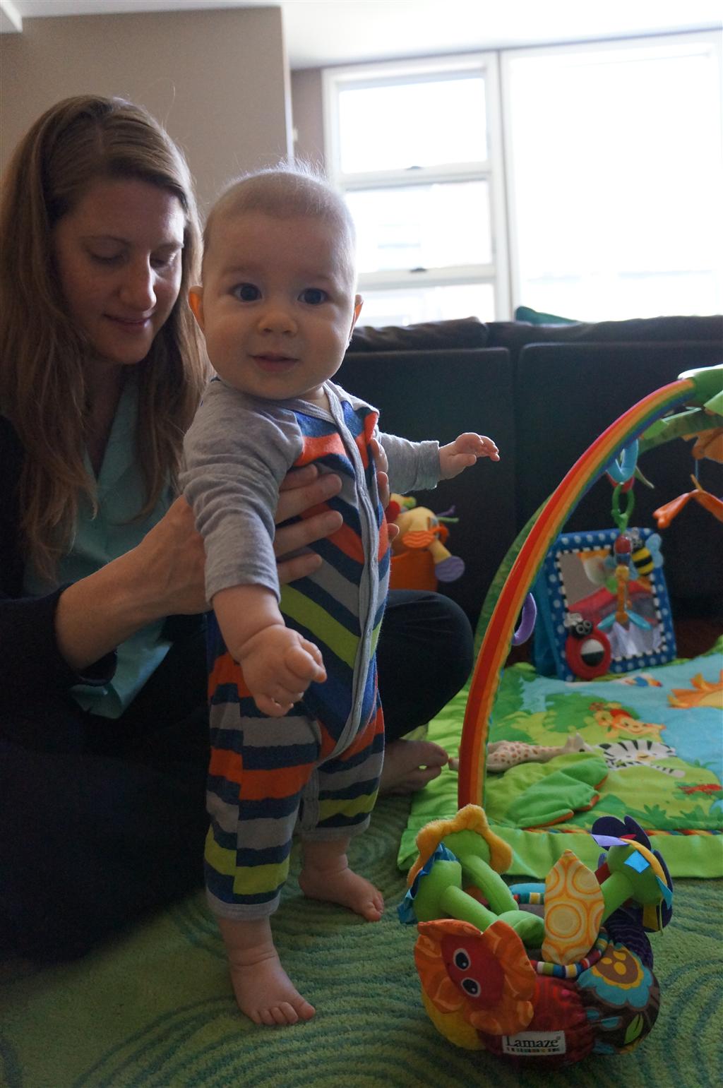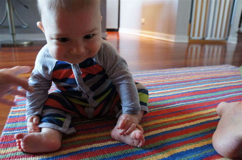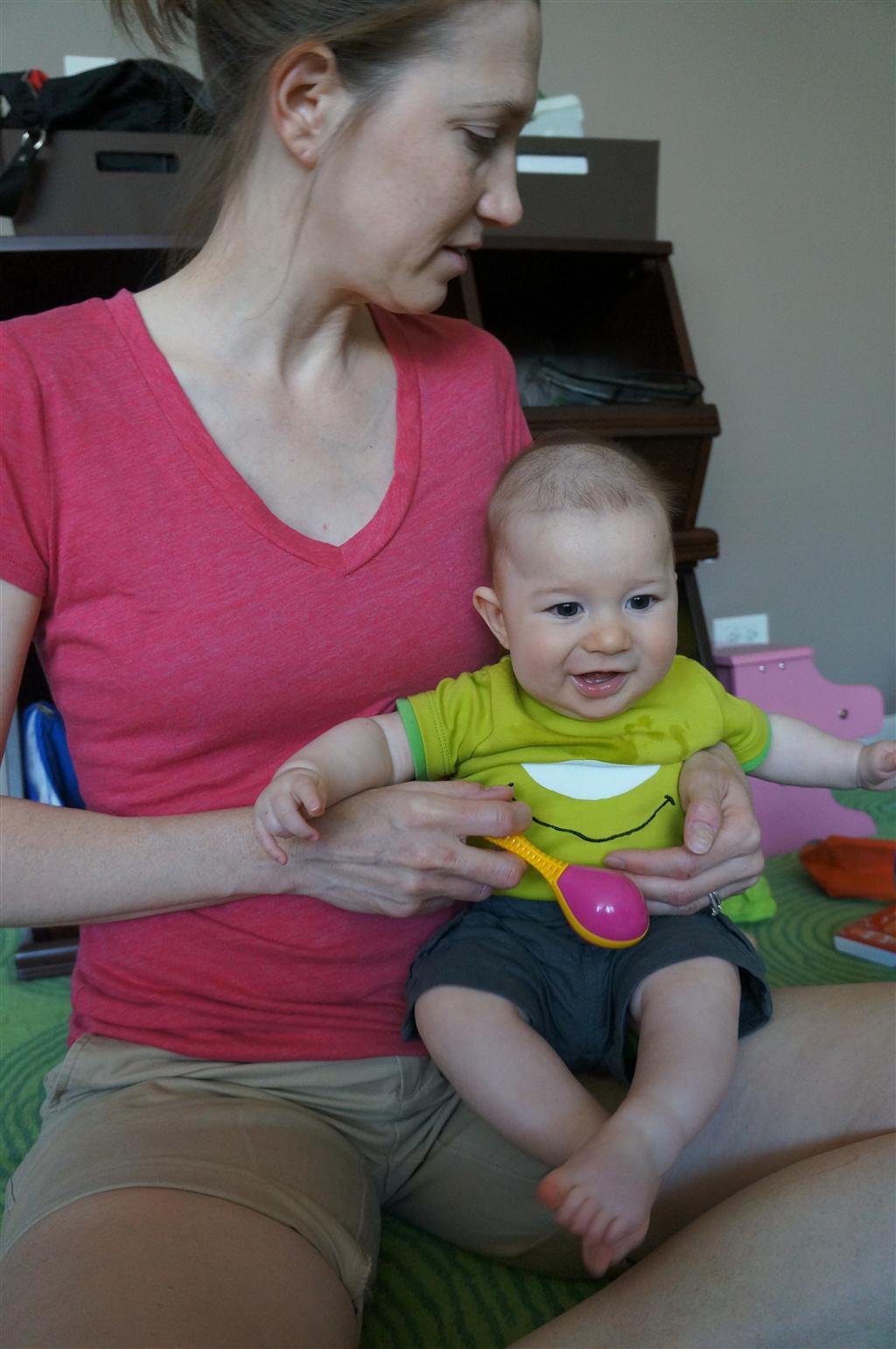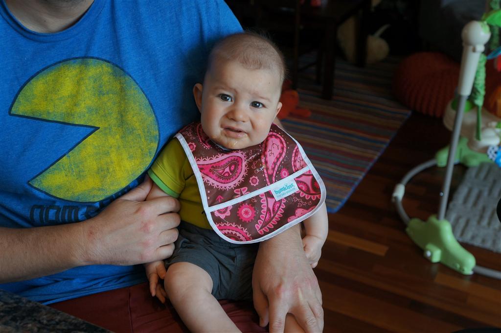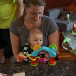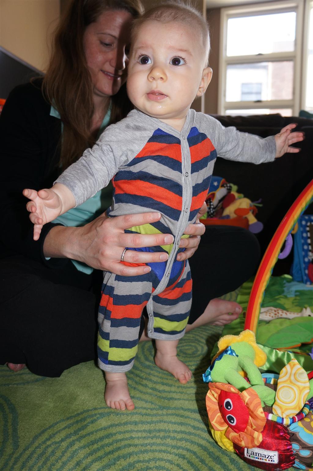 Henry had his first bites of food this week – pears. He wasn’t a big fan, but I’m sure that he will come around. The first bites were mostly met with confusion and funny face expressions. He did end up eating a little bit, but most of it came back out his mouth. Eleanor was eating lunch at the time, but that didn’t seem to instill a great appetite in Henry. This weekend he and Eleanor alternated their naps a bit, so Henry got some rare time with both Mom and Dad, which was fun. Henry is starting to put some weight on his legs, and sometimes can bear all of his weight for a few seconds.