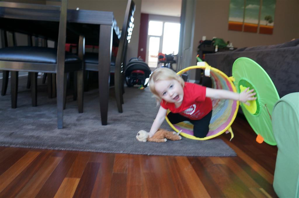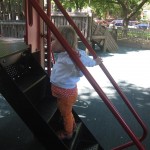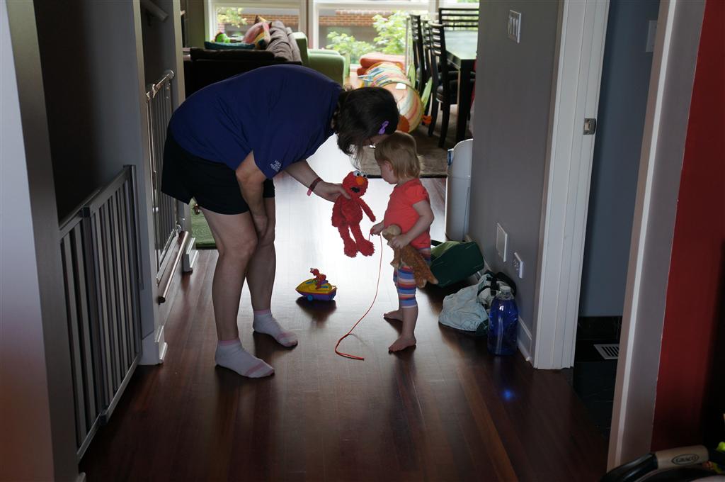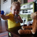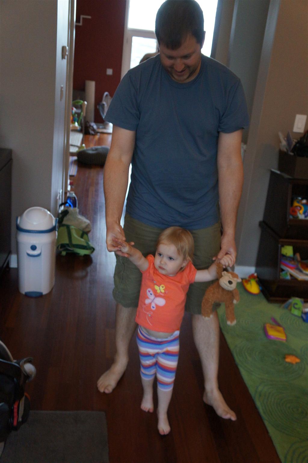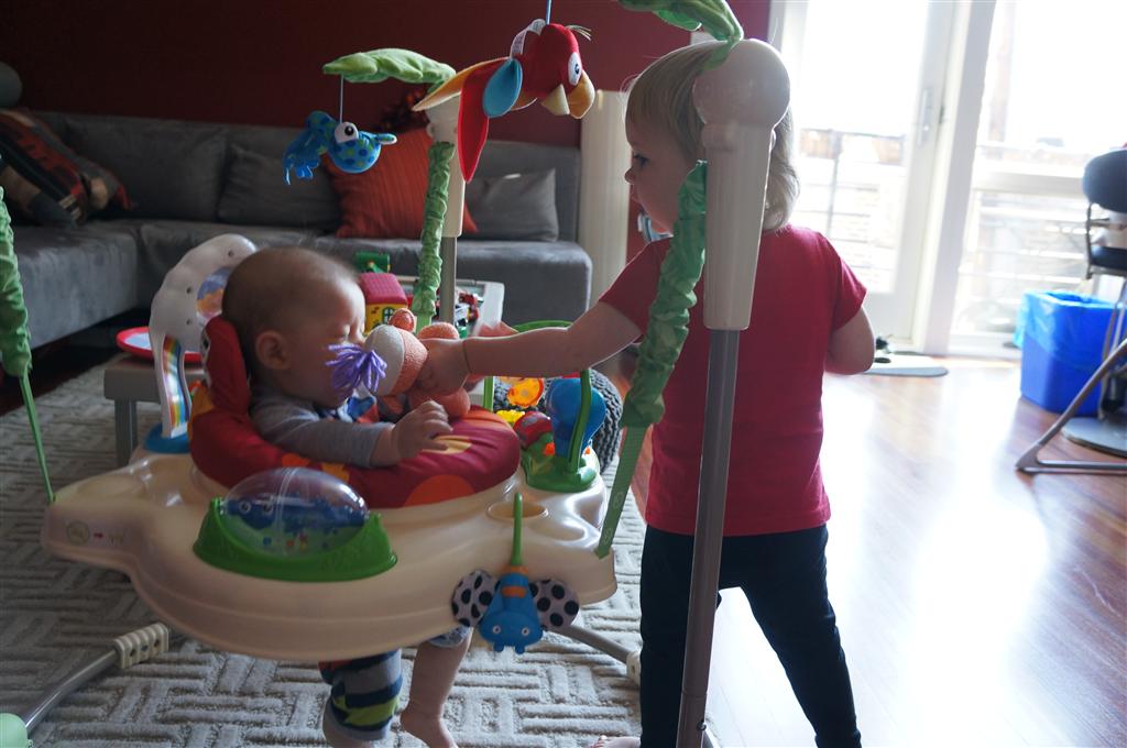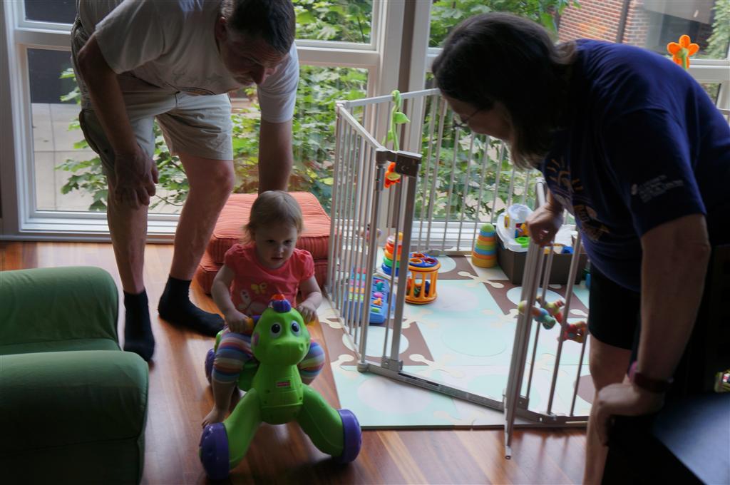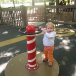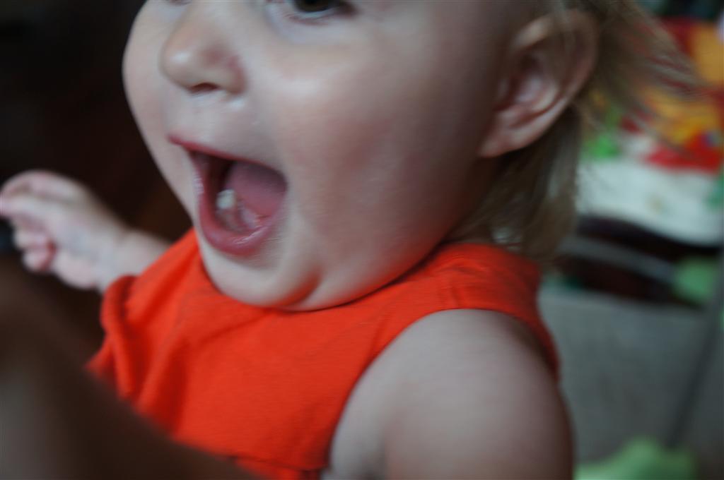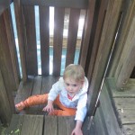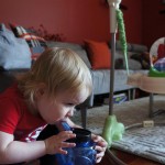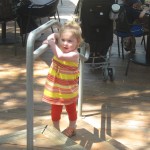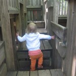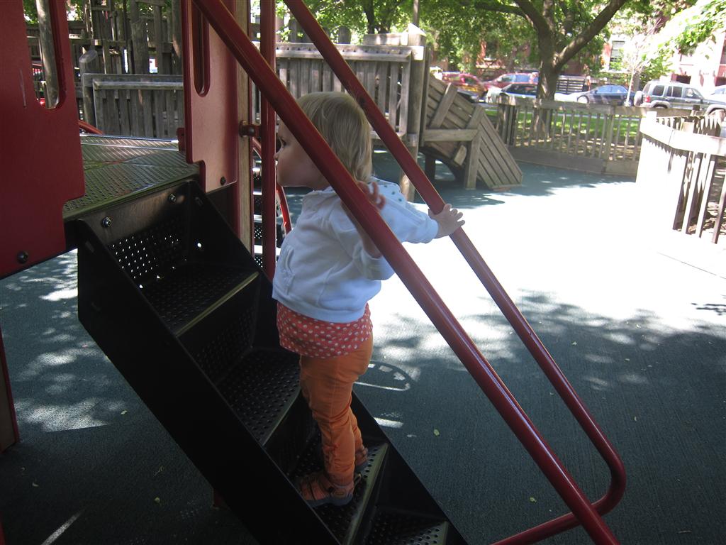 Eleanor has been practicing her alphabet a lot this week – in fact on Friday she was running back forth between the family room and the fridge where her magnet letters are while Mom was making lunch. Mom finally stopped to see what she was up to, and found Eleanor holding the letter E, Monkey sitting on the slide with the letter M next to her, and the letter H on the floor in front on Henry in the jumparoo. Very impressive! Eleanor also conquered a new section of the park this week all by herself, climbing though the maze and finishing on the slide that is intended for the bigger kids. And she has a new tooth coming in, one of her two year molars.
