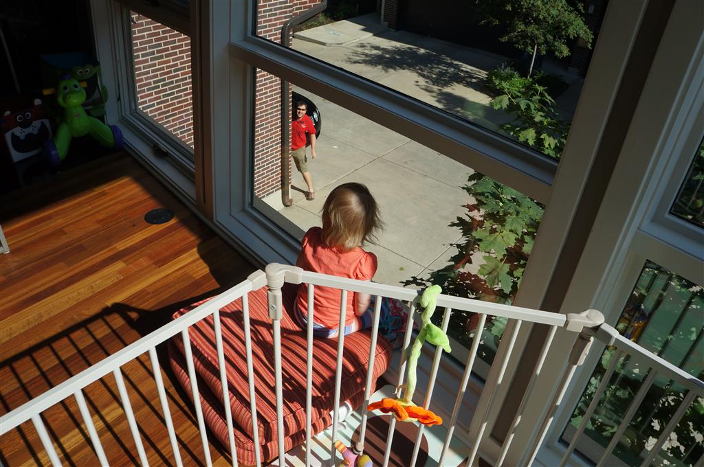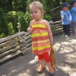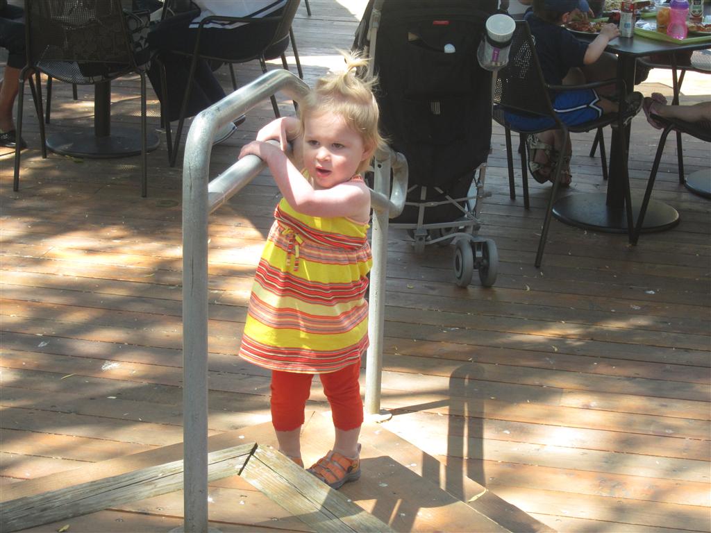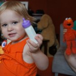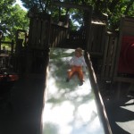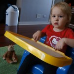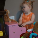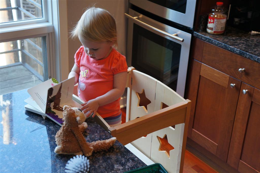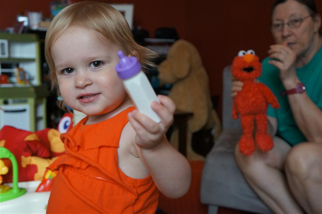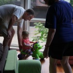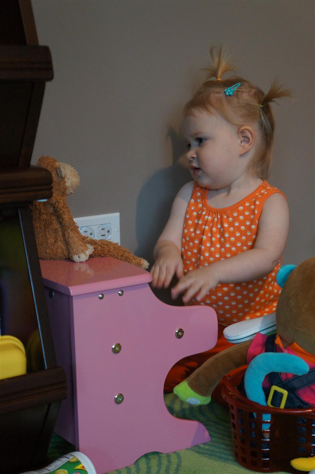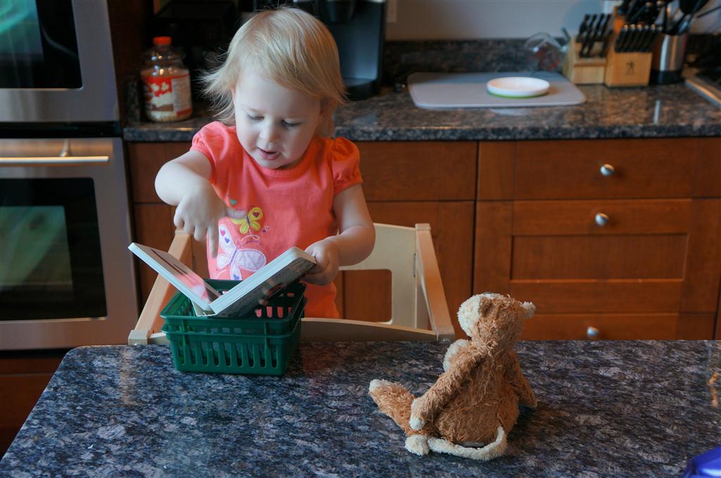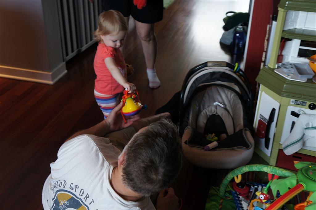 Eleanor has been practicing her alphabet a lot this week – in fact on Friday she was running back forth between the family room and the fridge where her magnet letters are while Mom was making lunch. Mom finally stopped to see what she was up to, and found Eleanor holding the letter E, Monkey sitting on the slide with the letter M next to her, and the letter H on the floor in front on Henry in the jumparoo. Very impressive! Eleanor also conquered a new section of the park this week all by herself, climbing though the maze and finishing on the slide that is intended for the bigger kids. And she has a new tooth coming in, one of her two year molars.