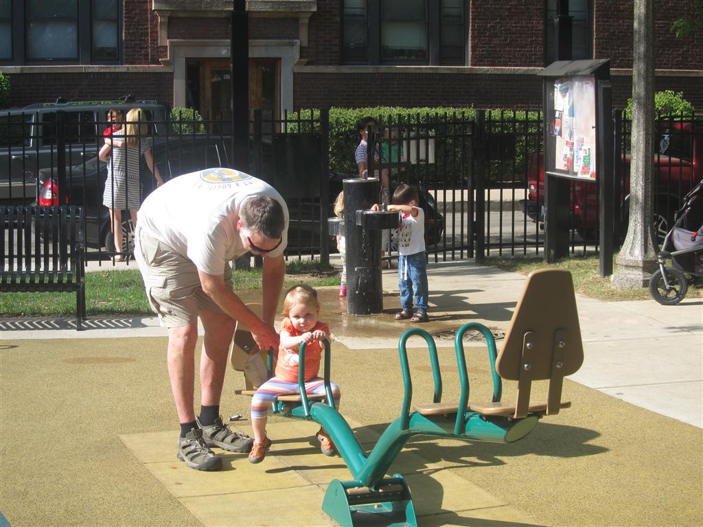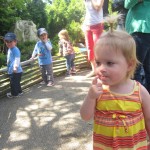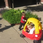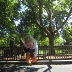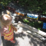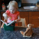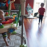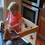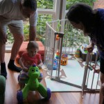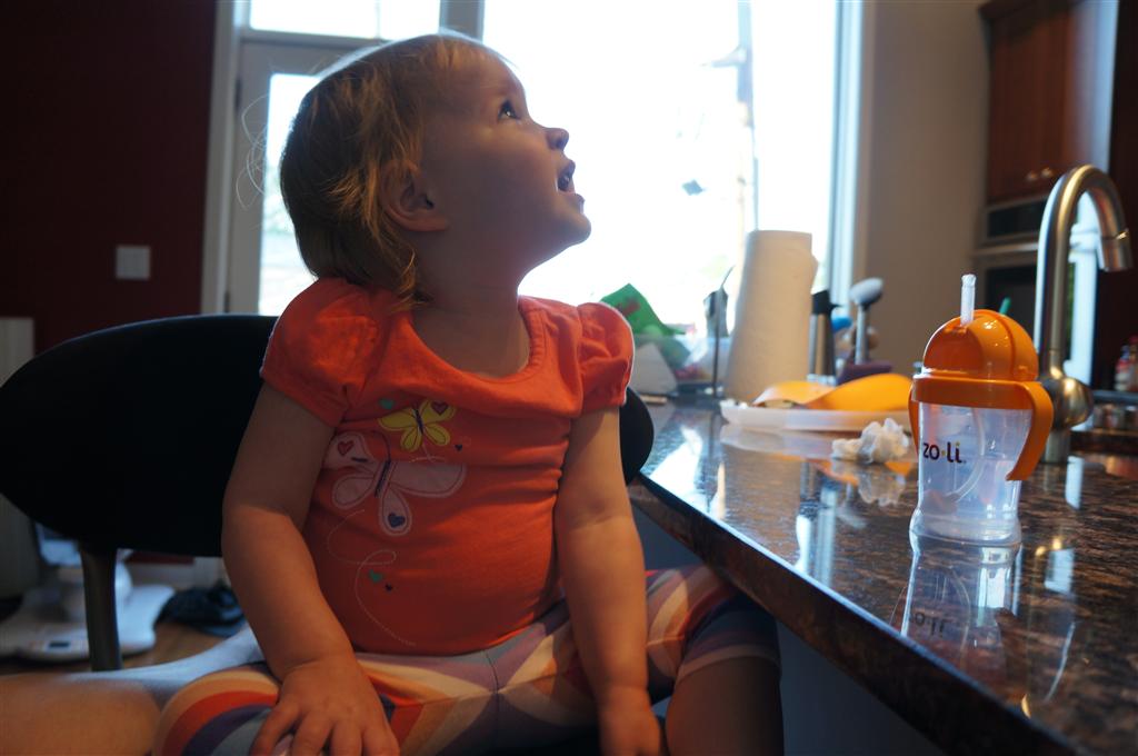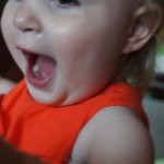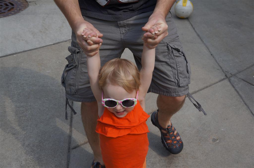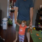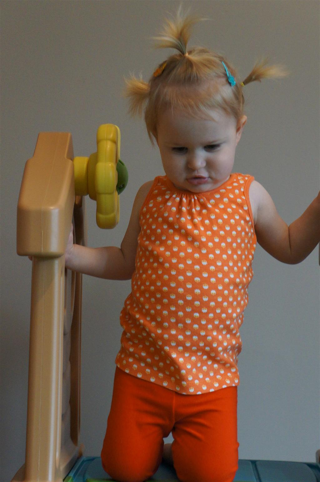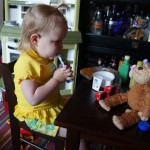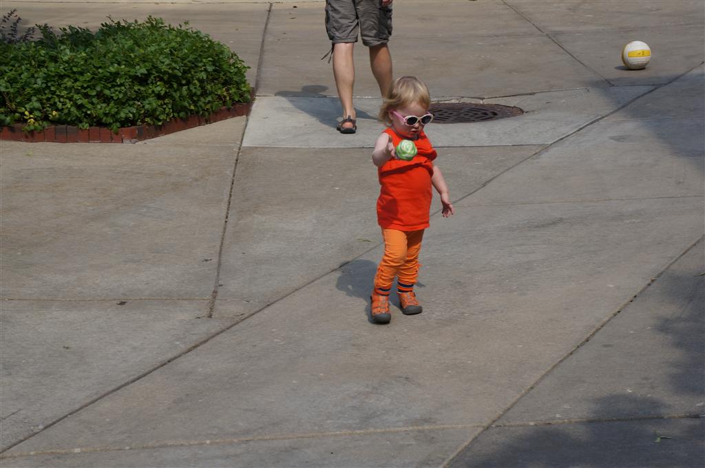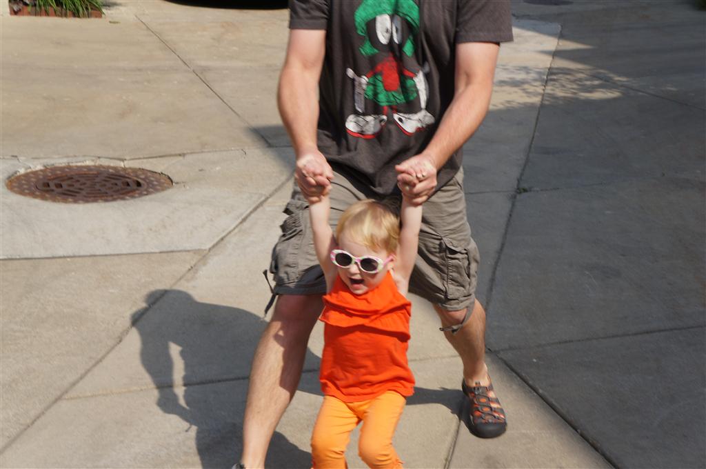 Eleanor has been practicing her alphabet a lot this week – in fact on Friday she was running back forth between the family room and the fridge where her magnet letters are while Mom was making lunch. Mom finally stopped to see what she was up to, and found Eleanor holding the letter E, Monkey sitting on the slide with the letter M next to her, and the letter H on the floor in front on Henry in the jumparoo. Very impressive! Eleanor also conquered a new section of the park this week all by herself, climbing though the maze and finishing on the slide that is intended for the bigger kids. And she has a new tooth coming in, one of her two year molars.
