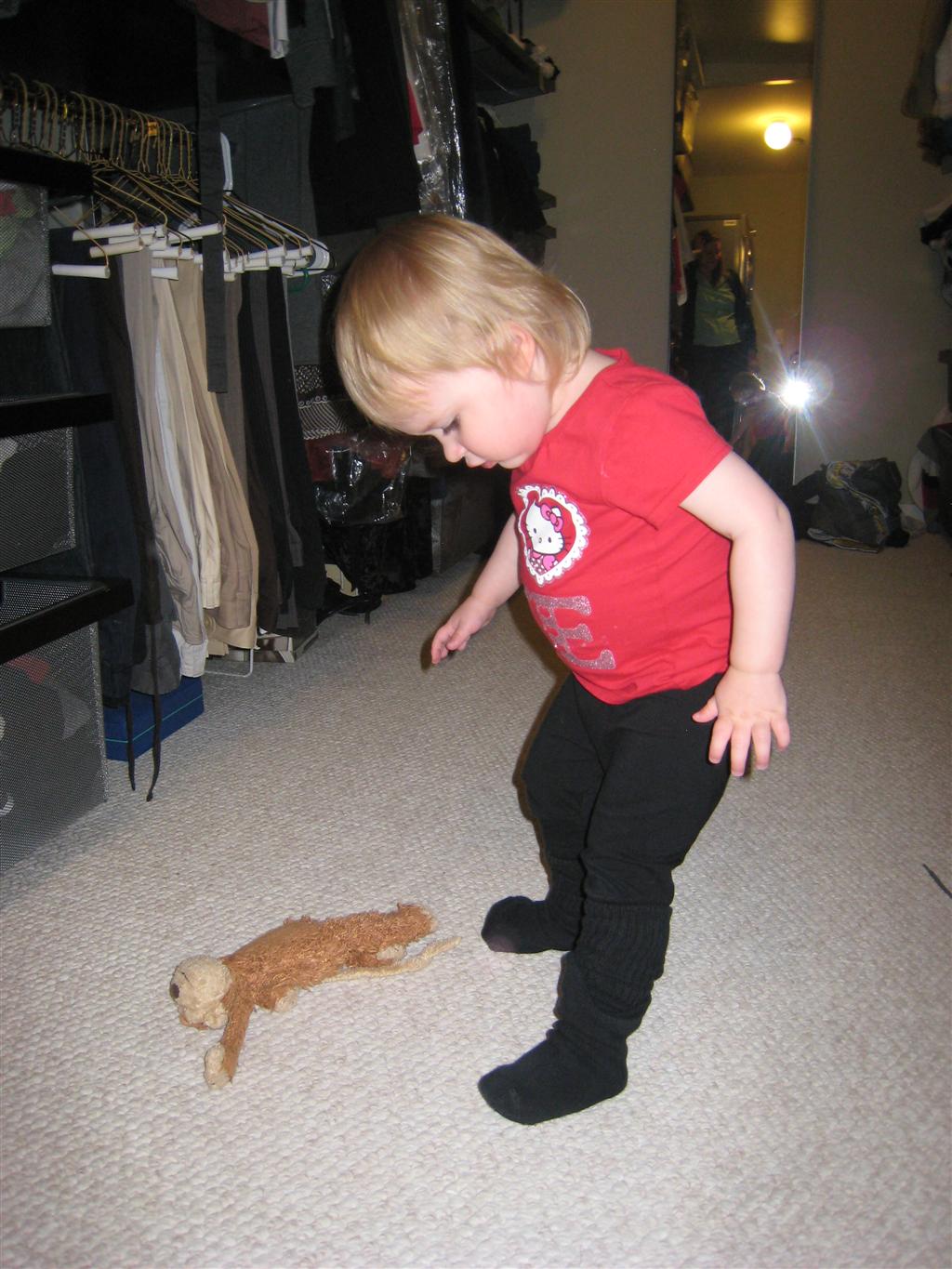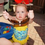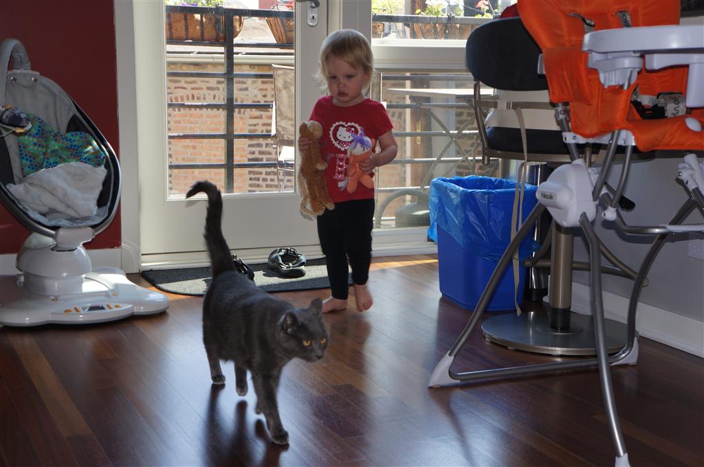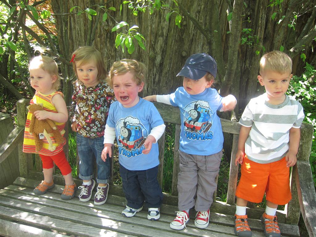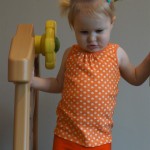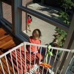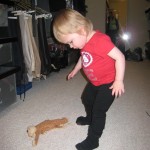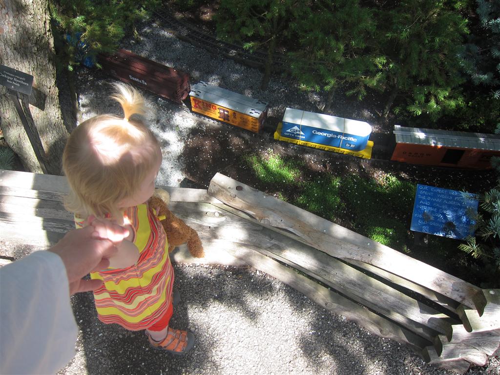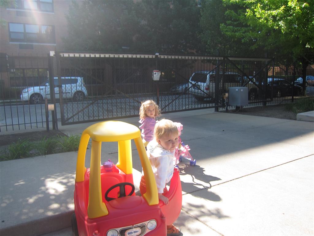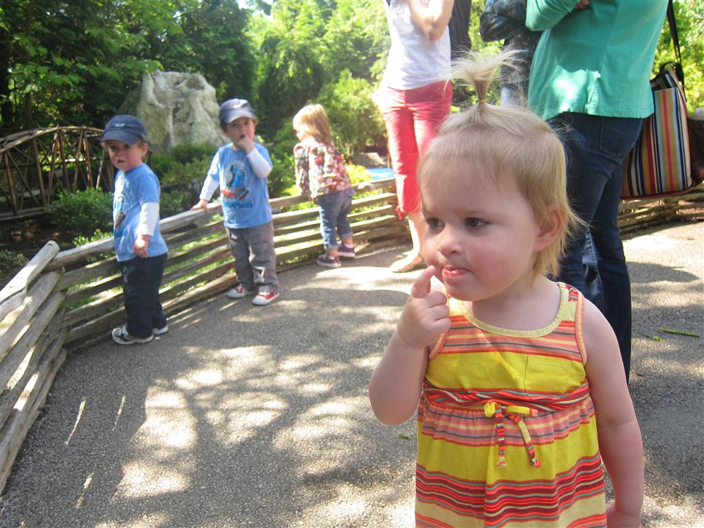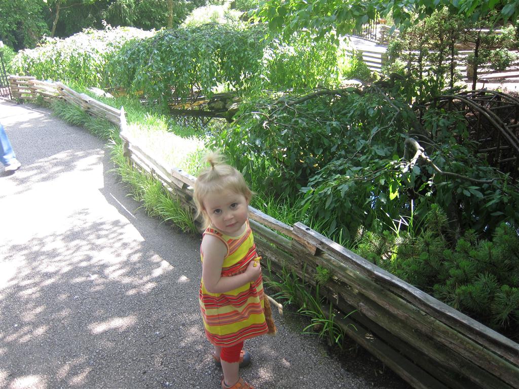 Eleanor has been practicing her alphabet a lot this week – in fact on Friday she was running back forth between the family room and the fridge where her magnet letters are while Mom was making lunch. Mom finally stopped to see what she was up to, and found Eleanor holding the letter E, Monkey sitting on the slide with the letter M next to her, and the letter H on the floor in front on Henry in the jumparoo. Very impressive! Eleanor also conquered a new section of the park this week all by herself, climbing though the maze and finishing on the slide that is intended for the bigger kids. And she has a new tooth coming in, one of her two year molars.