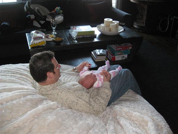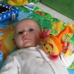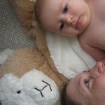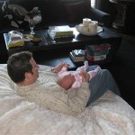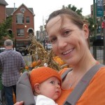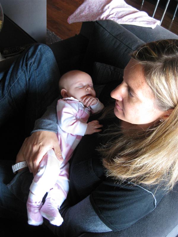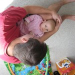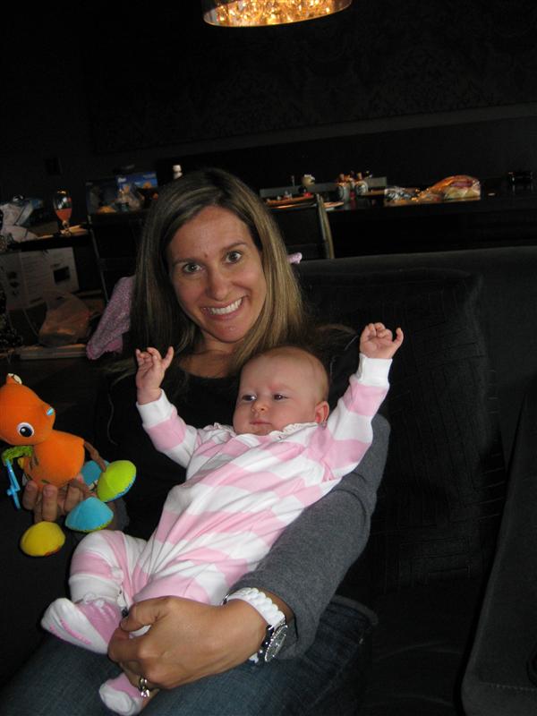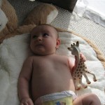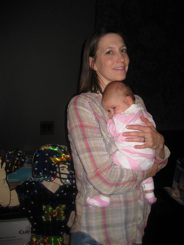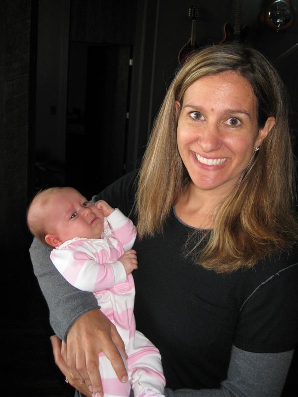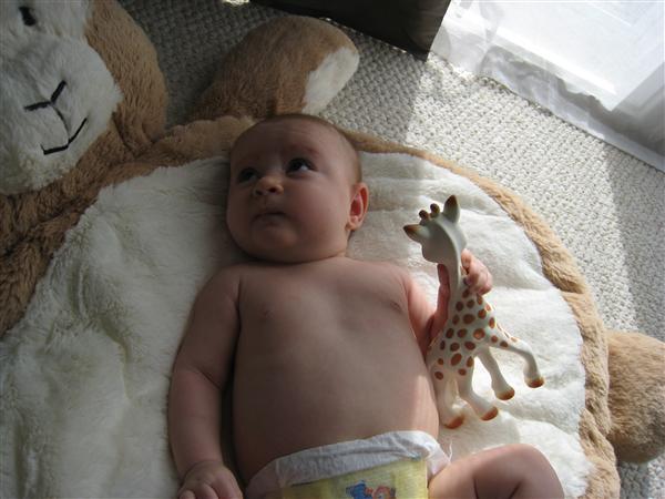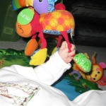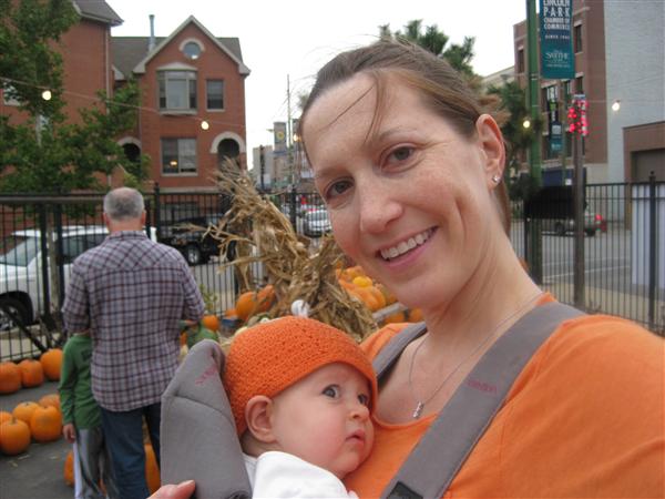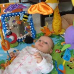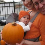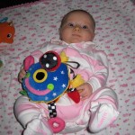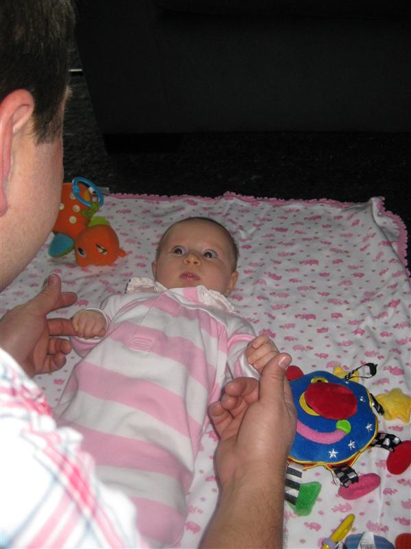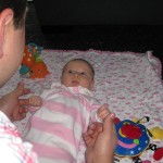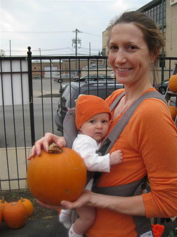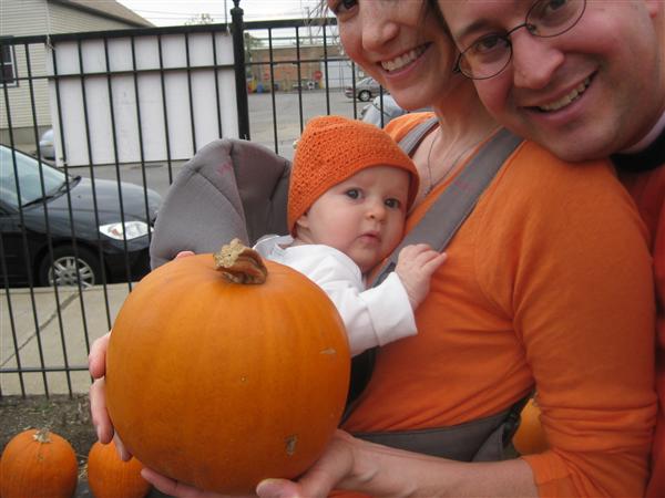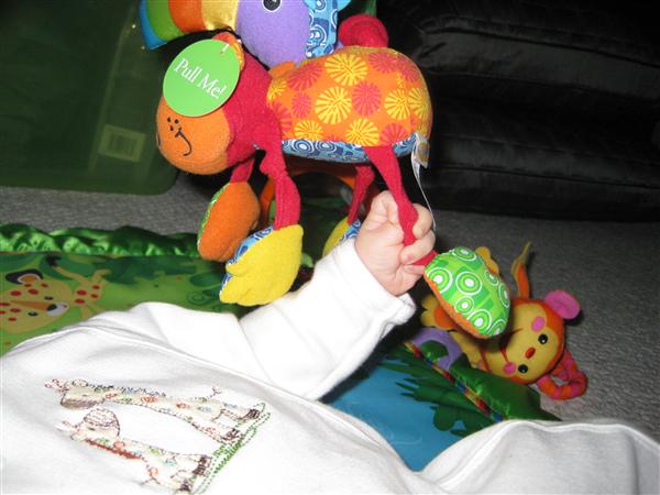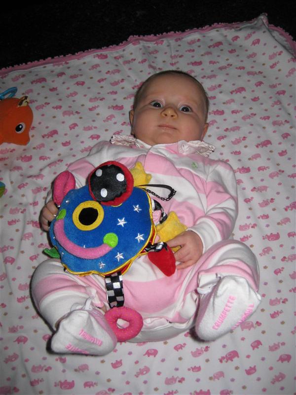 This week’s highlight was a visit from Auntie Susan and Uncle Gabe. This was Gabe’s first chance to meet Eleanor, and Aunt Susan hasn’t seen her since day 3. Friday we had dinner and celebrated Aunt Lary’s birthday. We spent Saturday grilling and watching football at Uncle B’s, and ended with a wild game of Scategories. Earlier in the week, we were working on our hand skills, grabbing a monkey and a butterfly from our playmat. We closed out the week with a visit to the local pumpkin patch to pick out a few pumpkins for the Halloween.