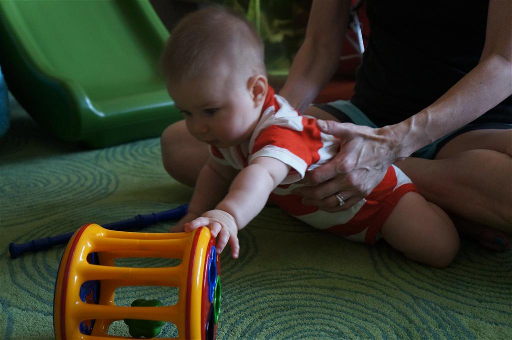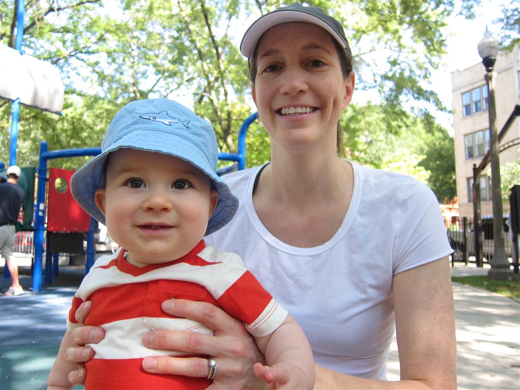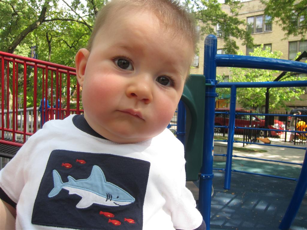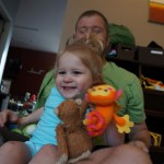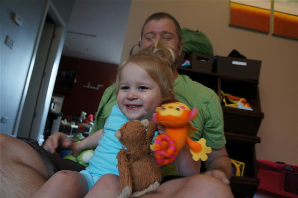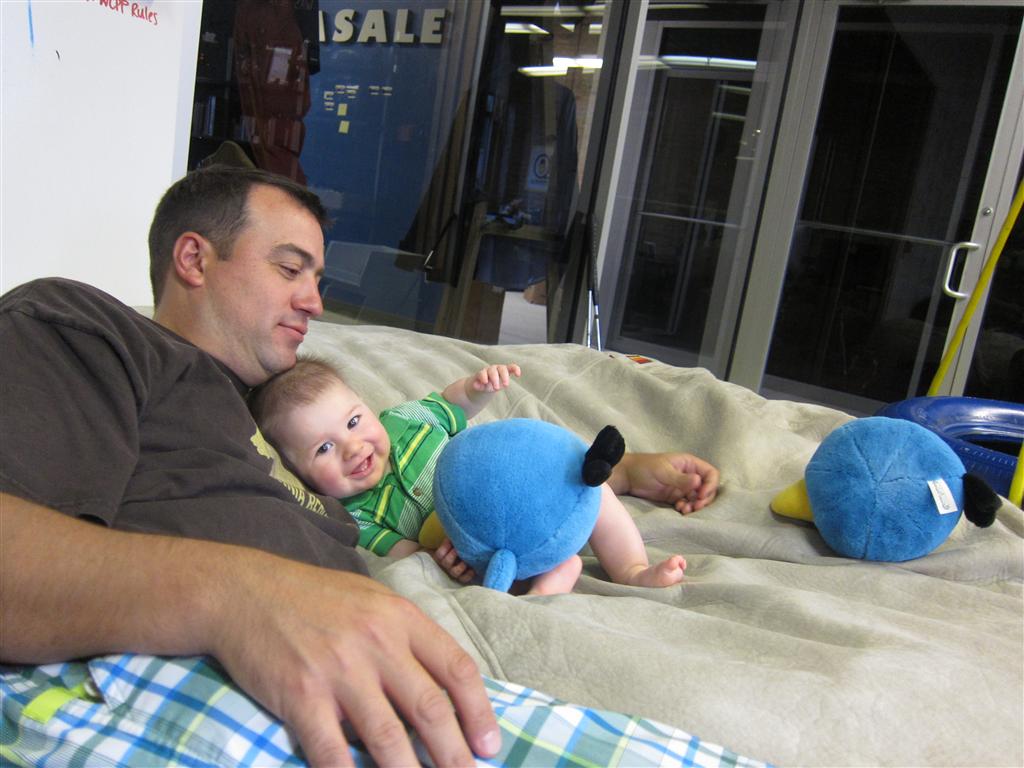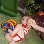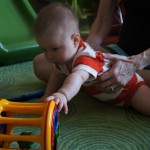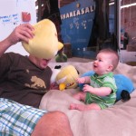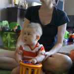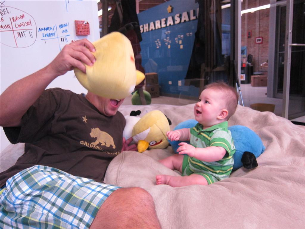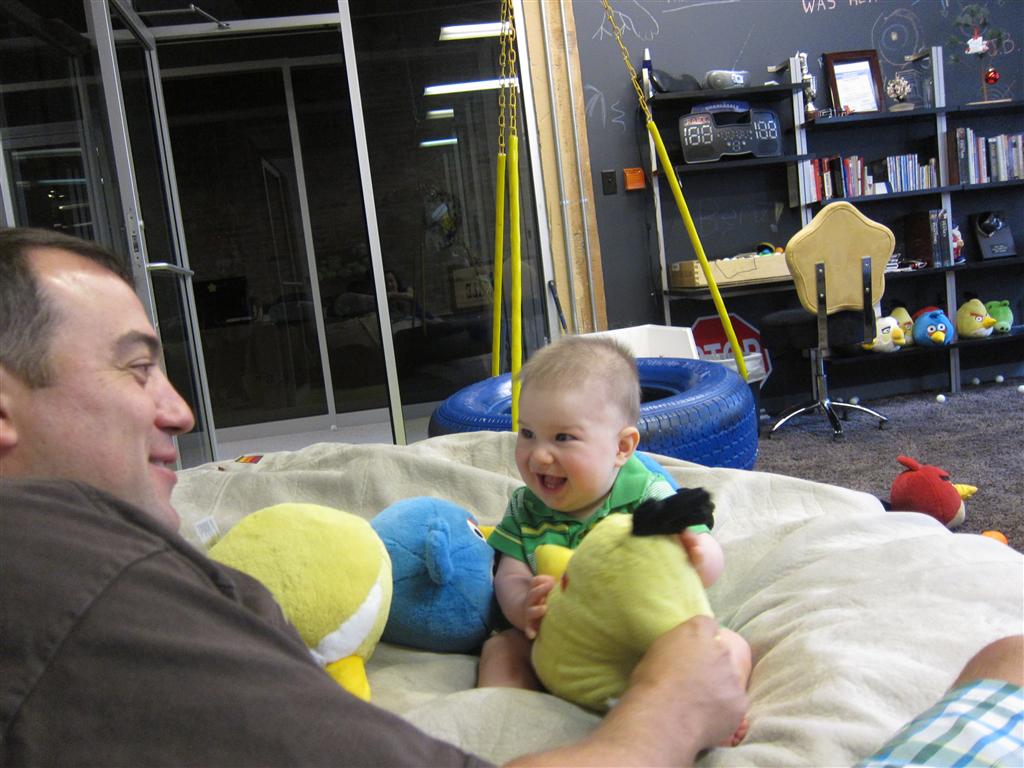Eleanor and Henry had a fun week trying to beat the late July heat. Our park trips were a bit shorter than normal – Henry in particular doesn’t love the heat. Henry’s first top tooth is finally making some progress after several weeks of anticipation. It has now broken through the skin and is just starting to show. His new trick is to imitate Mom’s “kissing face”, and he ends up making a funny sort of fish face. His favorite toys are currently the maraca and the bell and the train. He is really reaching for toys that he wants now, but hasn’t quite managed to roll over from back to tummy. He gets about half way around and gets stuck. His sitting is excellent – he can stay sitting indefinitely, with only the occasional face plants or back splats. Henry really enjoyed a trip to the office to visit Uncle B – the Angry Birds were a big hit.