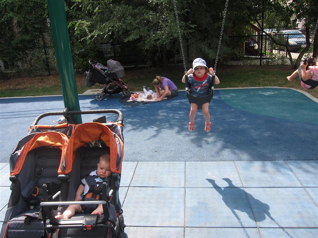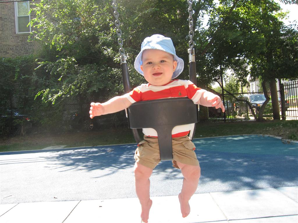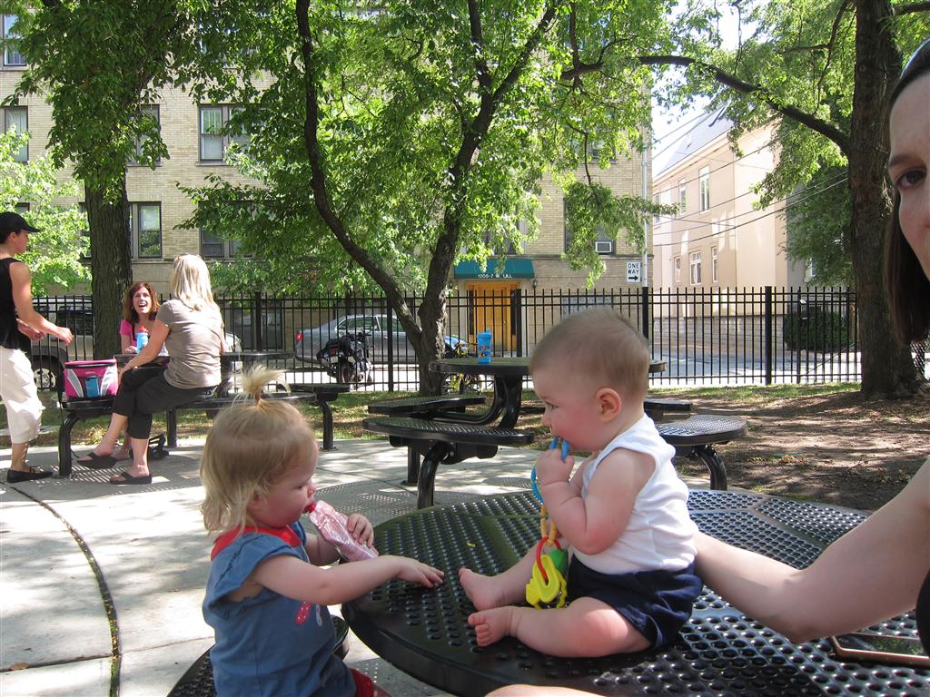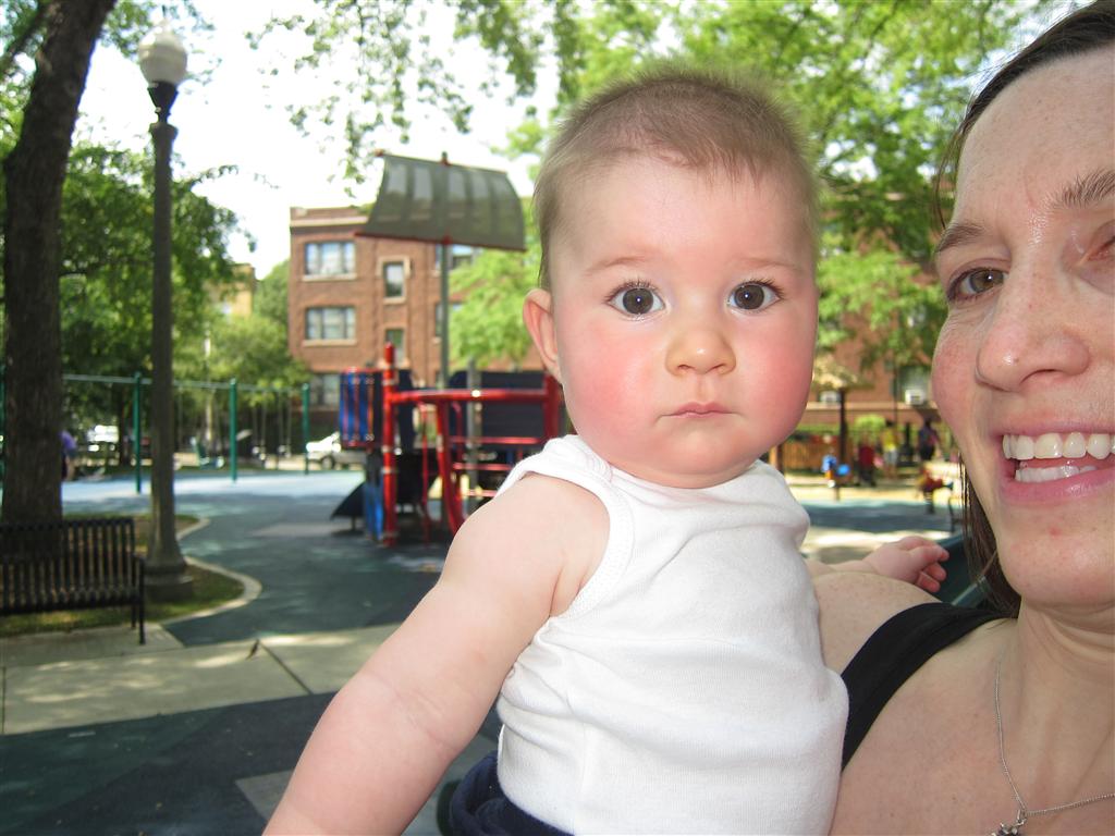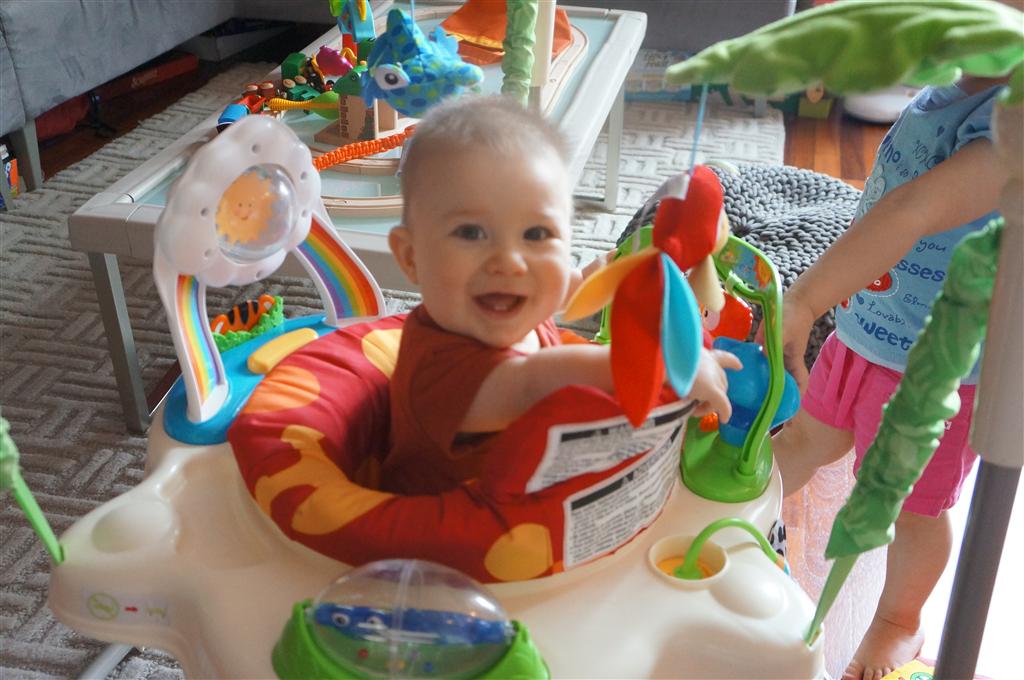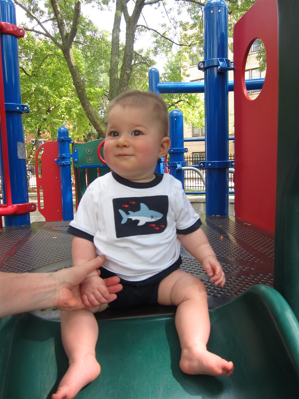 Eleanor and Henry had a fun week trying to beat the late July heat. Our park trips were a bit shorter than normal – Henry in particular doesn’t love the heat. Henry’s first top tooth is finally making some progress after several weeks of anticipation. It has now broken through the skin and is just starting to show. His new trick is to imitate Mom’s “kissing face”, and he ends up making a funny sort of fish face. His favorite toys are currently the maraca and the bell and the train. He is really reaching for toys that he wants now, but hasn’t quite managed to roll over from back to tummy. He gets about half way around and gets stuck. His sitting is excellent – he can stay sitting indefinitely, with only the occasional face plants or back splats. Henry really enjoyed a trip to the office to visit Uncle B – the Angry Birds were a big hit.