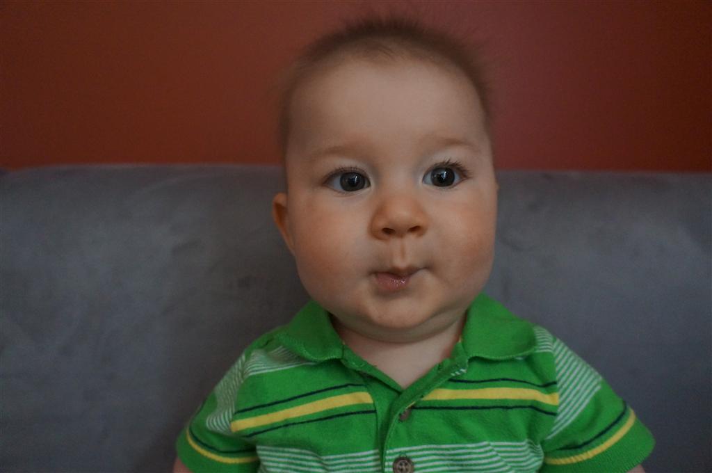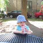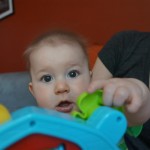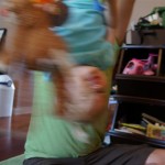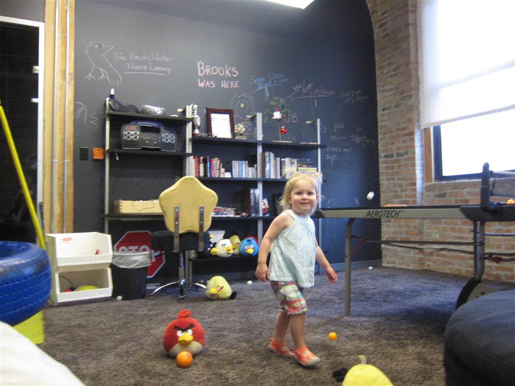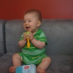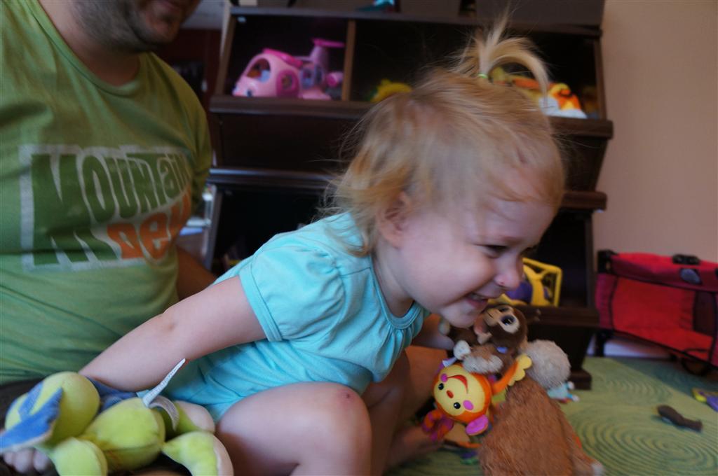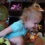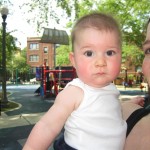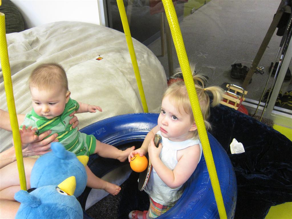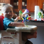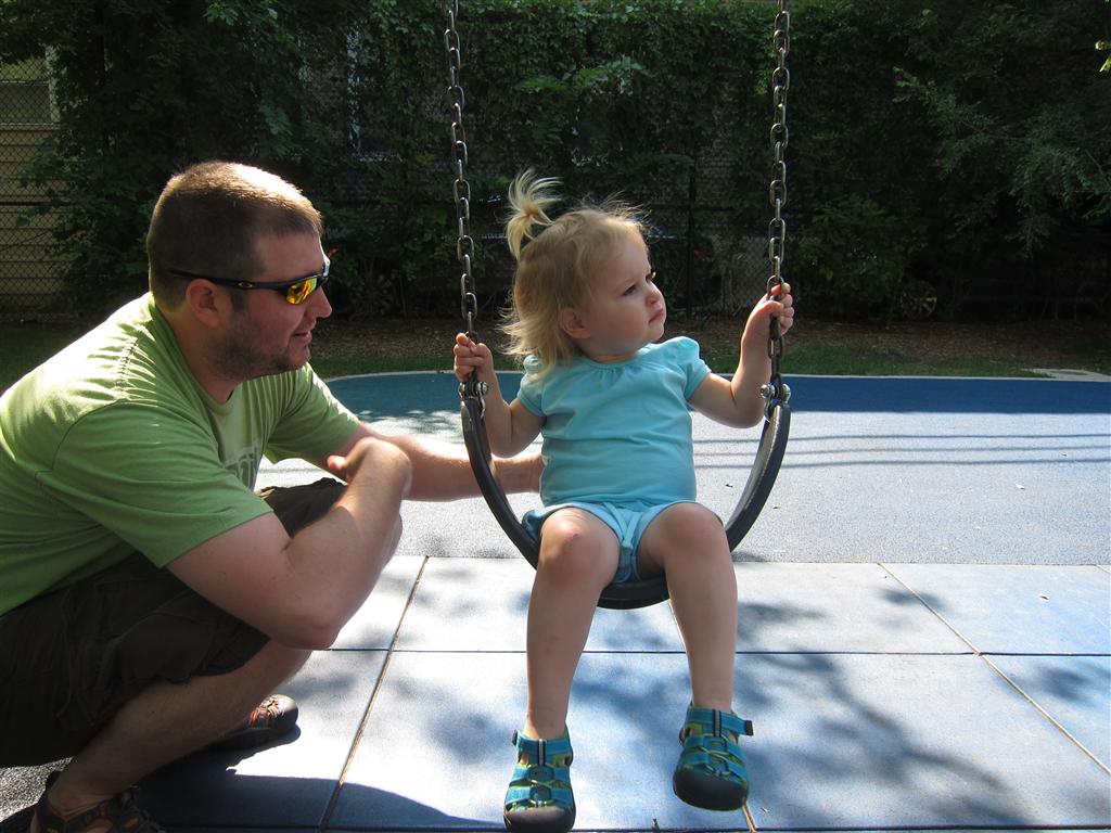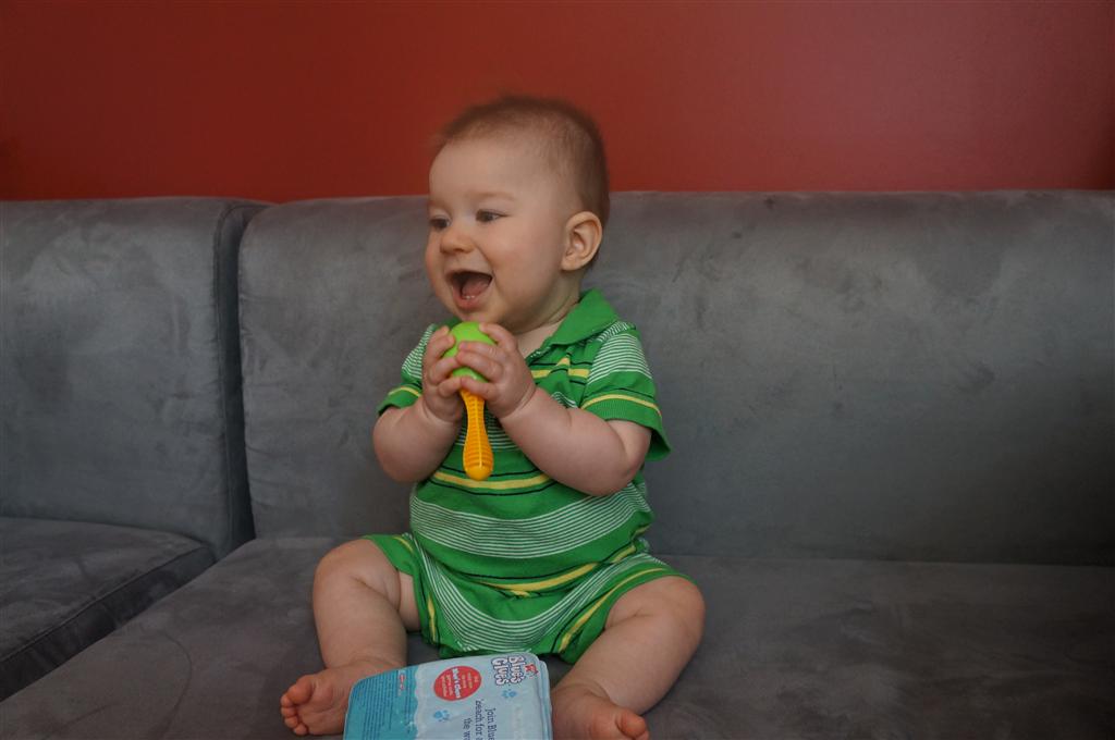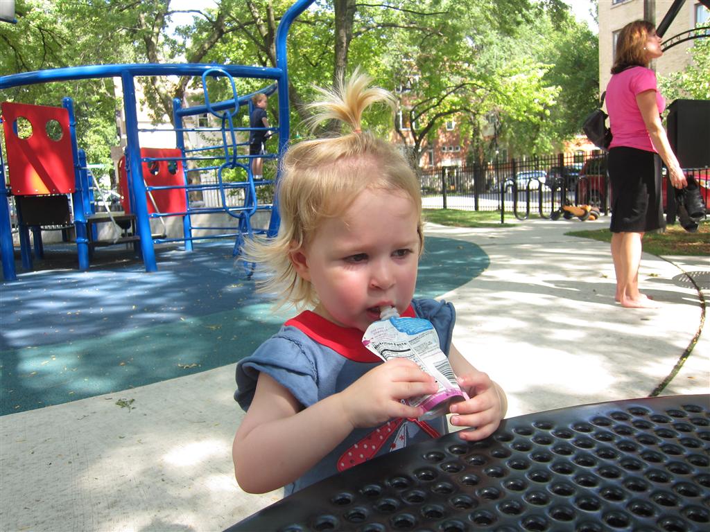 Eleanor and Henry had a fun week trying to beat the late July heat. Our park trips were a bit shorter than normal – Henry in particular doesn’t love the heat. Henry’s first top tooth is finally making some progress after several weeks of anticipation. It has now broken through the skin and is just starting to show. His new trick is to imitate Mom’s “kissing face”, and he ends up making a funny sort of fish face. His favorite toys are currently the maraca and the bell and the train. He is really reaching for toys that he wants now, but hasn’t quite managed to roll over from back to tummy. He gets about half way around and gets stuck. His sitting is excellent – he can stay sitting indefinitely, with only the occasional face plants or back splats. Henry really enjoyed a trip to the office to visit Uncle B – the Angry Birds were a big hit.