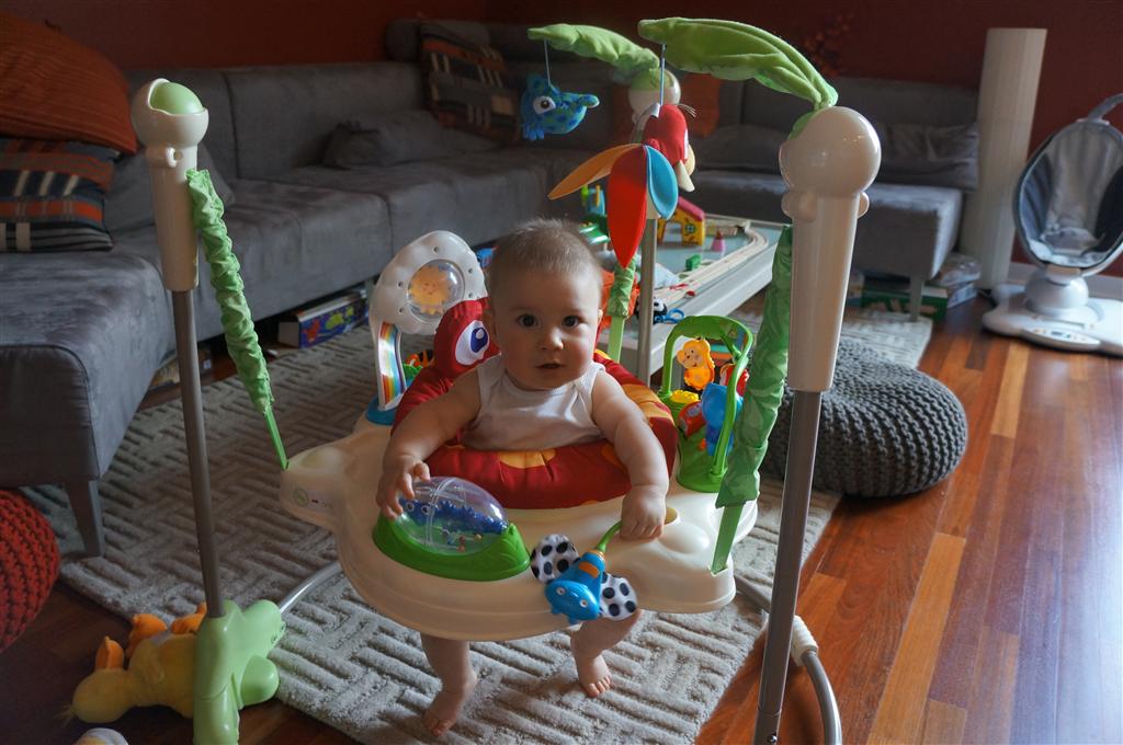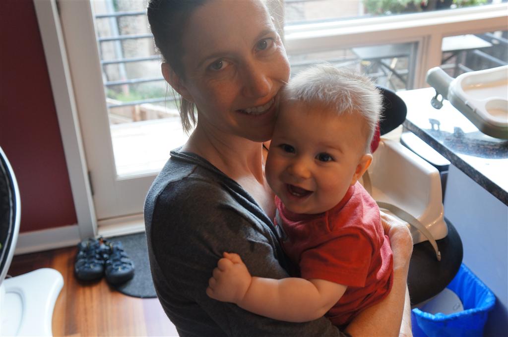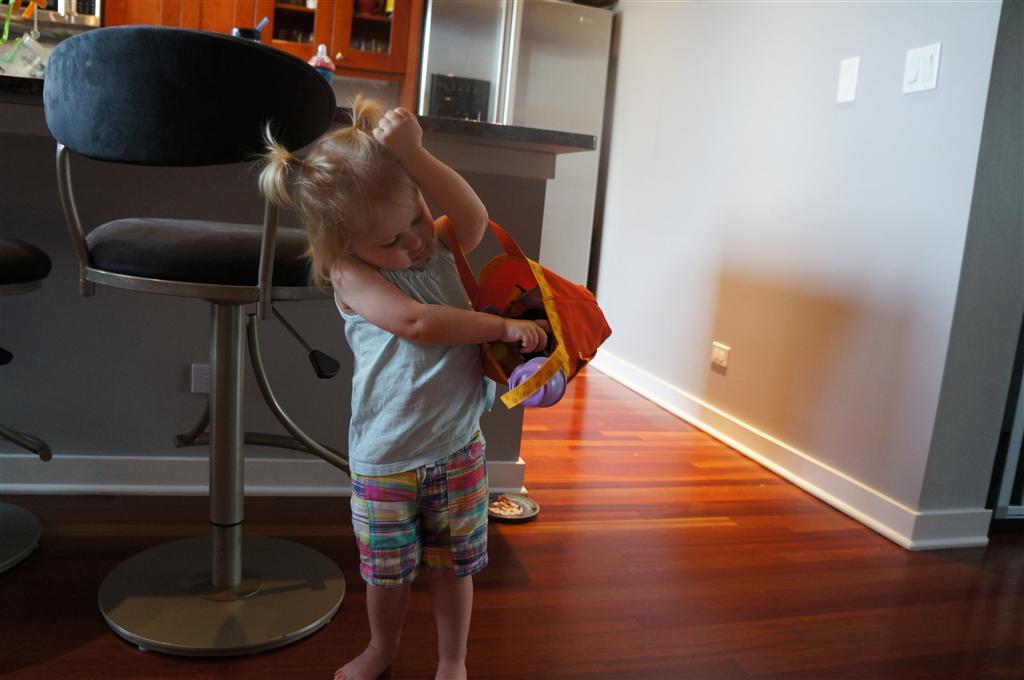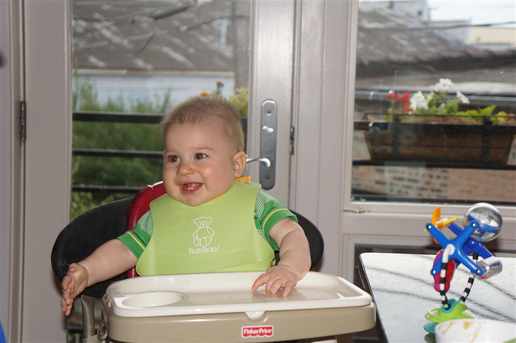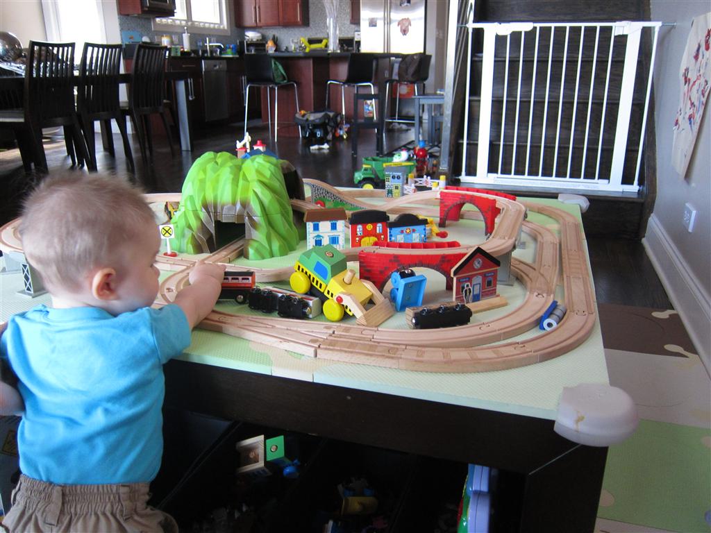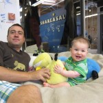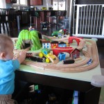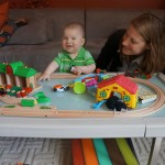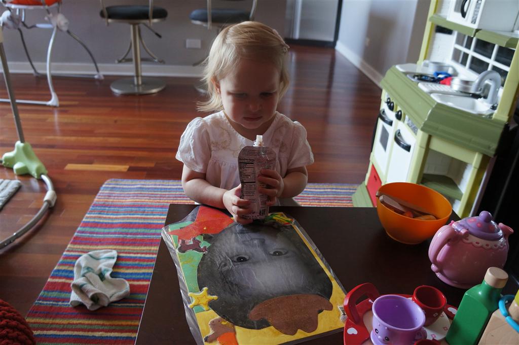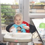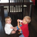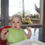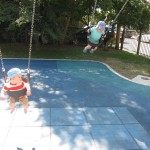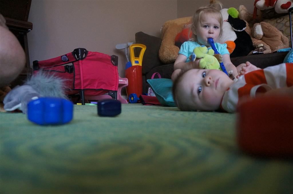 Eleanor and Henry had a fun week trying to beat the late July heat. Our park trips were a bit shorter than normal – Henry in particular doesn’t love the heat. Henry’s first top tooth is finally making some progress after several weeks of anticipation. It has now broken through the skin and is just starting to show. His new trick is to imitate Mom’s “kissing face”, and he ends up making a funny sort of fish face. His favorite toys are currently the maraca and the bell and the train. He is really reaching for toys that he wants now, but hasn’t quite managed to roll over from back to tummy. He gets about half way around and gets stuck. His sitting is excellent – he can stay sitting indefinitely, with only the occasional face plants or back splats. Henry really enjoyed a trip to the office to visit Uncle B – the Angry Birds were a big hit.