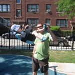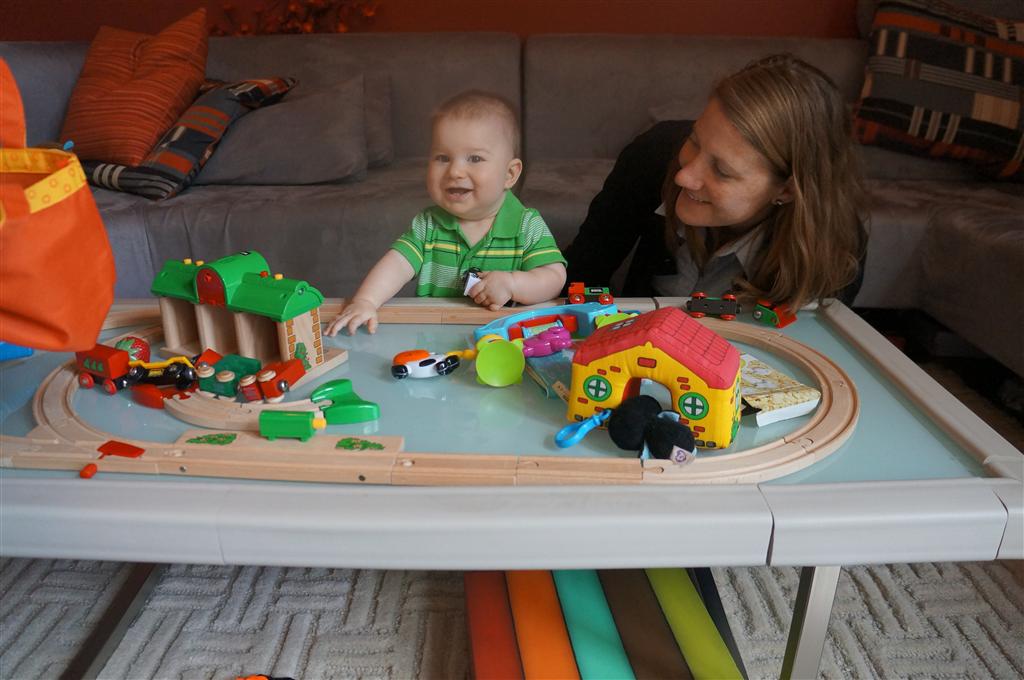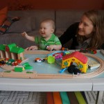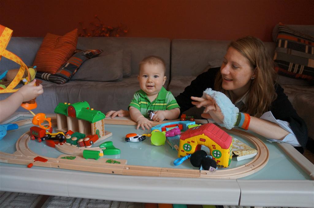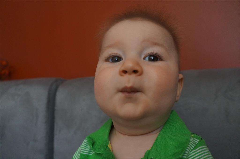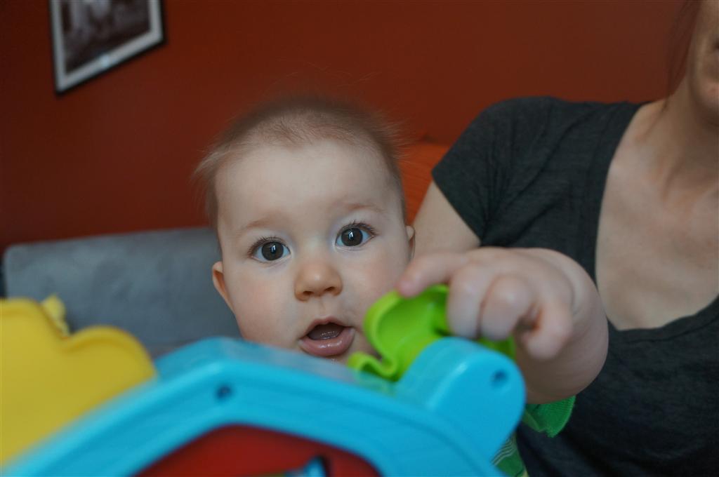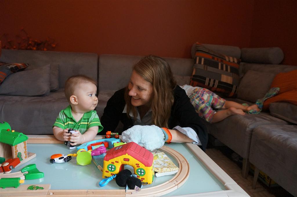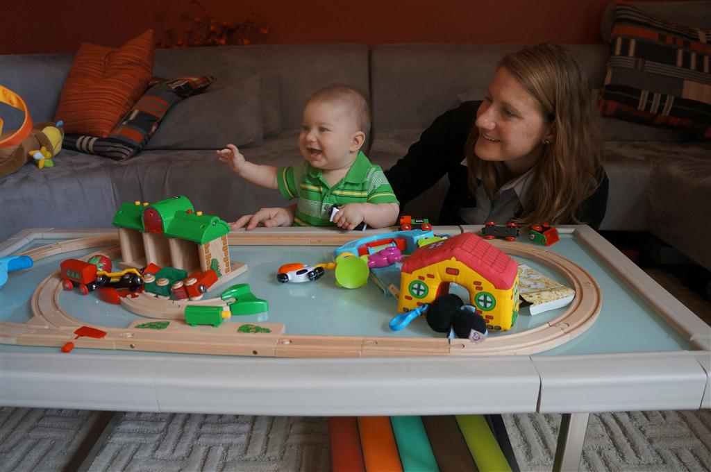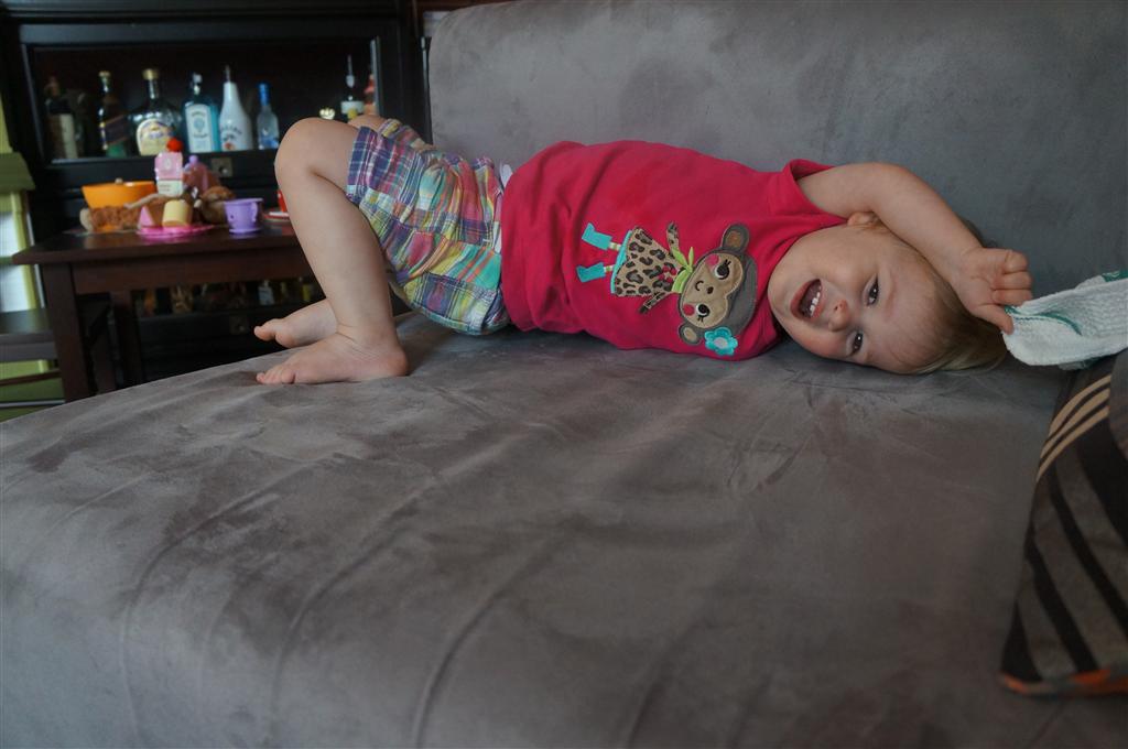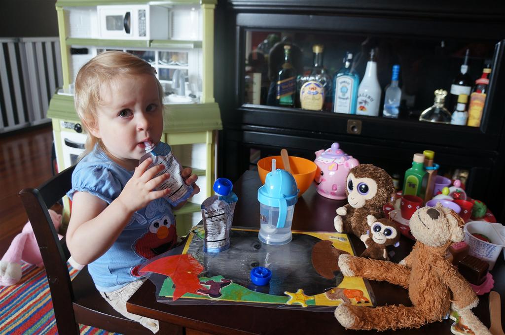 Eleanor and Henry had a fun week trying to beat the late July heat. Our park trips were a bit shorter than normal – Henry in particular doesn’t love the heat. Henry’s first top tooth is finally making some progress after several weeks of anticipation. It has now broken through the skin and is just starting to show. His new trick is to imitate Mom’s “kissing face”, and he ends up making a funny sort of fish face. His favorite toys are currently the maraca and the bell and the train. He is really reaching for toys that he wants now, but hasn’t quite managed to roll over from back to tummy. He gets about half way around and gets stuck. His sitting is excellent – he can stay sitting indefinitely, with only the occasional face plants or back splats. Henry really enjoyed a trip to the office to visit Uncle B – the Angry Birds were a big hit.